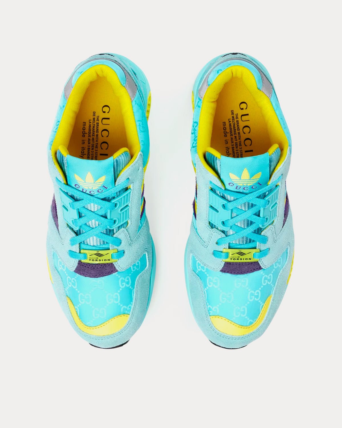 Les Adidas x Gucci ZX8000 pour femme en daim aigue-marine et toile GG arborent les 3 bandes, l’étiquette Gucci Trefoil Torsion et la broderie Gucci Trefoil. Fabriquées en Italie.