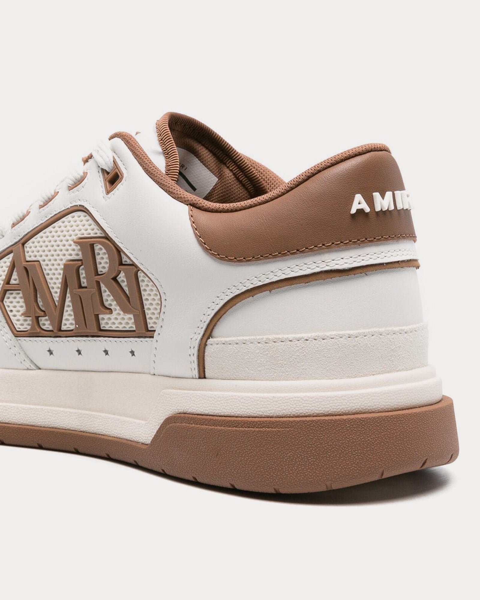 Les baskets basses pour hommes AmiriClassic en blanc et marron s’inspirent des baskets de tennis et présentent des tiges en cuir avec des panneaux centraux en maille de caoutchouc moulé, le logo décalé Amiri avec des perforations en étoile emblématiques et des semelles en caoutchouc bicolores.