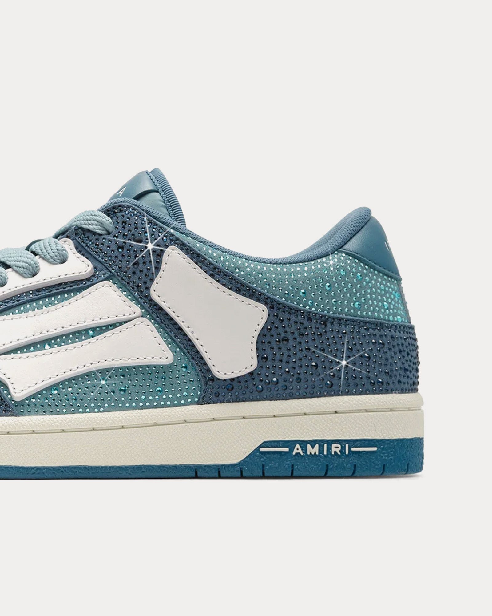 Les baskets basses pour hommes AmiriCrystal Skel-Top en bleu sont fabriquées en cuir et présentent des ornements en cristal sur la tige, avec le logo Amiri sur la partie inférieure des semelles en caoutchouc bicolores.