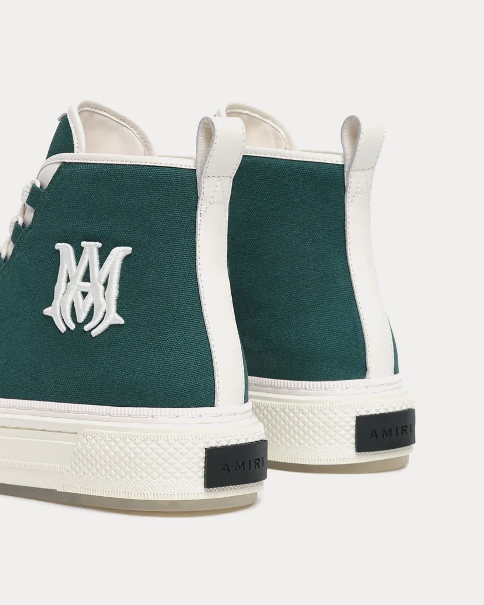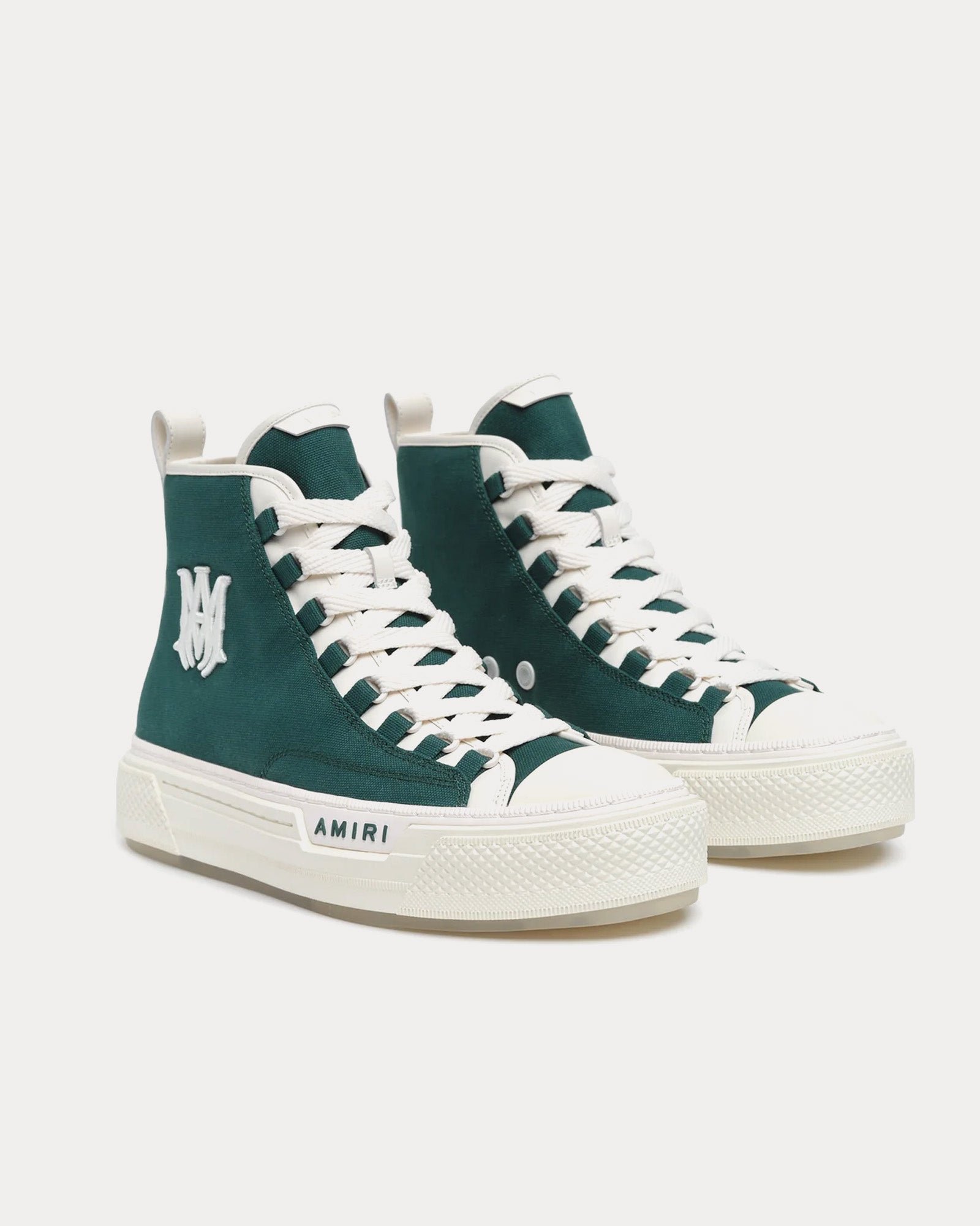 Les baskets montantes pour hommes AmiriMA Court Hi de couleur evergreen sont fabriquées en toile de coton et présentent une tige en toile, des semelles extérieures en caoutchouc moulé à double épaisseur, le logo Amiri sur les côtés et des embouts en caoutchouc.