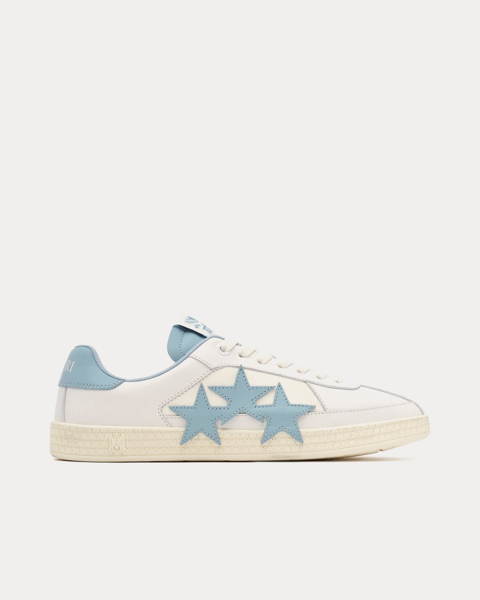 Les baskets basses pour hommes Amiri Pacific en blanc et ciel océan s’inspirent des baskets de course classiques et présentent une tige en cuir, des empiècements en cuir étoilé sur les côtés et des semelles en caoutchouc à motif emblématique MA. Fabriquées en Italie.