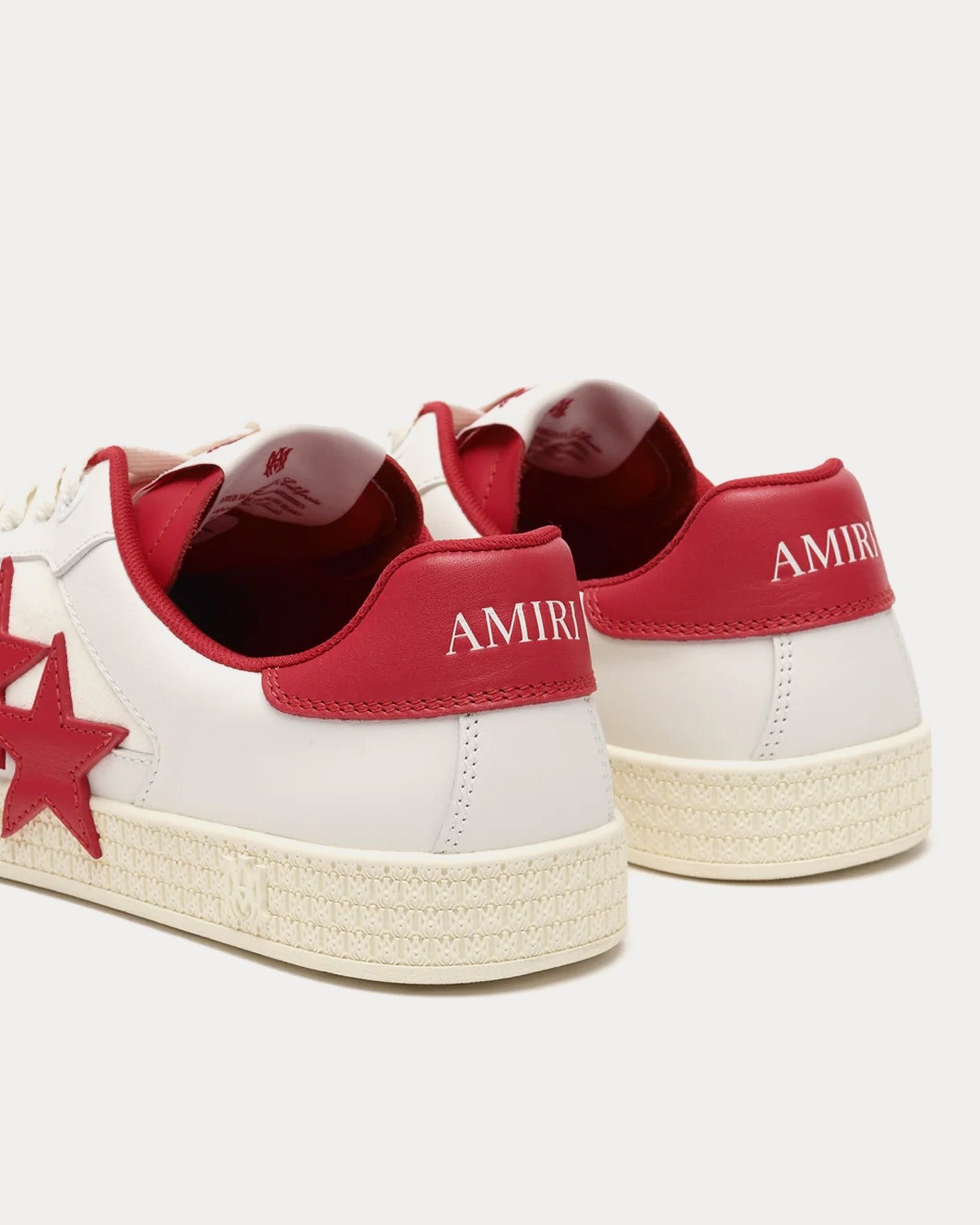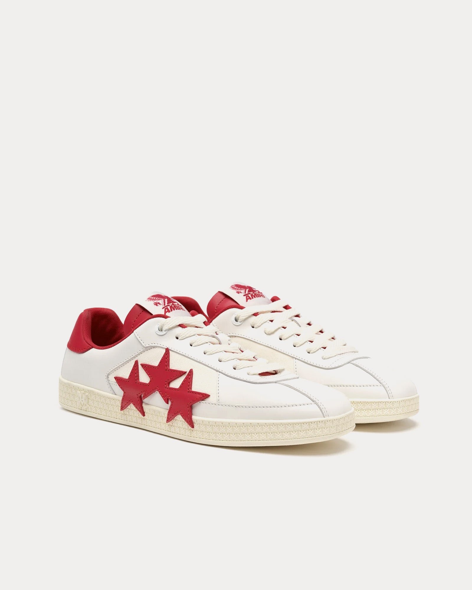 Les baskets basses pour hommes AmiriPacific en blanc et rouge universitaire s’inspirent des baskets de course classiques et présentent une tige en cuir, des empiècements en cuir étoilé sur les côtés et des semelles en caoutchouc à motif emblématique MA. Fabriquées en Italie.