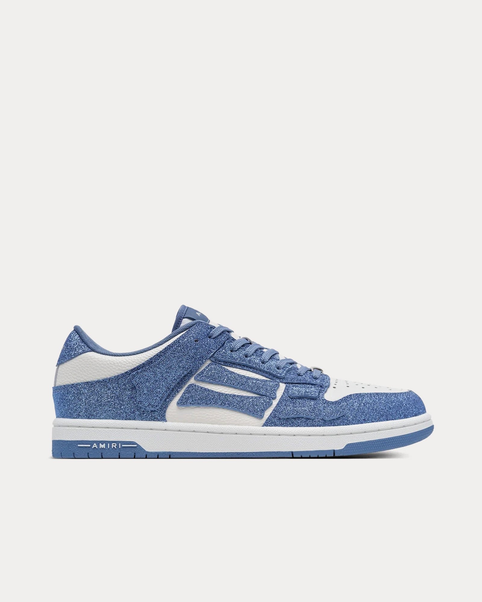 Les baskets basses AmiriShimmer Skel-Top pour hommes, de couleur bleue et blanche, sont fabriquées en cuir et présentent un effet pailleté sur la tige, avec le logo Amiri sur le dessous des semelles en caoutchouc.