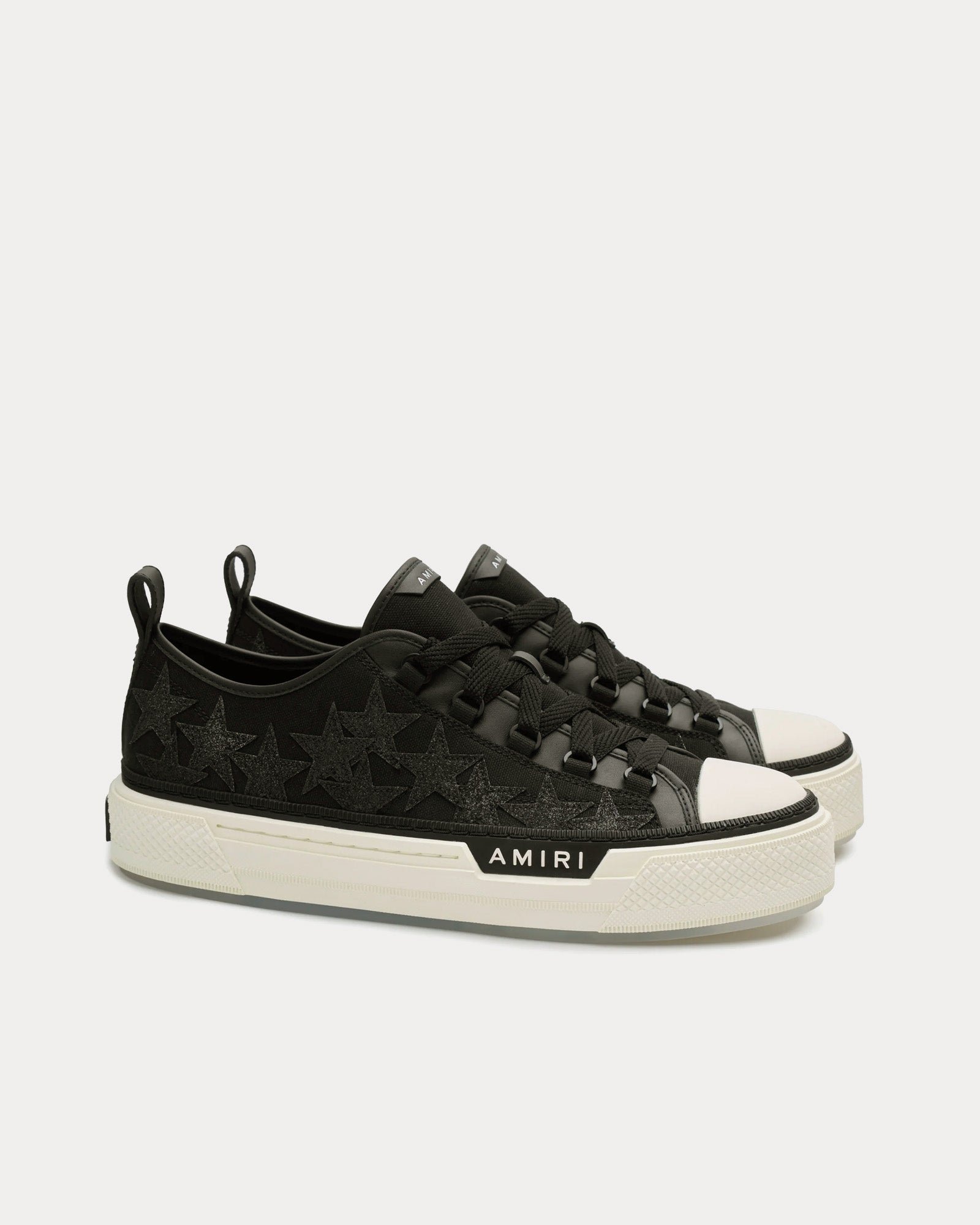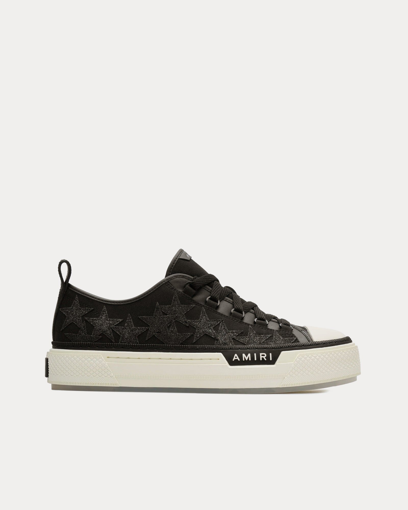 Les baskets basses Amiri Star Court Glitter pour hommes en noir sont fabriquées en toile et présentent des étoiles scintillantes sur la tige et des semelles en caoutchouc avec le logo Amiri sur le côté. Fabriquées en Chine.