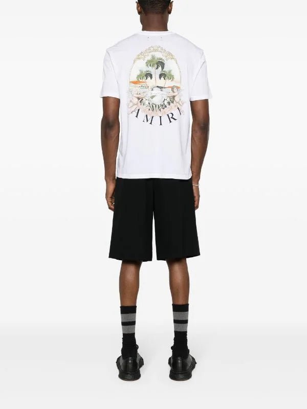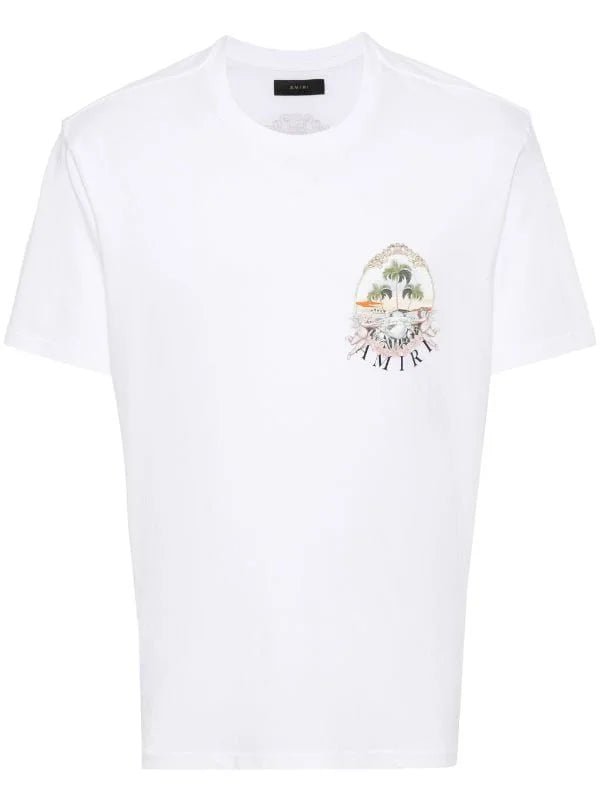 Confectionné en jersey de coton blanc, ce t-shirt arbore l’un des derniers motifs d’AMIRI sur la poitrine. Le symbole représente deux chérubins portant le même nom tenant une bannière devant une île.