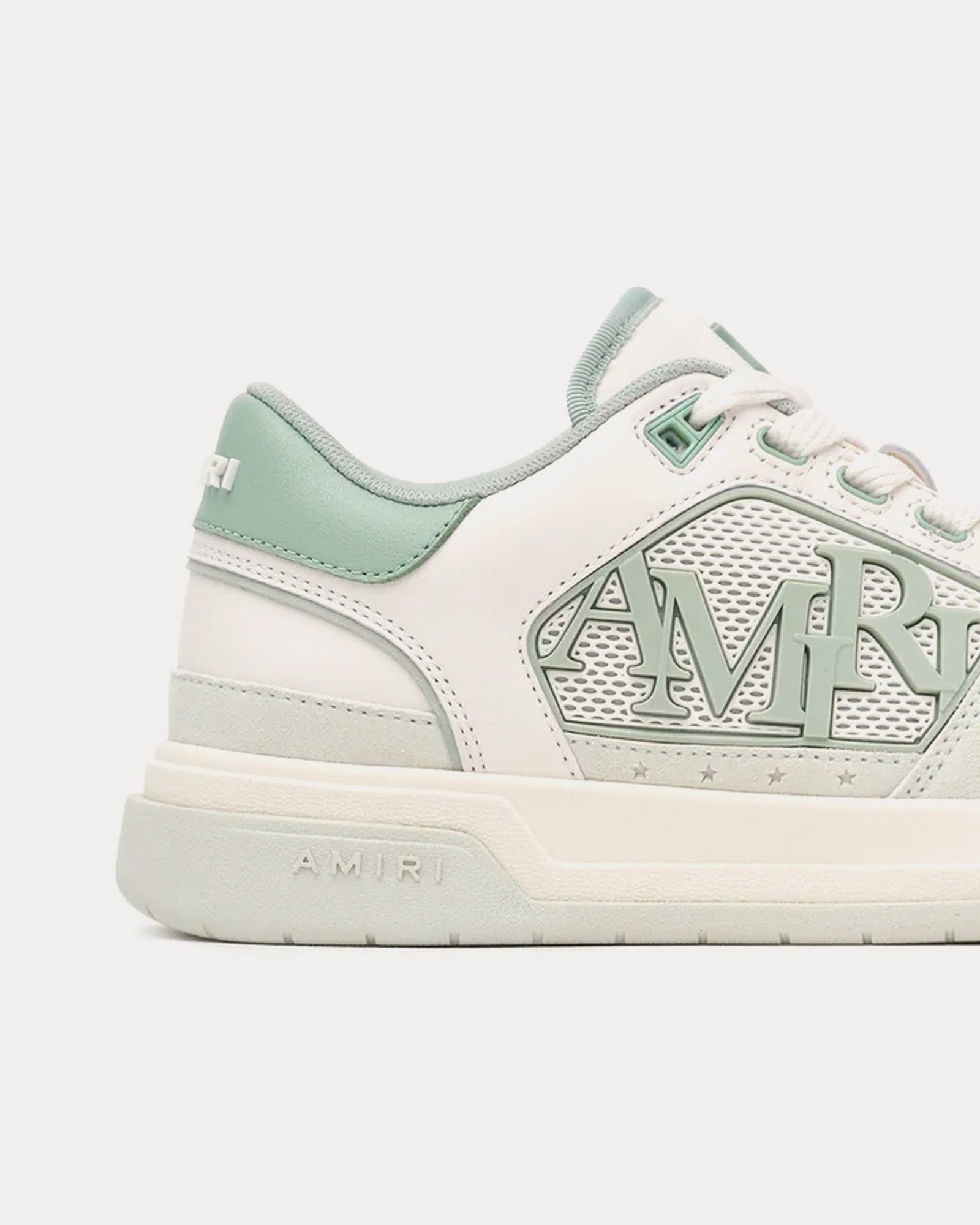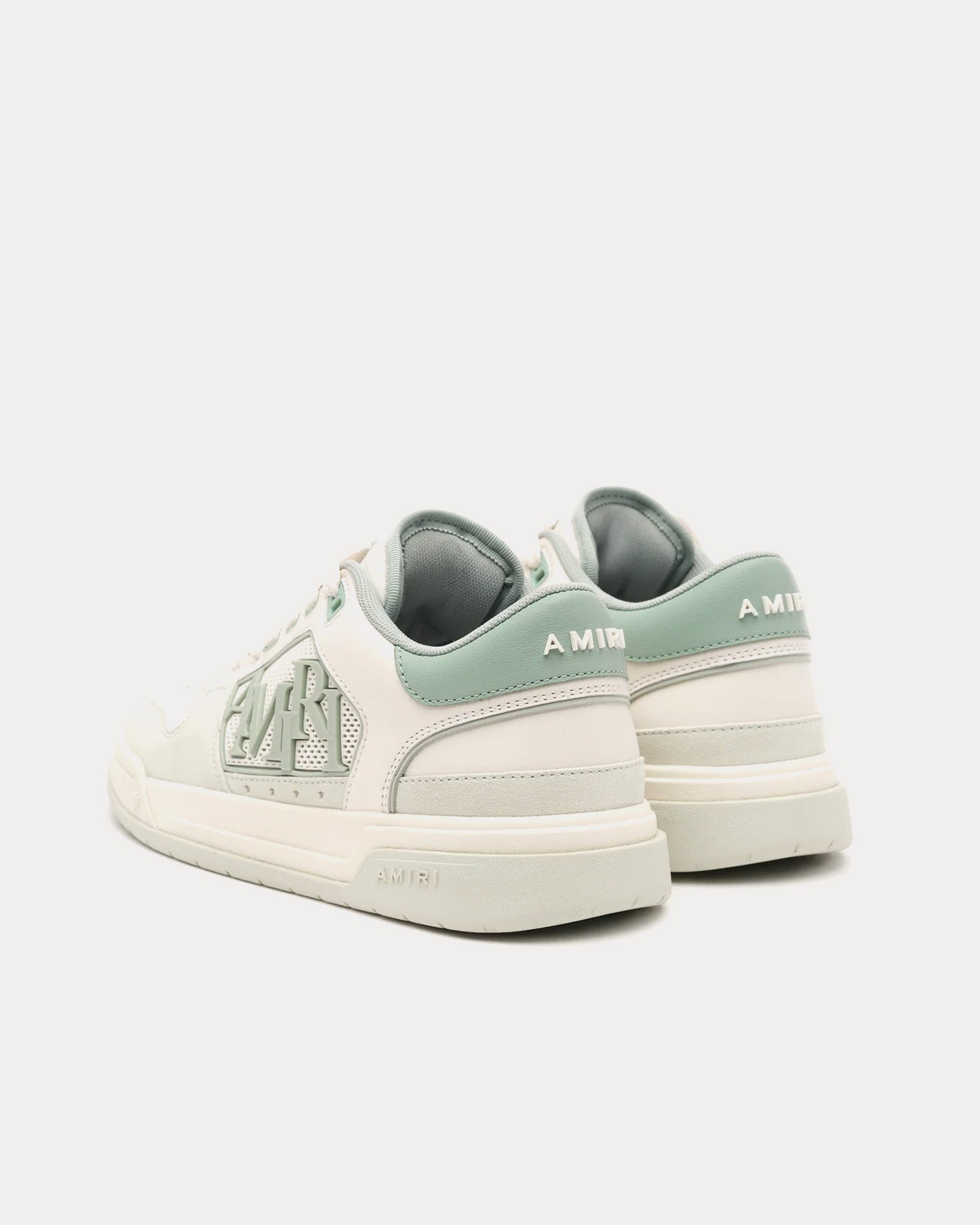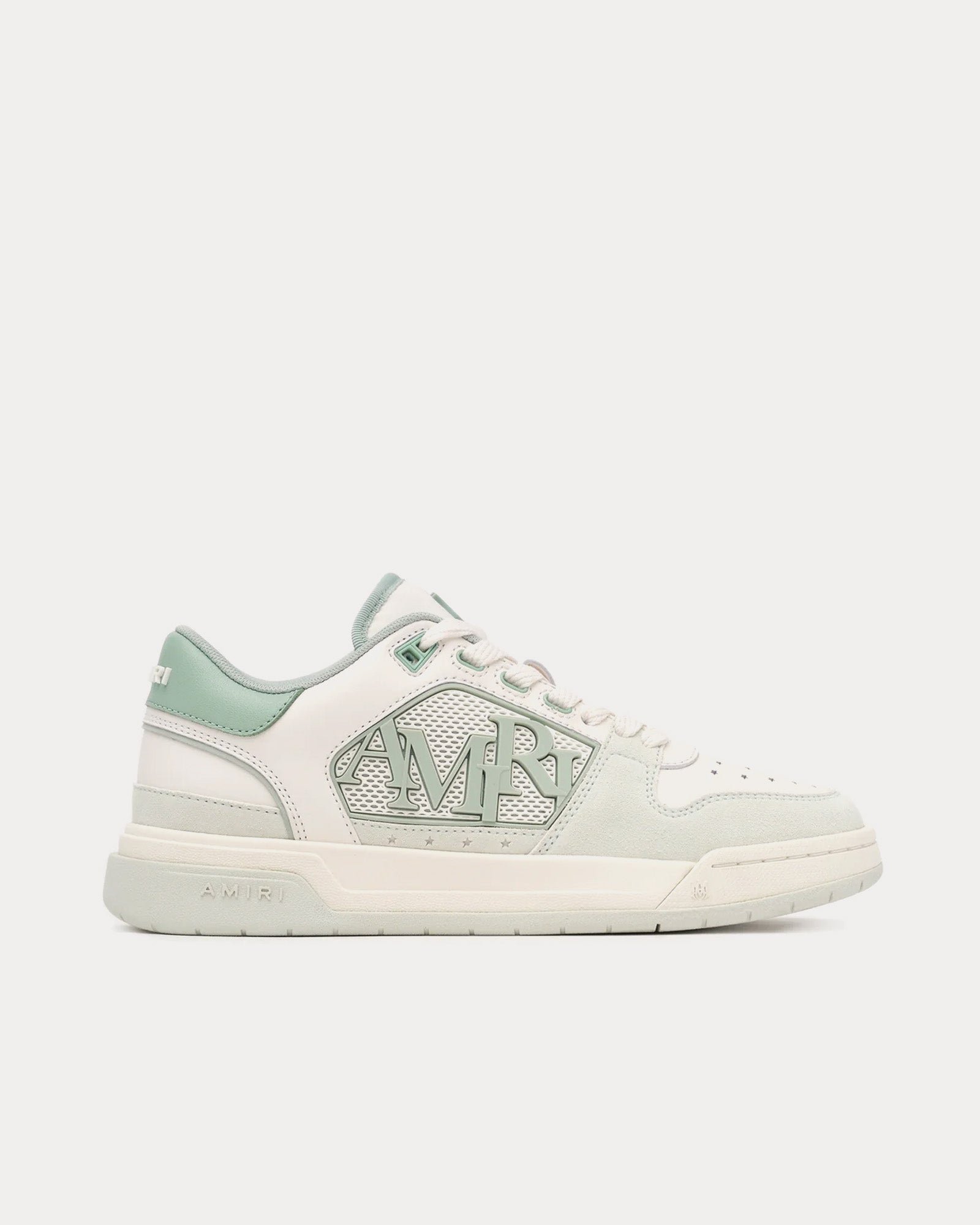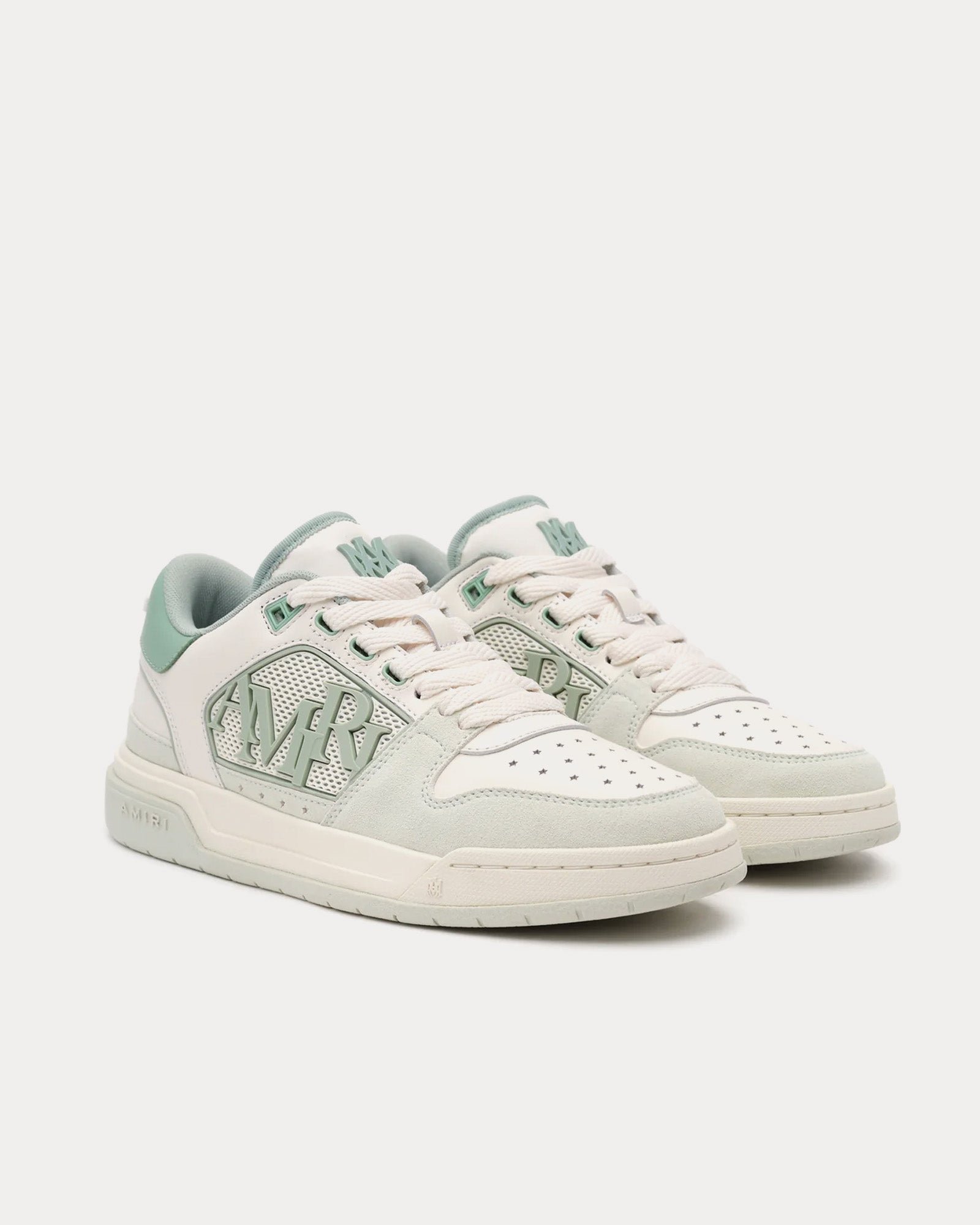 Les baskets basses pour femmes AmiriClassic en vert givré s’inspirent des baskets de tennis et présentent une tige en cuir avec des panneaux centraux en maille de caoutchouc moulée, le logo décalé Amiri avec des perforations en étoile emblématiques et des semelles en caoutchouc bicolores.
