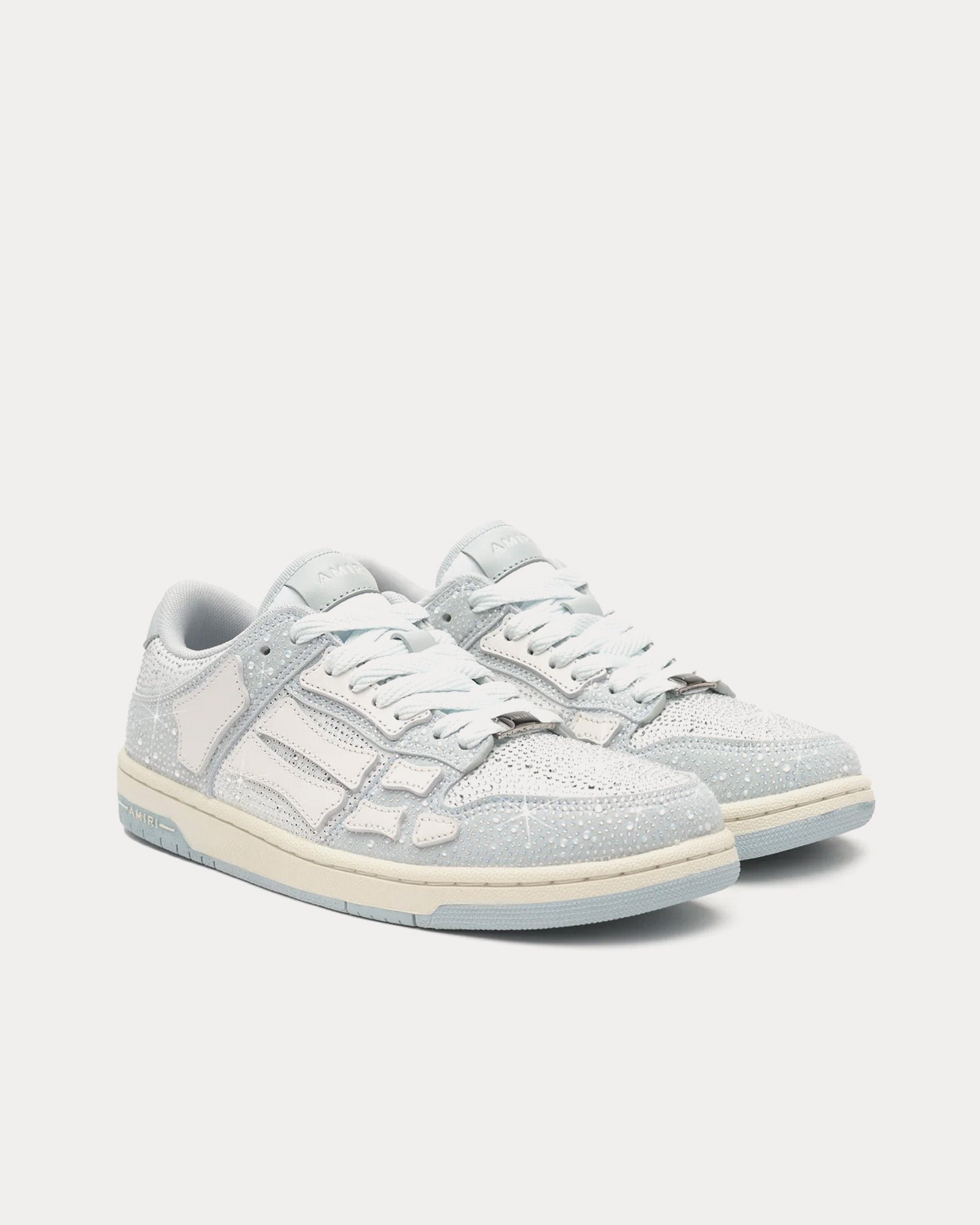 Les baskets basses pour femmes AmiriCrystal Skel-Top de couleur glace sont fabriquées en cuir et présentent des ornements en cristal sur la tige, avec le logo Amiri sur la partie inférieure des semelles en caoutchouc bicolores.