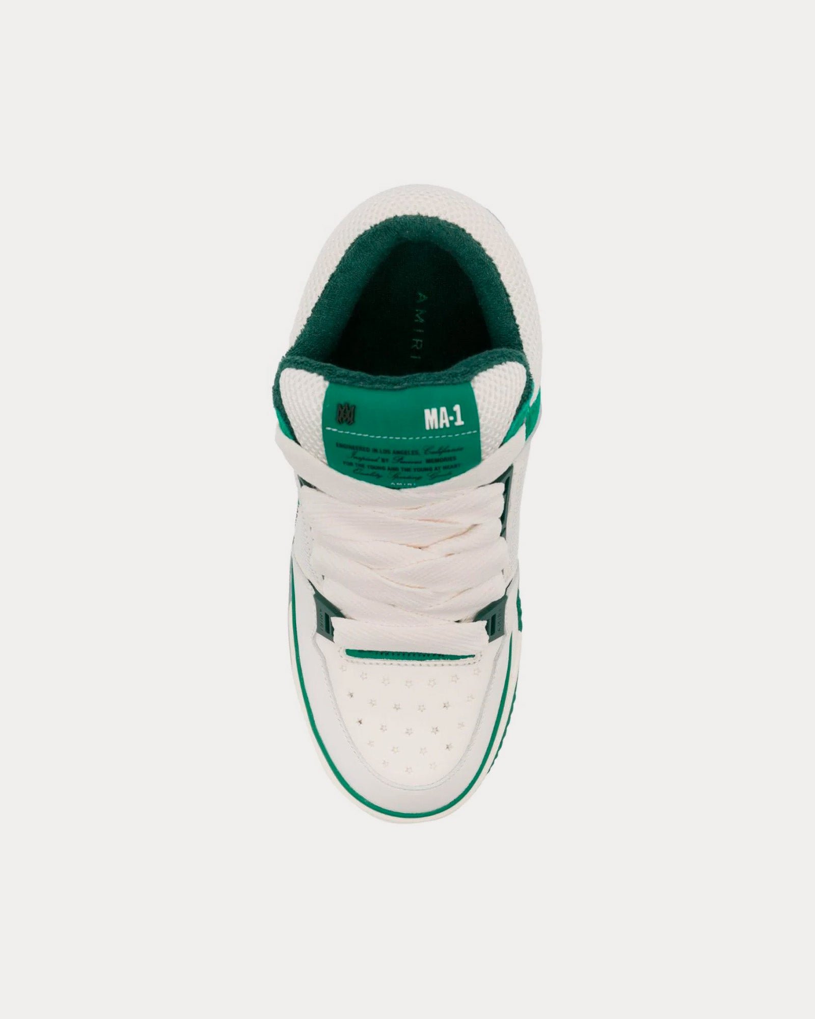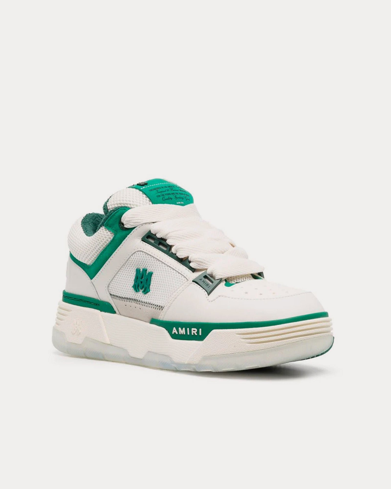 Les baskets basses pour femmes AmiriMA-1 en blanc et vert présentent une tige en nubuck, en mesh et en cuir, le logo Amiri sur le côté et des semelles en caoutchouc. Fabriquées en Chine.