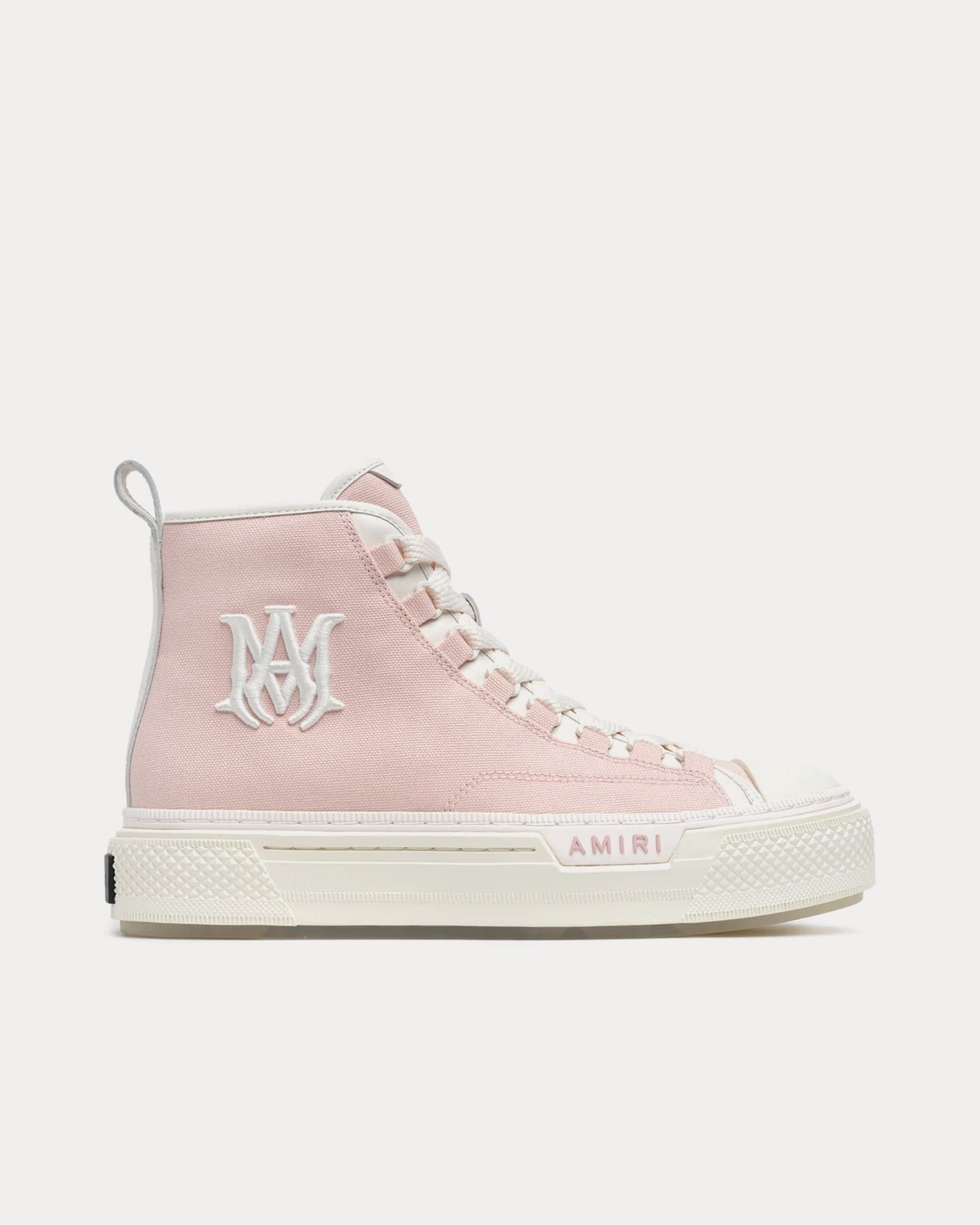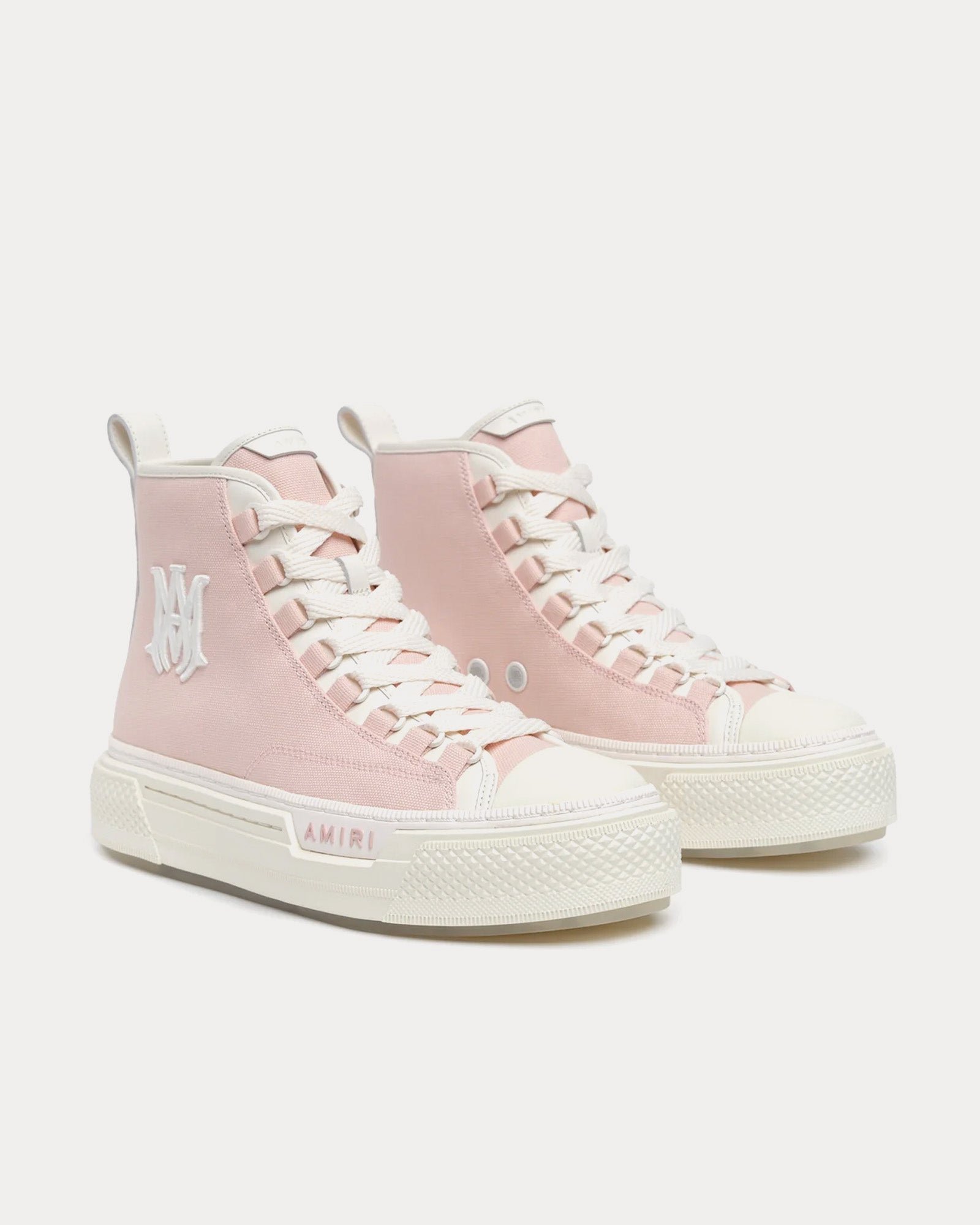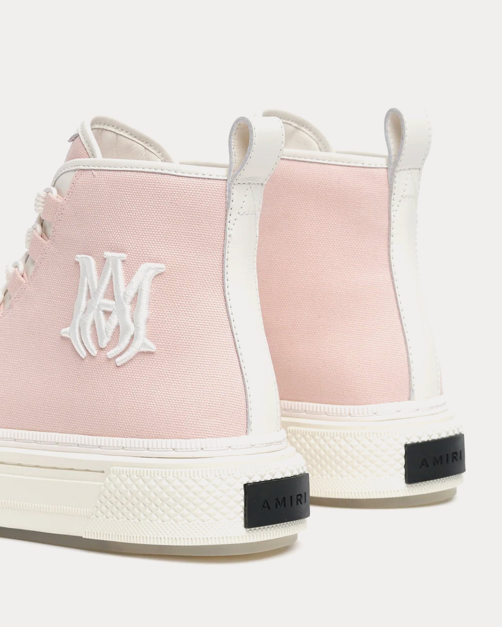 Les baskets montantes pour femmes AmiriMA Court Hi couleur pêche pâle sont fabriquées en toile de coton et présentent une tige en toile, des semelles extérieures en caoutchouc moulé à double épaisseur, le logo Amiri sur les côtés et des embouts en caoutchouc.