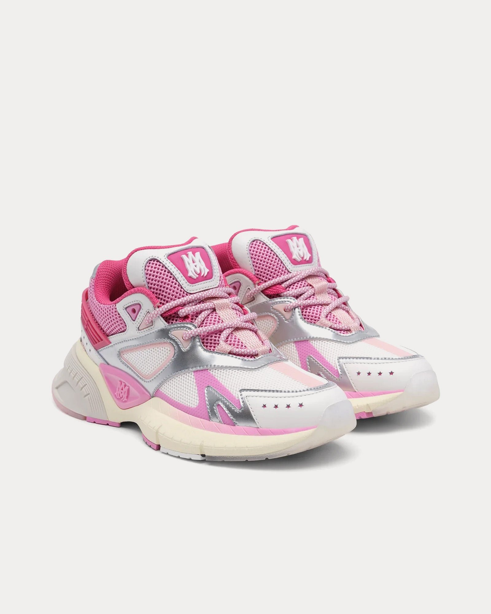 Les baskets basses pour femmes AmiriMA Runner en rose fuchsia, blanc et argent sont fabriquées en cuir et polyester et présentent un design classique inspiré des années 90, une tige en mesh respirant, des empiècements métalliques et des semelles en caoutchouc sculptées.