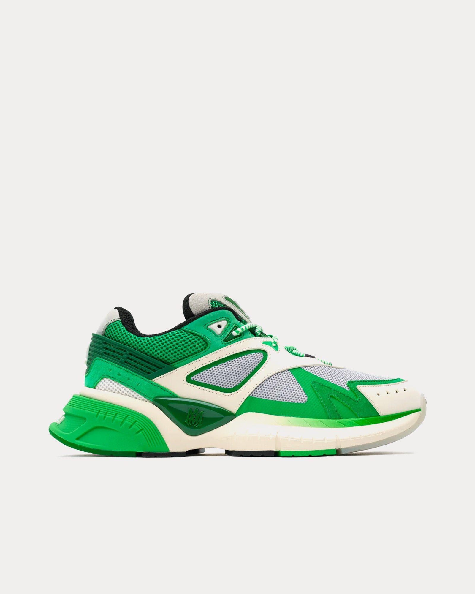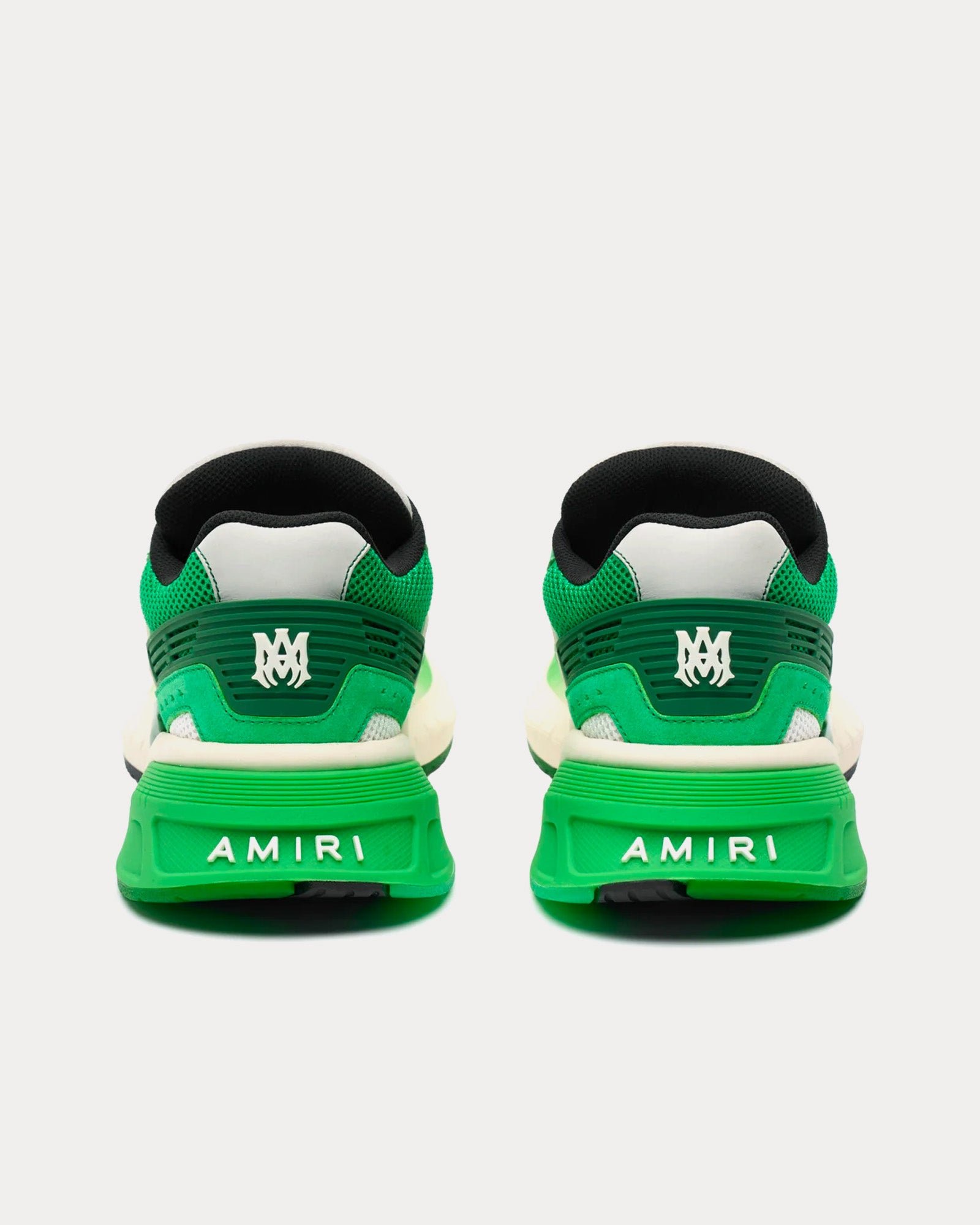 Les baskets basses pour femmes AmiriMA Runner en vert sont fabriquées en cuir et polyester et présentent un design classique inspiré des années 90, des tiges en mesh respirant, des détails en cuir et en daim et des semelles en caoutchouc sculptées. Une partie de la collection Amiri pré-printemps 2024.
