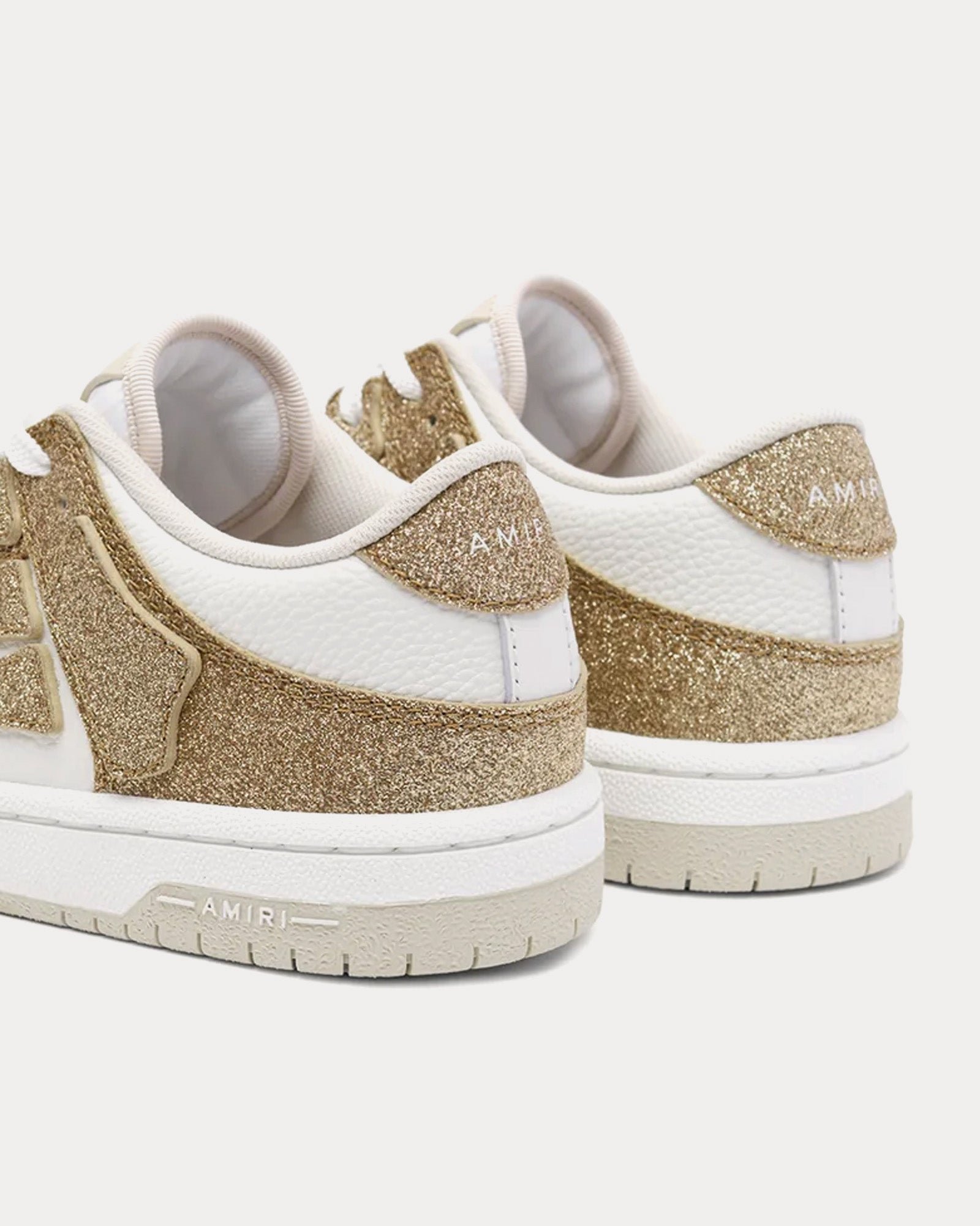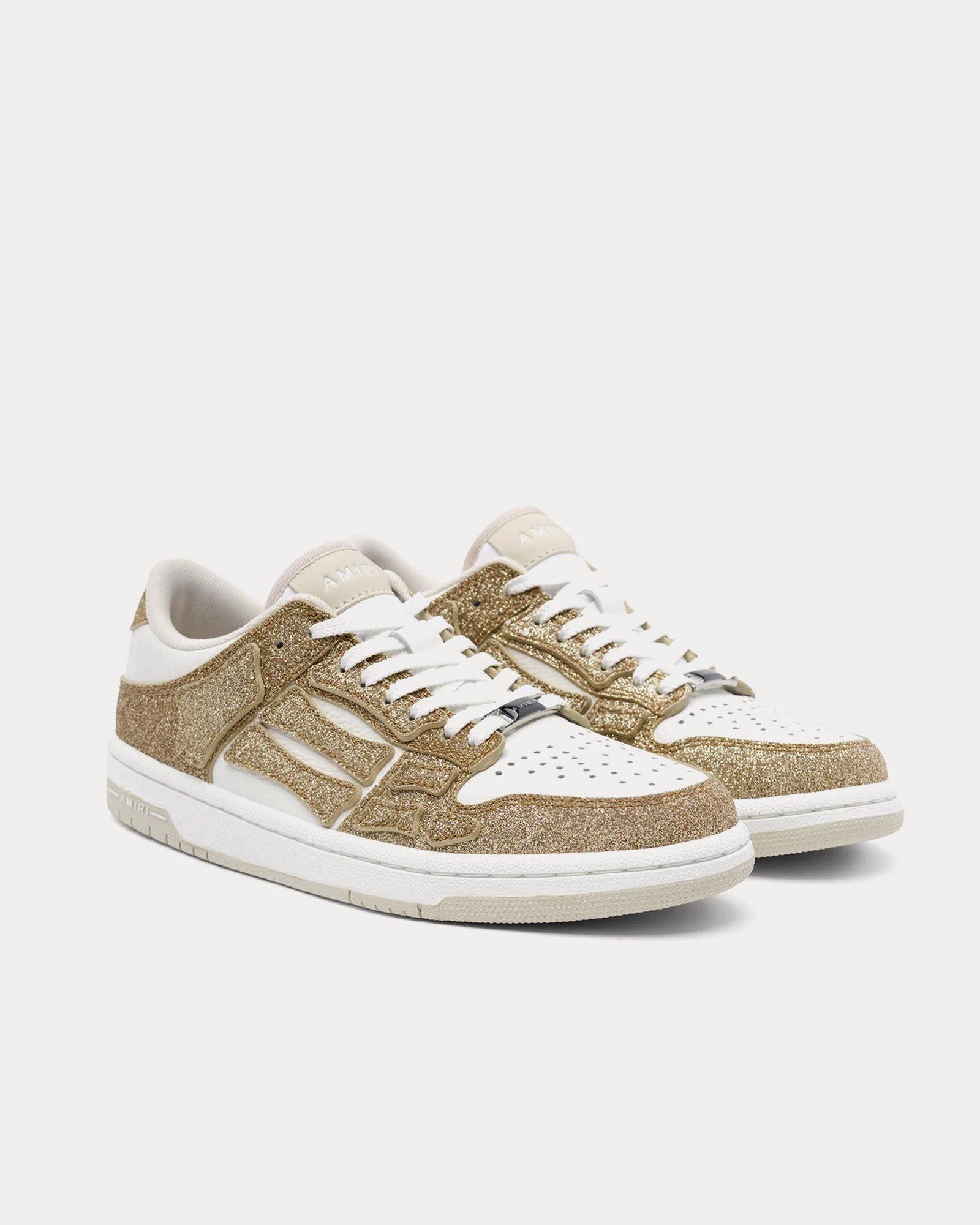 Les baskets basses pour femmes Amiri Shimmer Skel-Top de couleur or et blanc sont fabriquées en cuir et présentent un effet pailleté sur la tige, avec le logo Amiri sur le dessous des semelles en caoutchouc.