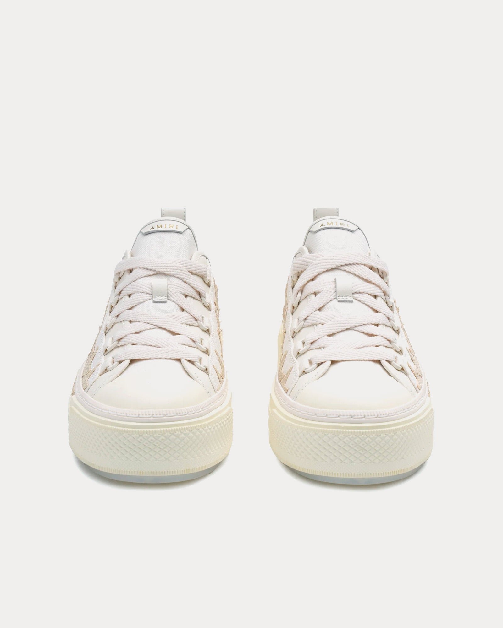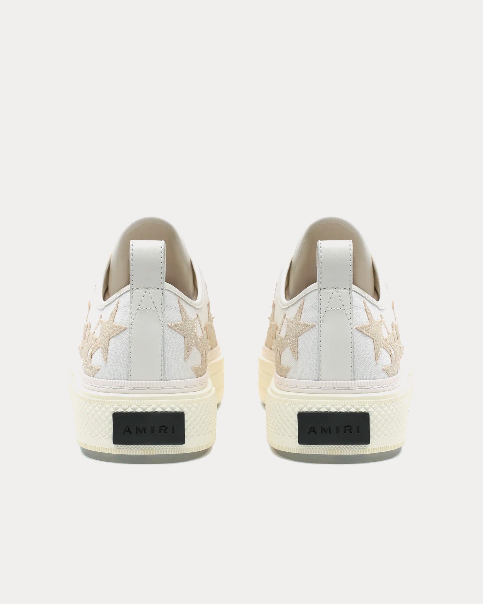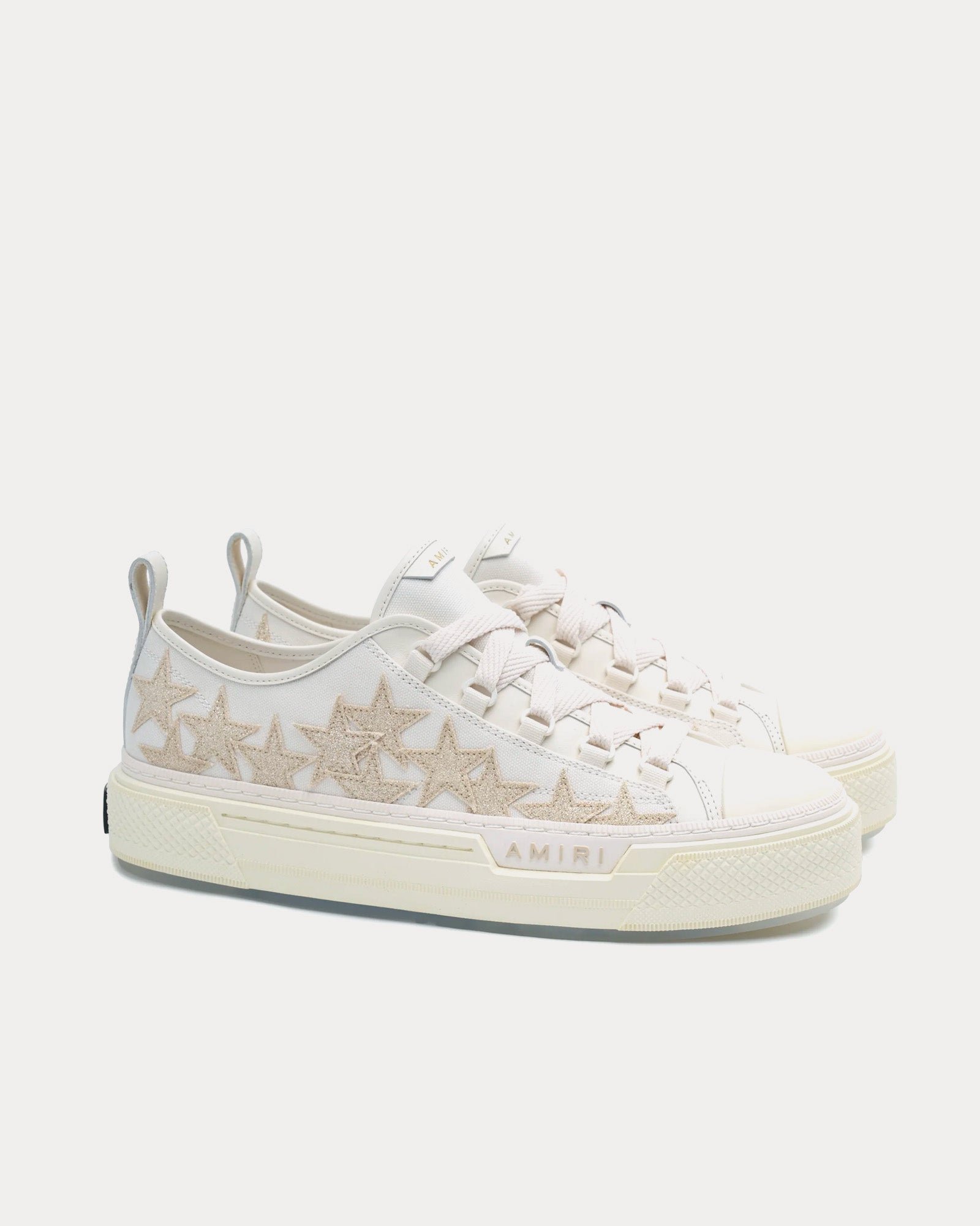 Les baskets basses pour femmes AmiriStar Court Glitter en blanc et albâtre sont fabriquées en toile et présentent des étoiles scintillantes sur la tige et des semelles en caoutchouc avec le logo Amiri sur le côté. Fabriquées en Chine.