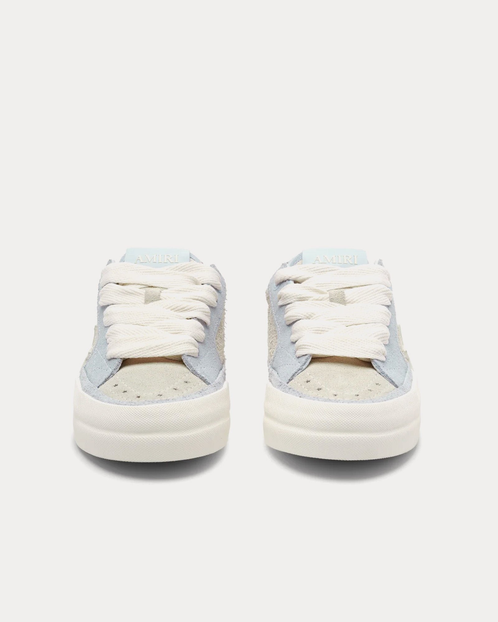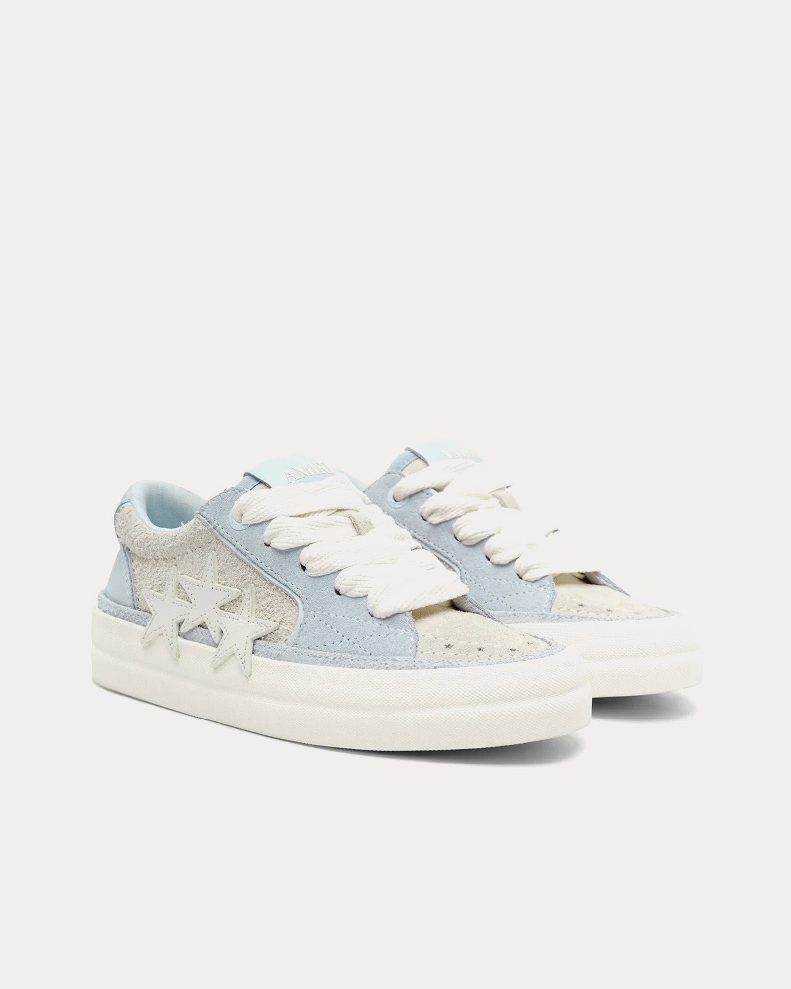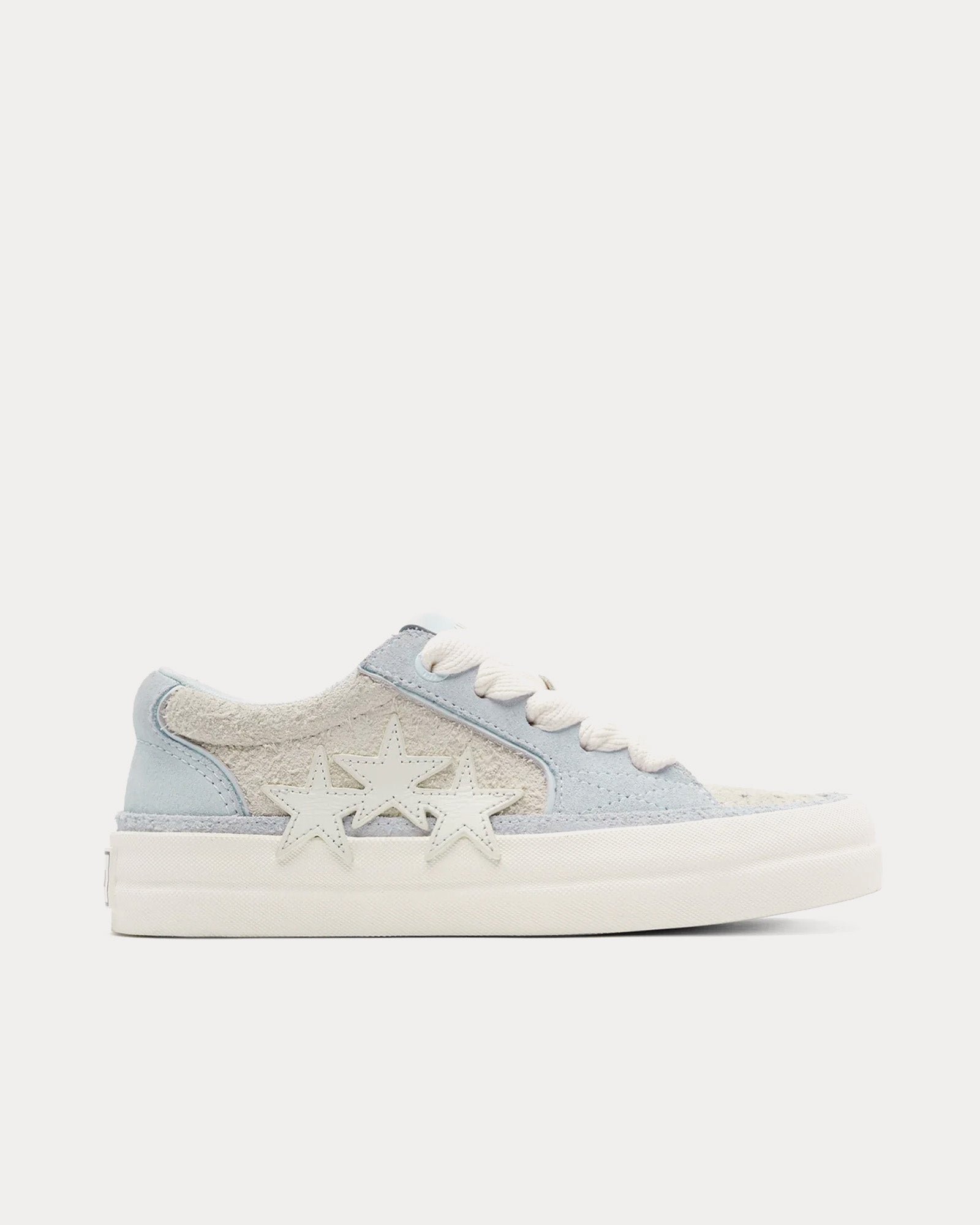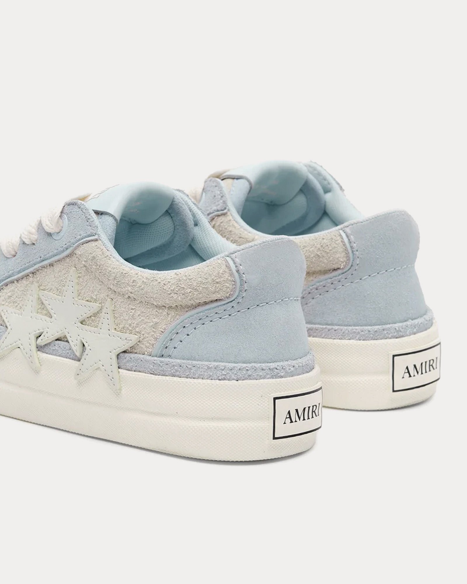 Les baskets basses pour femmes AmiriSunset Skate en albâtre et bleu s’inspirent de l’esprit de la culture skate de Venice Beach et présentent des tiges en daim à panneaux, des applications d’étoiles en cuir, de larges lacets, des semelles en caoutchouc vulcanisé et des perforations en étoile emblématiques au niveau des orteils.