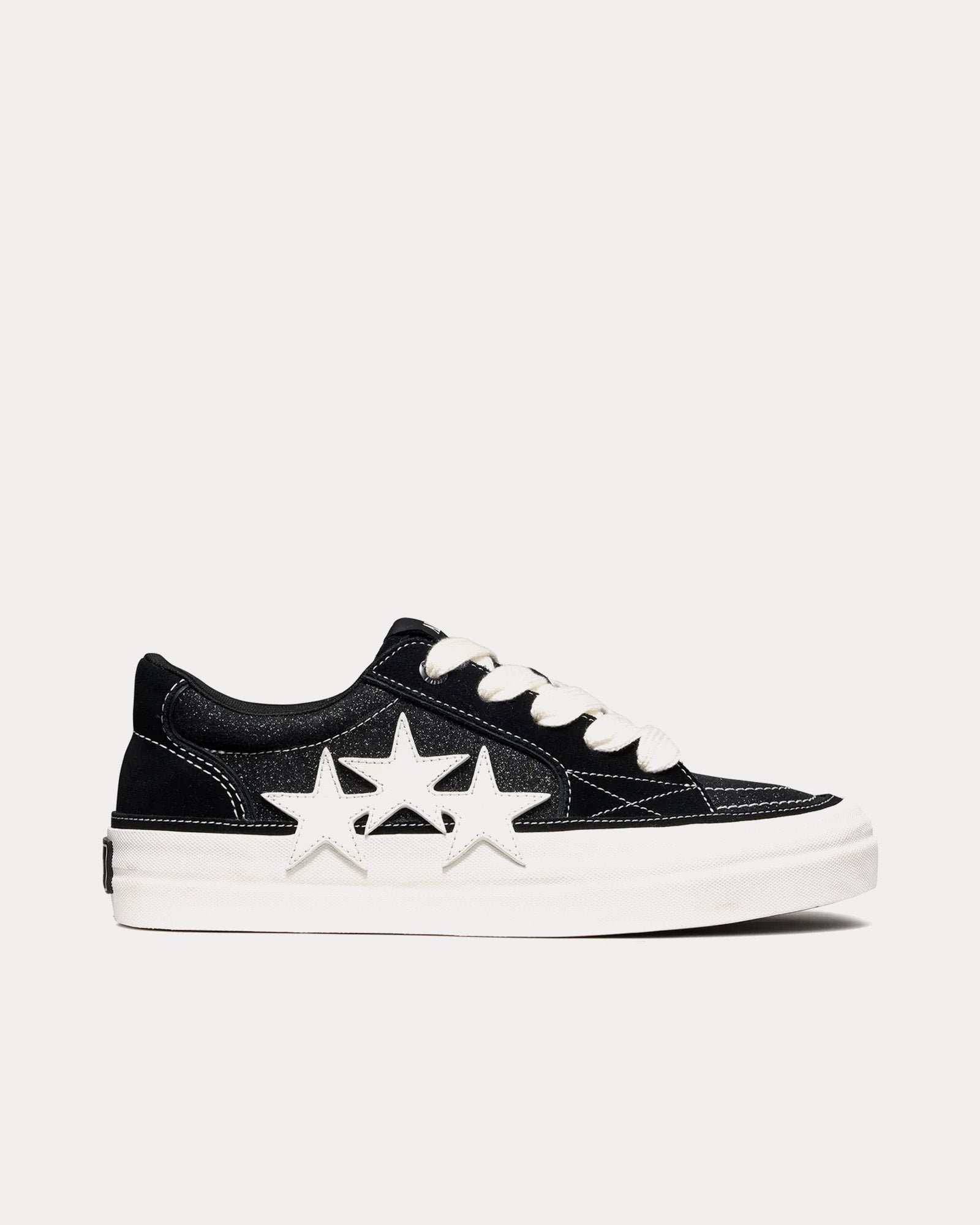 Les baskets Amiri Sunset Skate pour femme en noir et blanc revisitent les chaussures de skate classiques avec une touche audacieuse et glamour pour l’automne-hiver 2025. Cette silhouette accrocheuse présente une semelle en caoutchouc vulcanisé, des empiècements superposés en daim et paillettes, et des applications étoiles en cuir surdimensionnées, caractéristiques emblématiques du style Amiri.