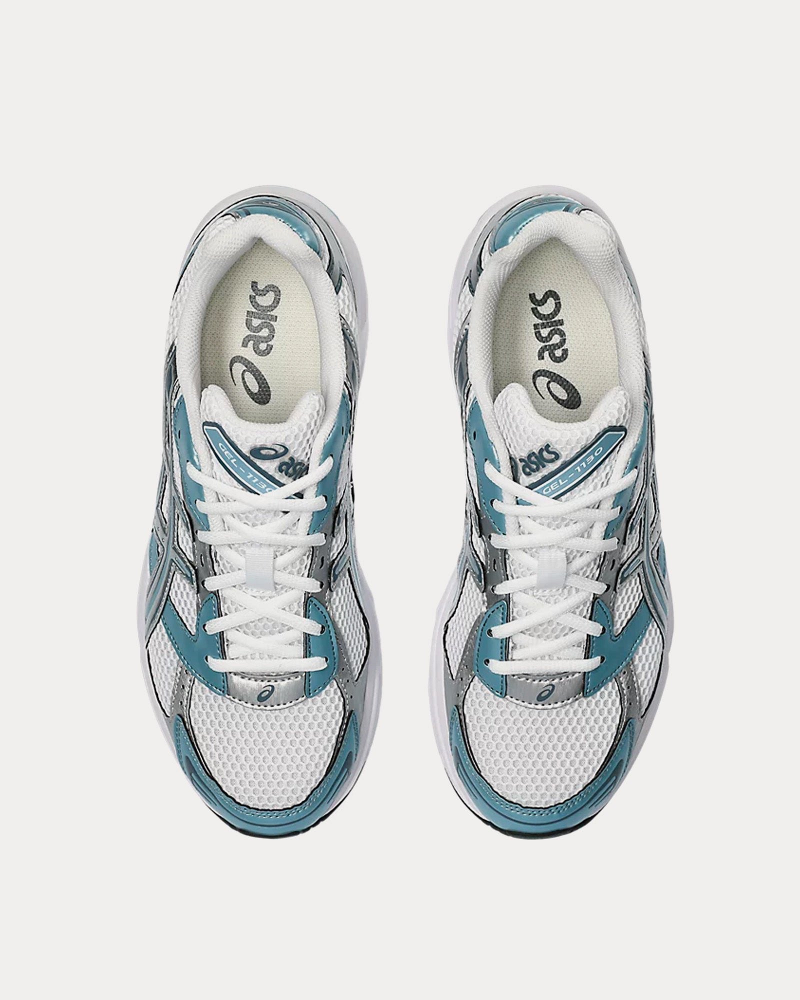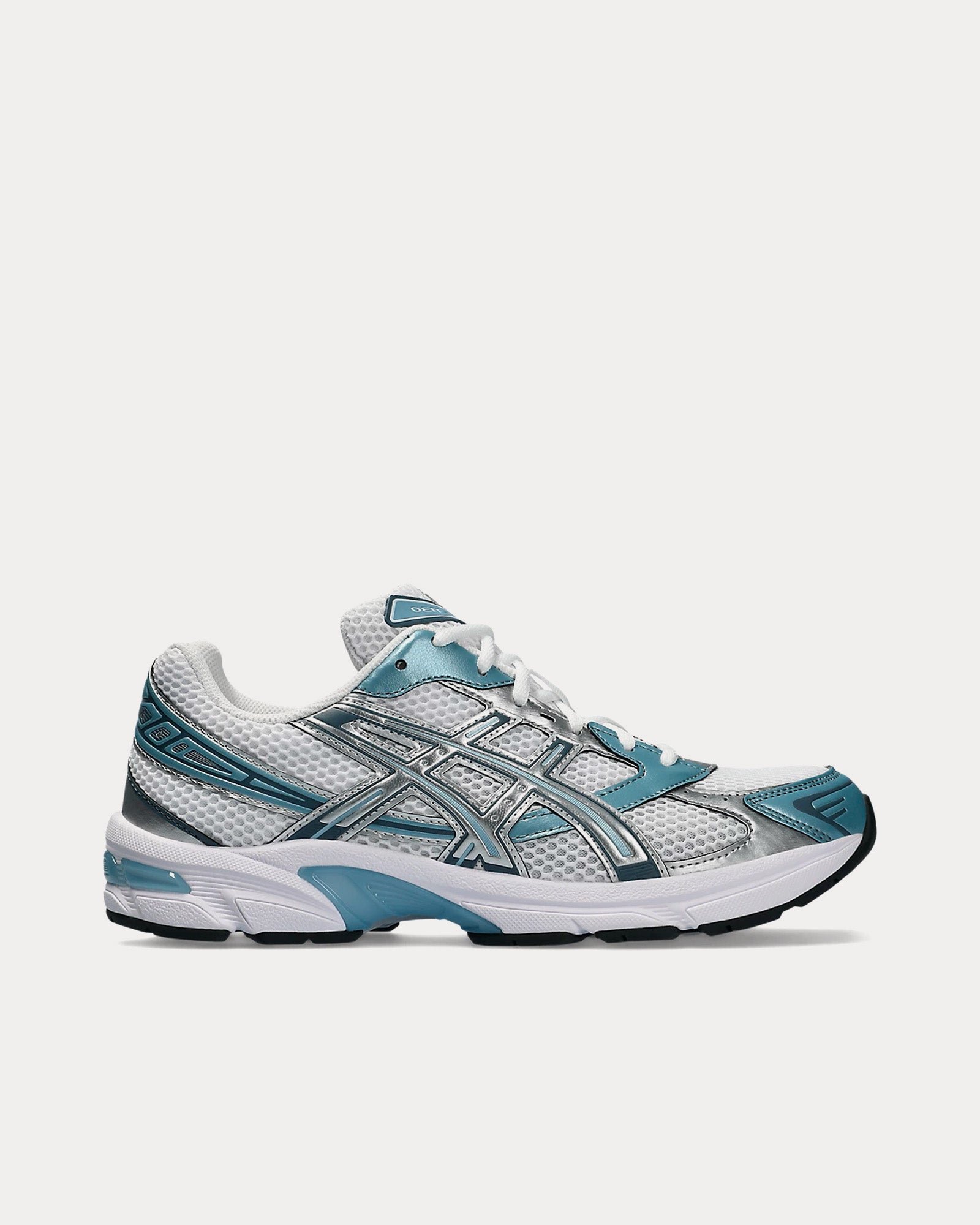 The unisex Asics Gel-1130 low top sneakers in white and shark skin feature a late 2000s runner aesthetic, GEL™ technology cushioning to provide excellent shock absorption, and synthetic leather overlays and mesh underlays. The upper’s main material is designed with more than 20% recycled materials.