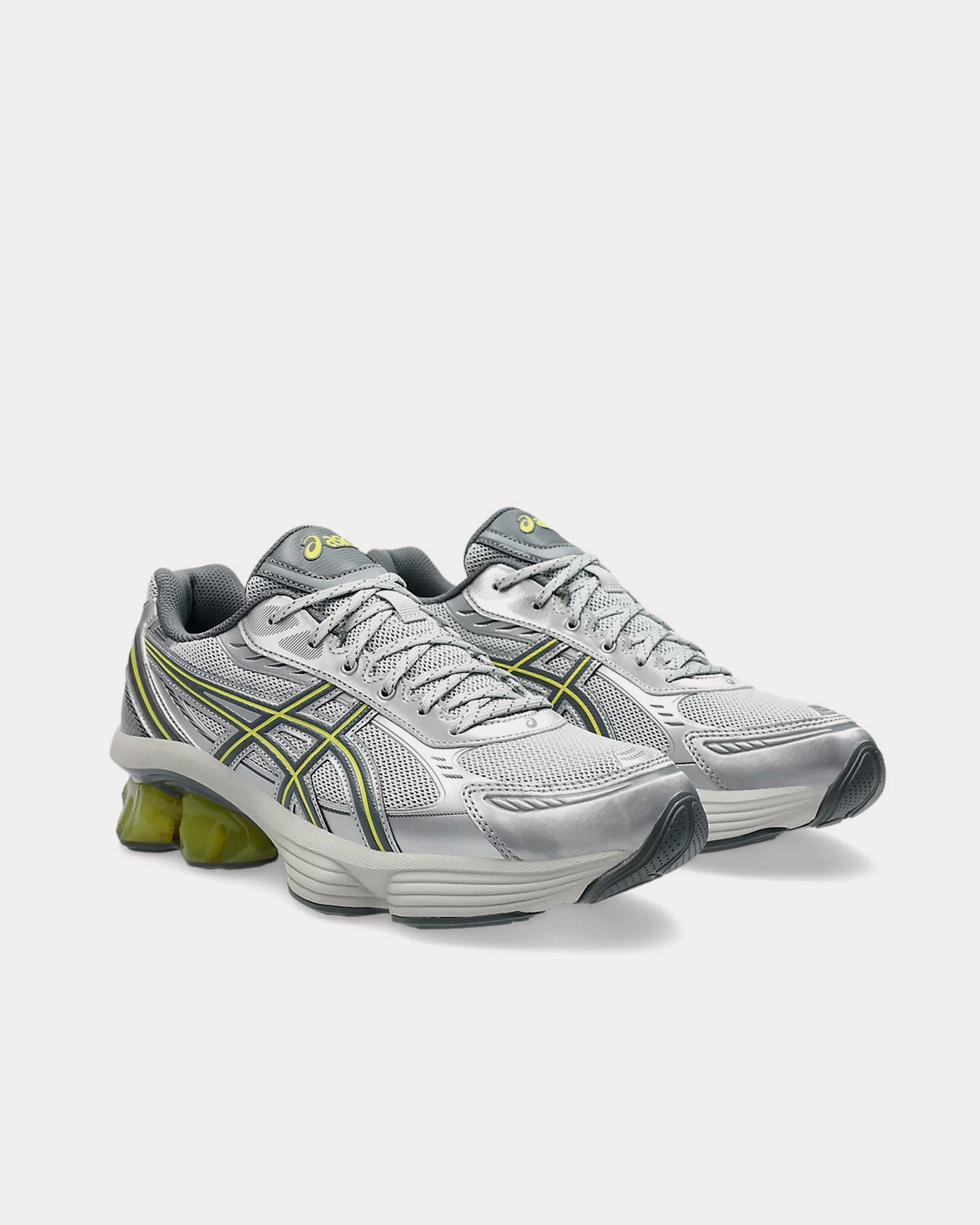 The unisex AsicsGel-Kinetic Fluent low top sneakers in glacier grey and steel grey feature synthetic leathers and various mesh panels layered throughout the uppers, Scutoid GEL technology that has a closely packed 3D geometry and an off-axis structure, cushioning from the Asics running collection that has been re-tuned for everyday purposes, and an improved overall fit by providing a better foothold.