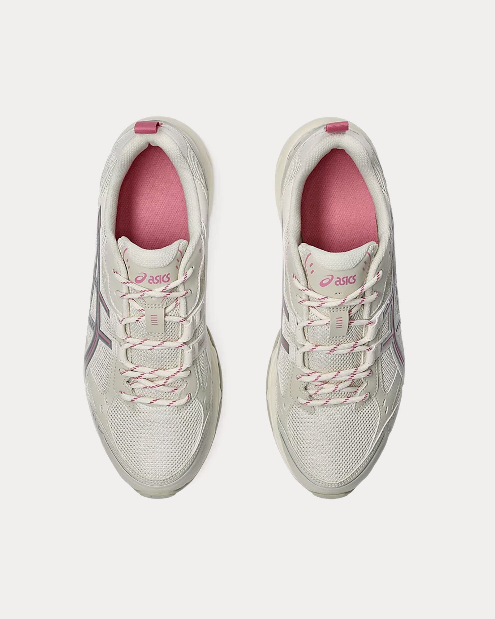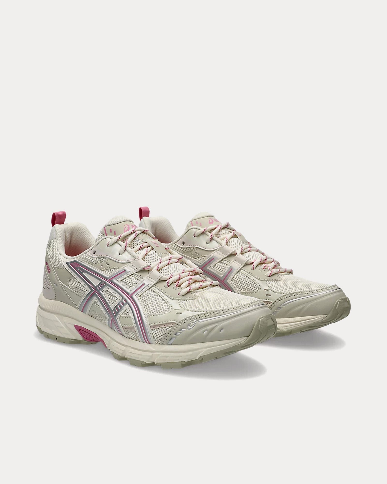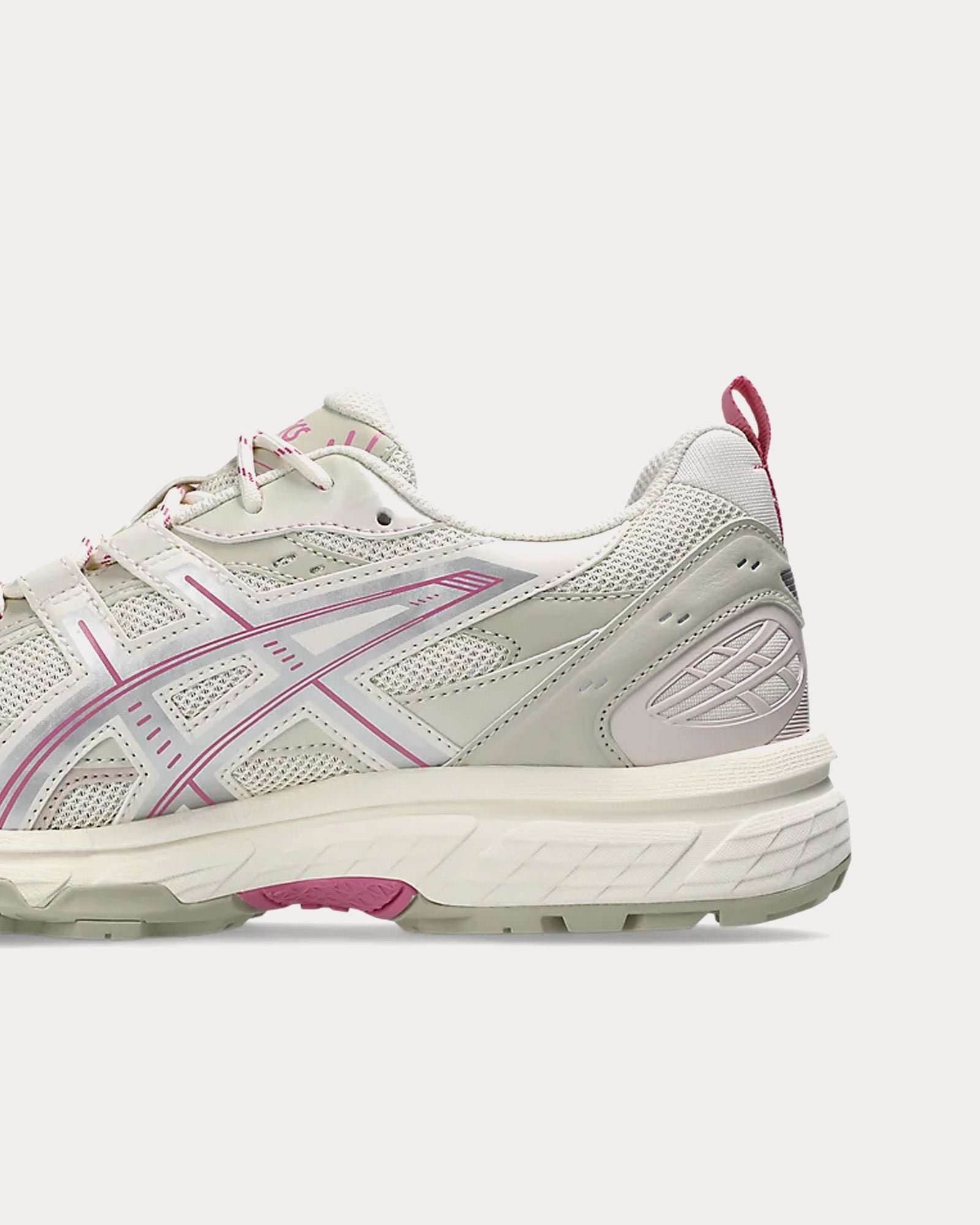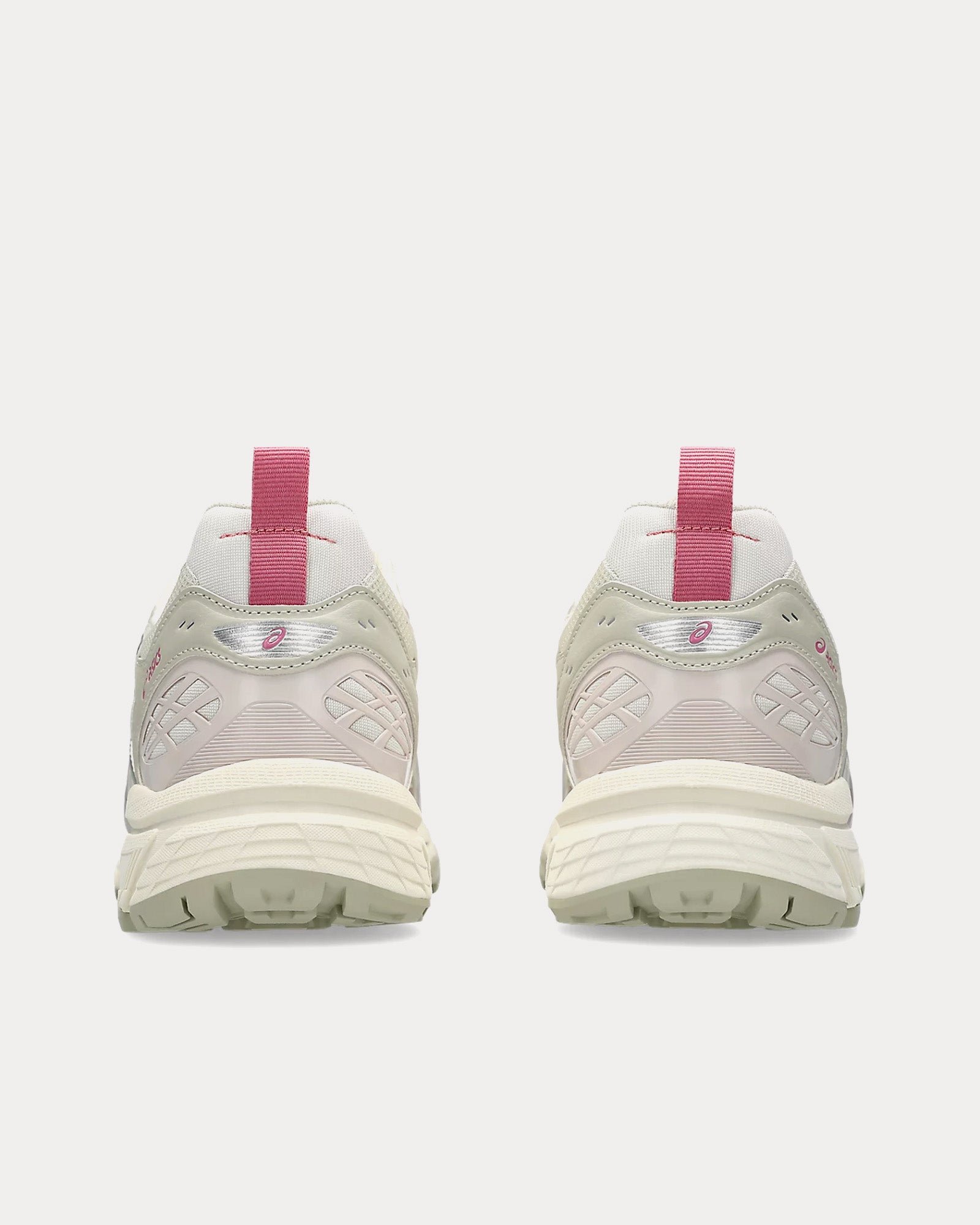 The unisex AsicsGel-Nunobiki low top sneakers in cream and sweet pink are inspired by the GEL-KAHANA® 3 and GEL-TARGET trail shoes and feature a layered upper construction, rearfoot GEL® technology to improve impact absorption, trail-specific outsole patterns to help with grip on various surfaces, and synthetic matte and semi-gloss layers connecting to the rough and barren textures found in the outdoors to form an urban trail aesthetic.