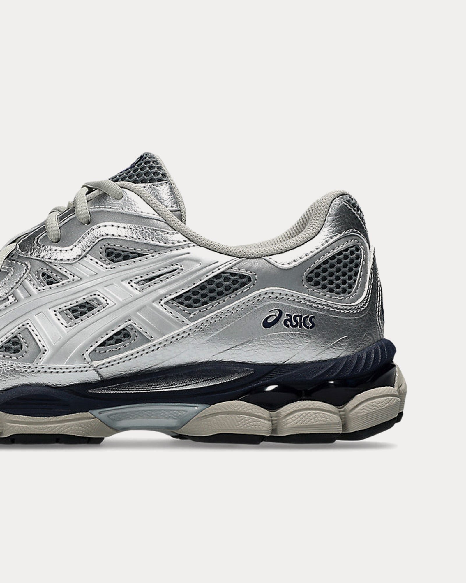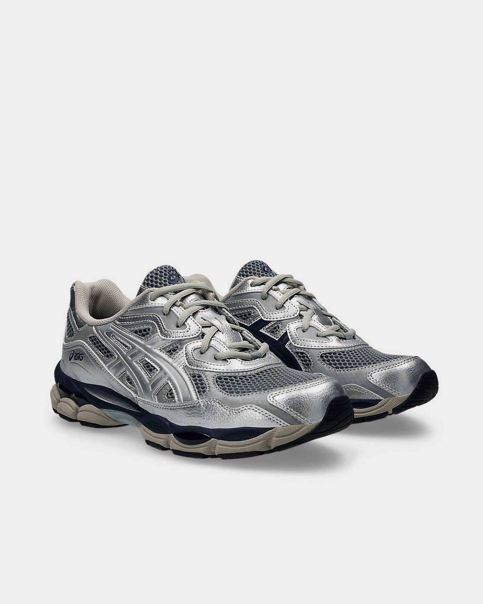 The unisex Asics Gel-NYC low top sneakers in pure silver and midnight are inspired by heritage and modern performance running styles with an upper is inspired by the GEL-NIMBUS 3 and MC-PLUS V shoes and rearfoot and forefoot GEL™ technology for comfort in everyday scenarios.