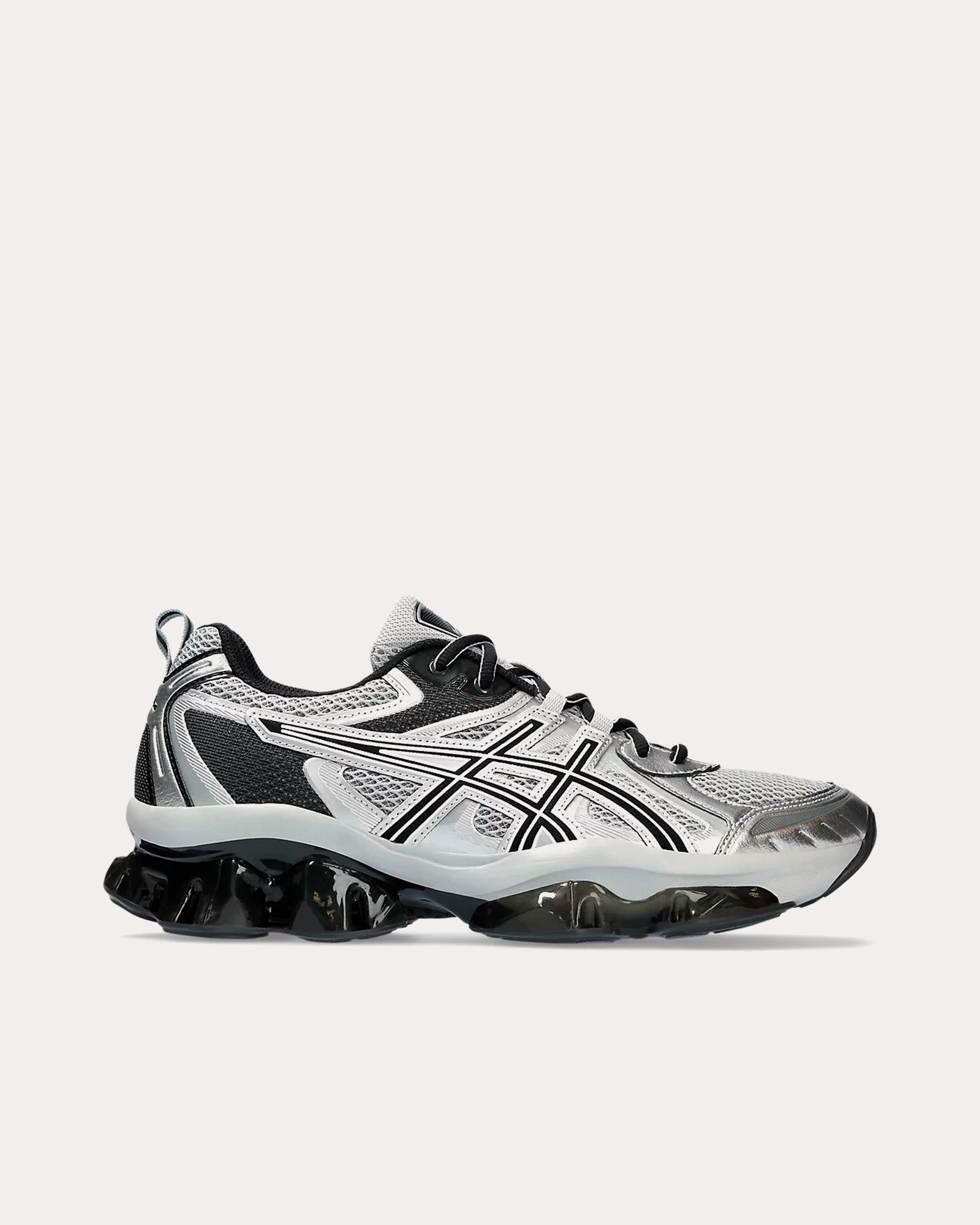 The unisex AsicsGel-Quantum Kinetic low top sneakers in mid grey and pure silver feature synthetic leathers and various mesh panels layered throughout the uppers, Scutoid GEL technology that has a closely packed 3D geometry and an off-axis structure, cushioning from the Asics running collection that has been re-tuned for everyday purposes, and an improved overall fit by providing a better foothold.