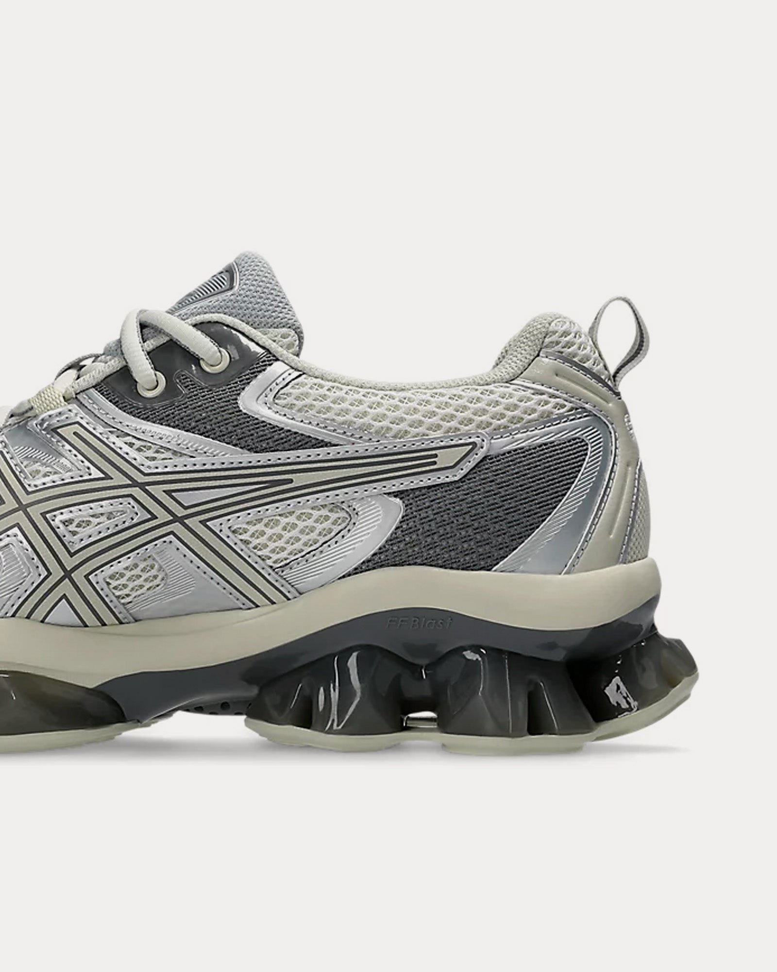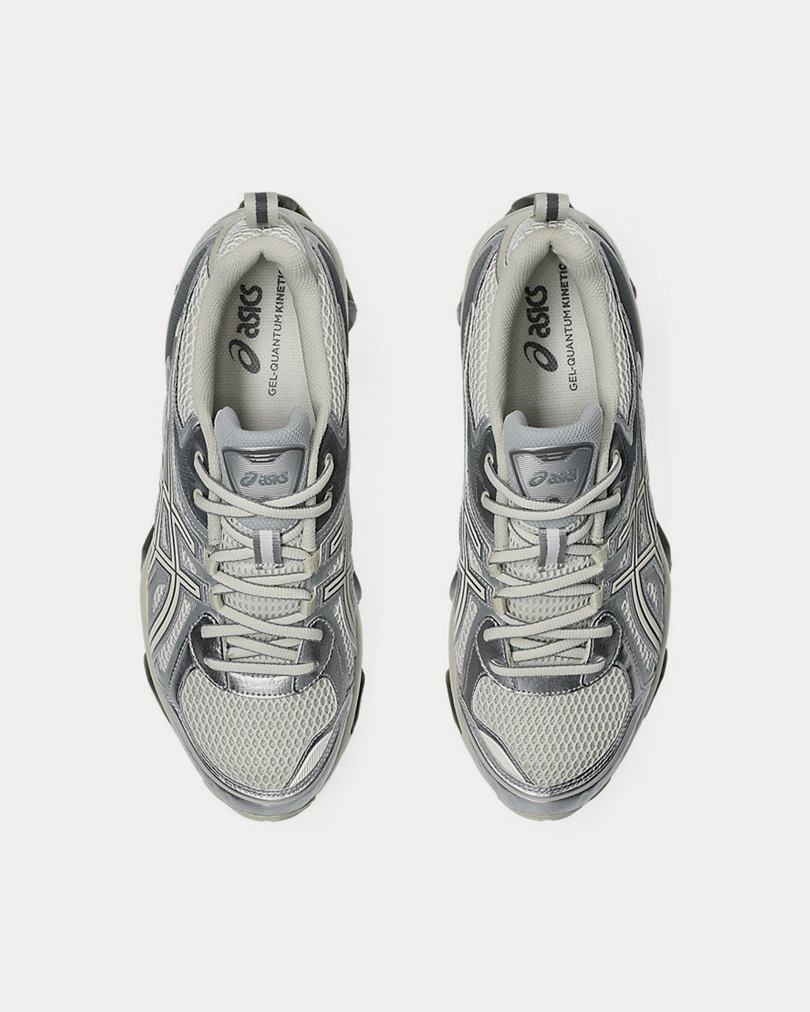 The unisex AsicsGel-Quantum Kinetic low top sneakers in white and light dust feature synthetic leathers and various mesh panels layered throughout the uppers, Scutoid GEL technology that has a closely packed 3D geometry and an off-axis structure, cushioning from the Asics running collection that has been re-tuned for everyday purposes, and an improved overall fit by providing a better foothold.