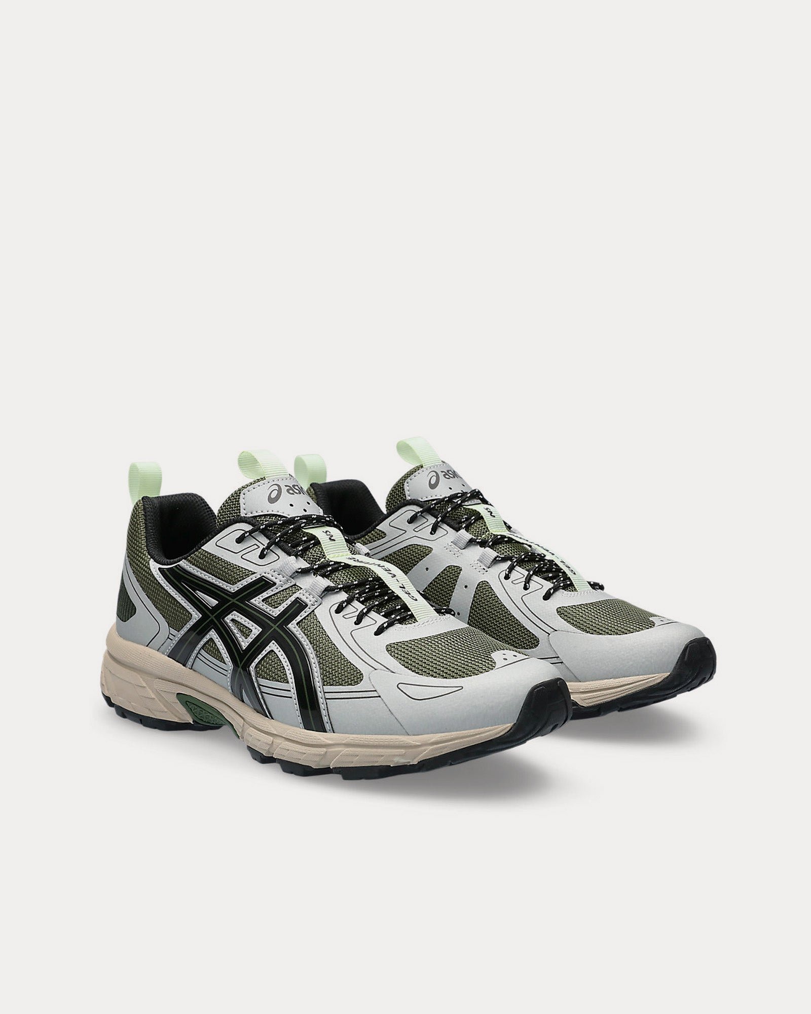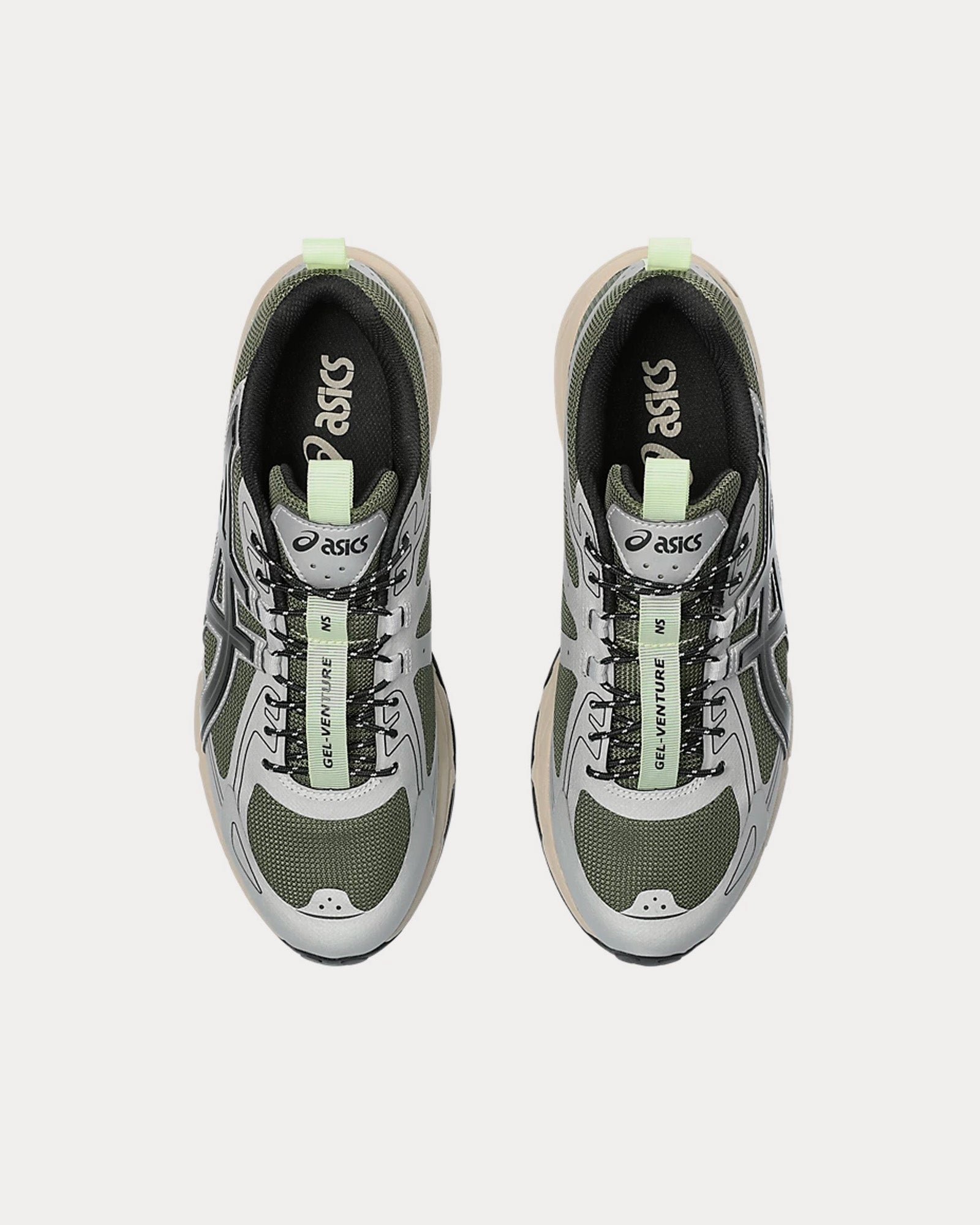 The unisex AsicsGel-Venture 6 NS low top sneakers in forest and black are based on trail-running sportstyle designs and feature synthetic leather uppers, panels with targeted support, rearfoot GEL™ technology, and a trail-specific traction pattern.