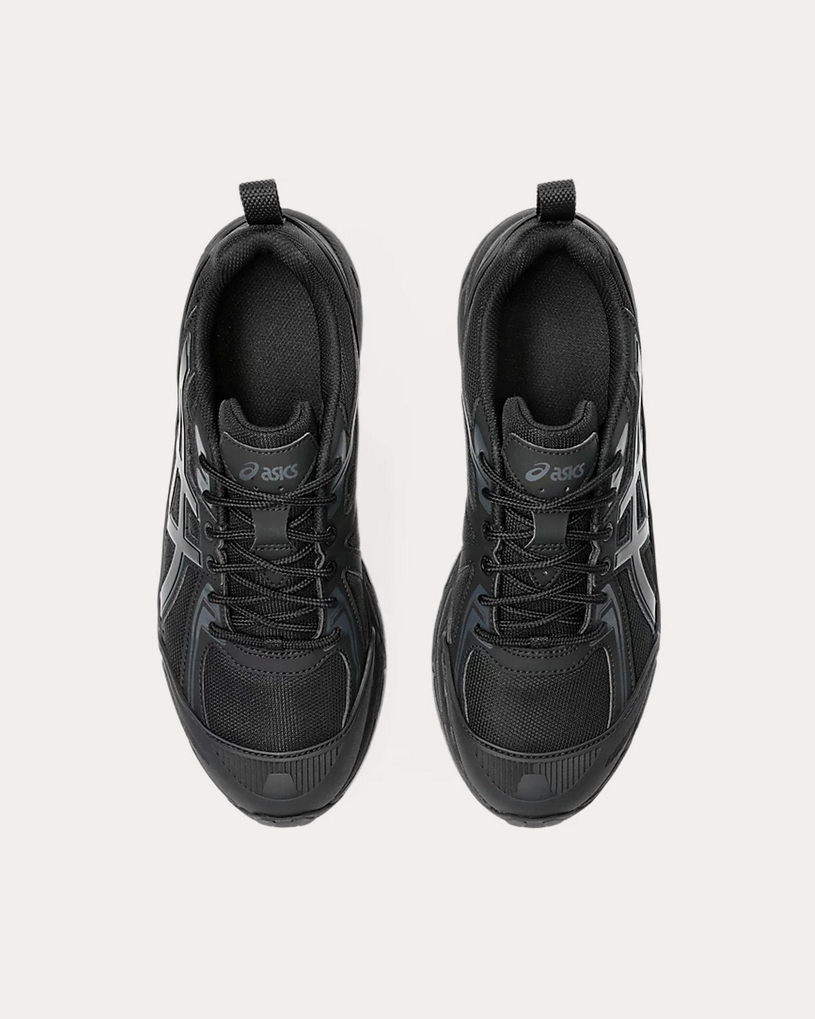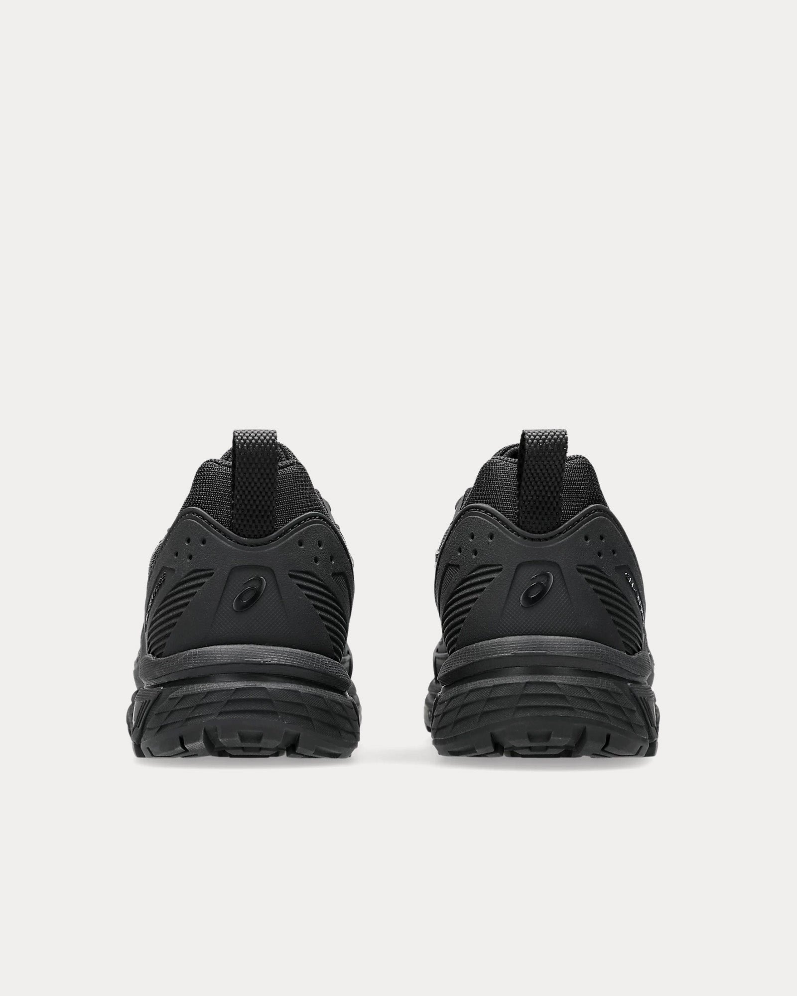 The unisex AsicsGel-Venture 6 Shield low top sneakers in black and black are based on trail-running sportstyle designs and feature synthetic leather uppers, panels with targeted support, rearfoot GEL™ technology, and a trail-specific traction pattern.