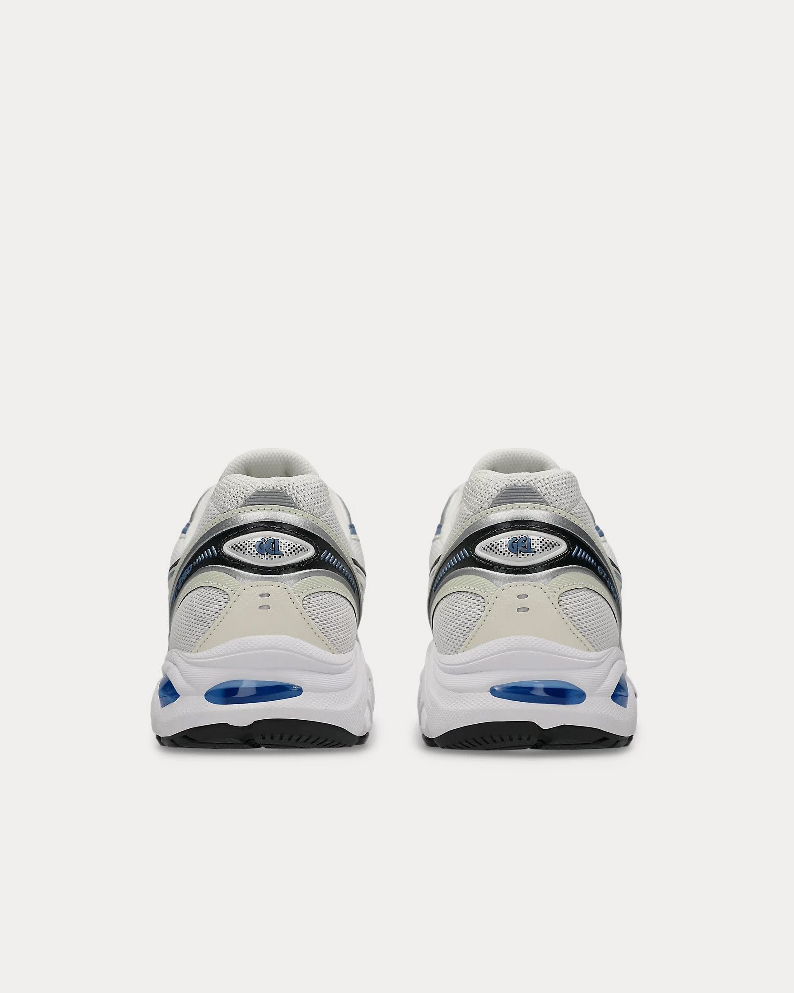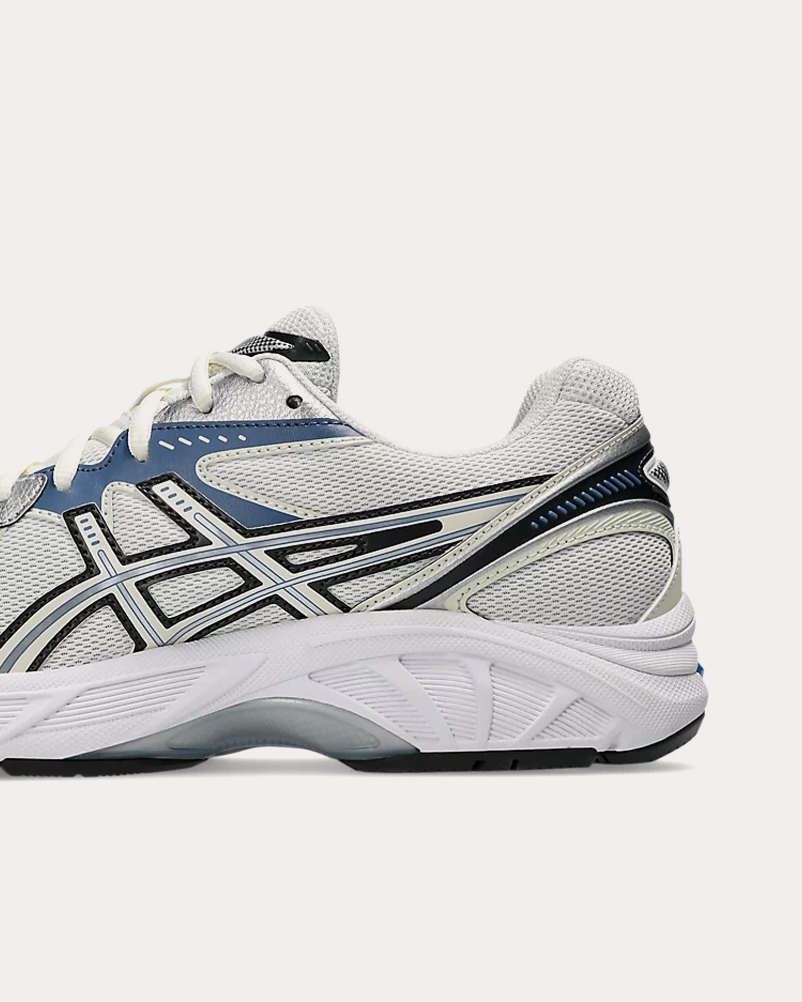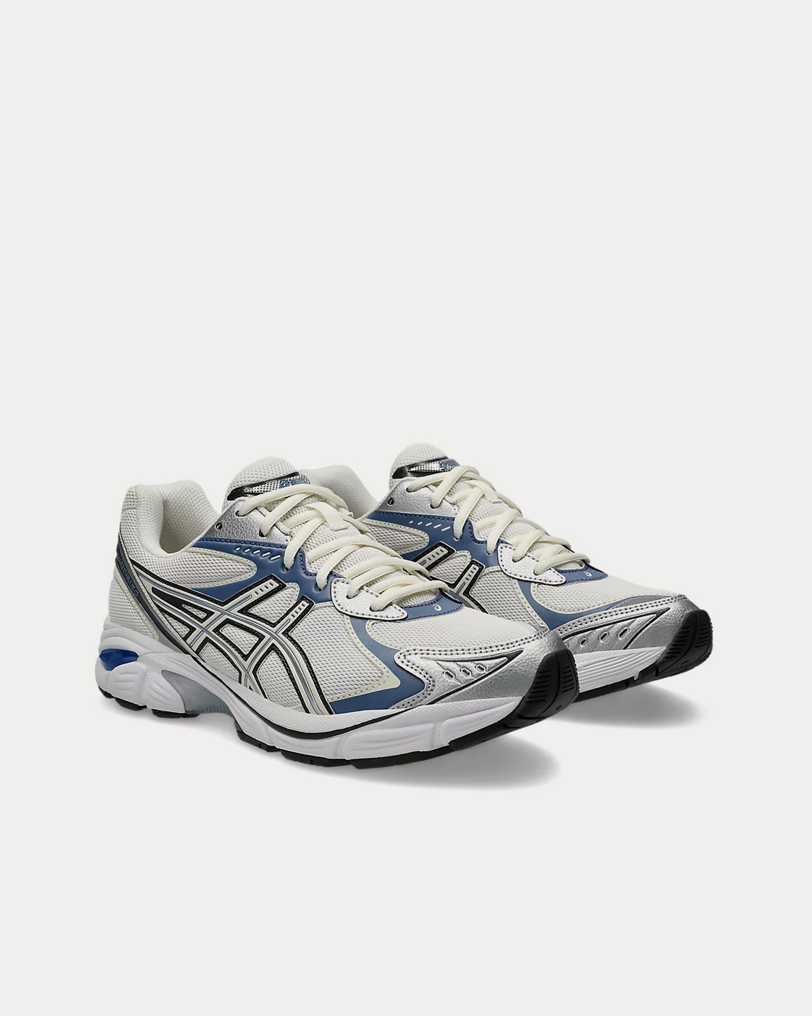 The unisex AsicsGT-2160 low top sneakers in cream and denim blue feature layered synthetic leather upper, sleek aesthetic, and wavy forefoot sculpting.
