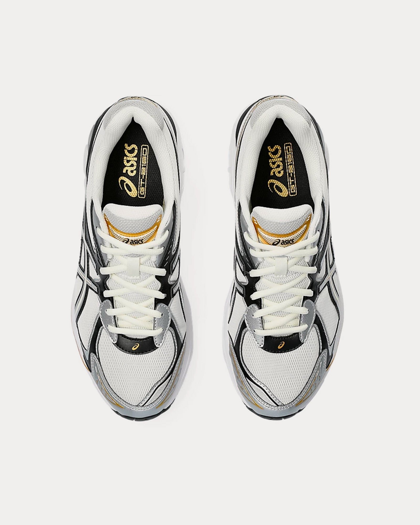 The unisex AsicsGT-2160 low top sneakers in cream and pure silver feature layered synthetic leather upper, sleek aesthetic, and wavy forefoot sculpting.