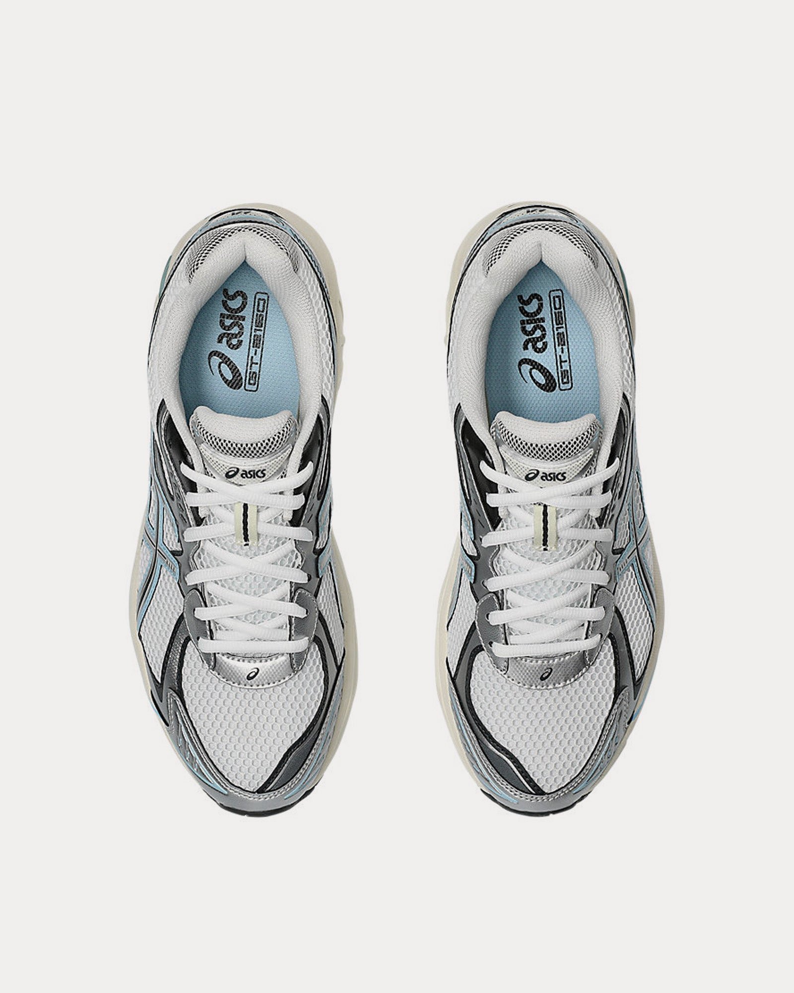 The unisex AsicsGT-2160 low top sneakers in white and pure silver feature layered synthetic leather upper, sleek aesthetic, and wavy forefoot sculpting.