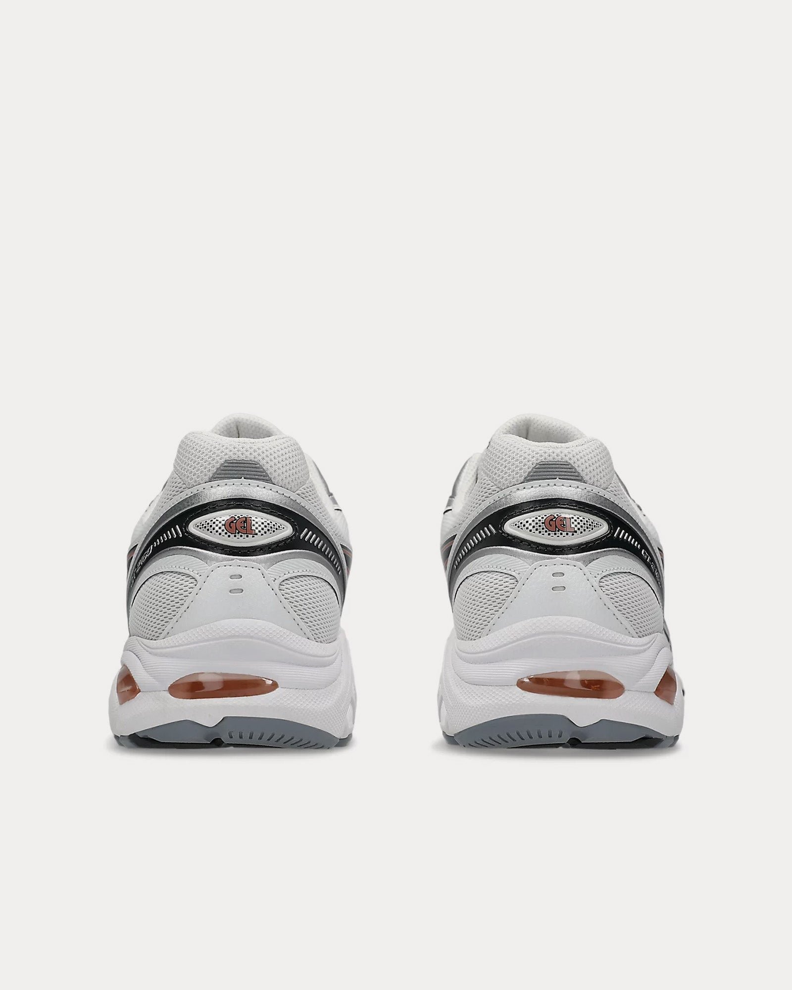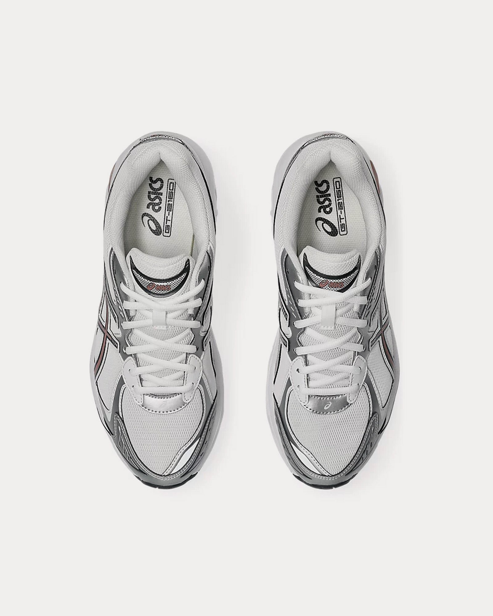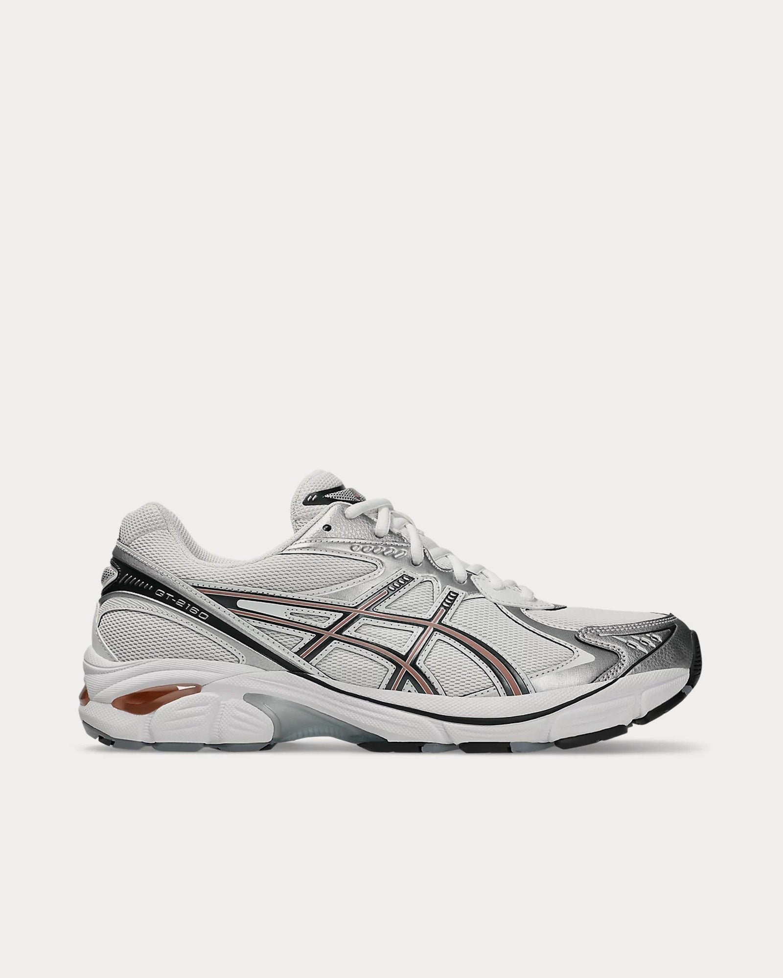 The unisex AsicsGT-2160 low top sneakers in white and rose rouge feature layered synthetic leather uppers, sleek aesthetic, and wavy forefoot sculpting.