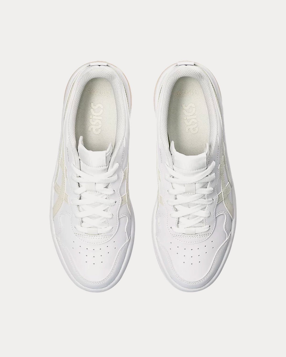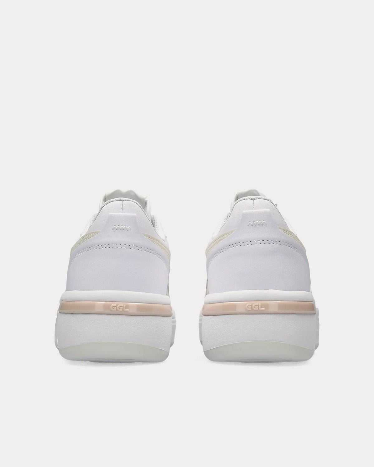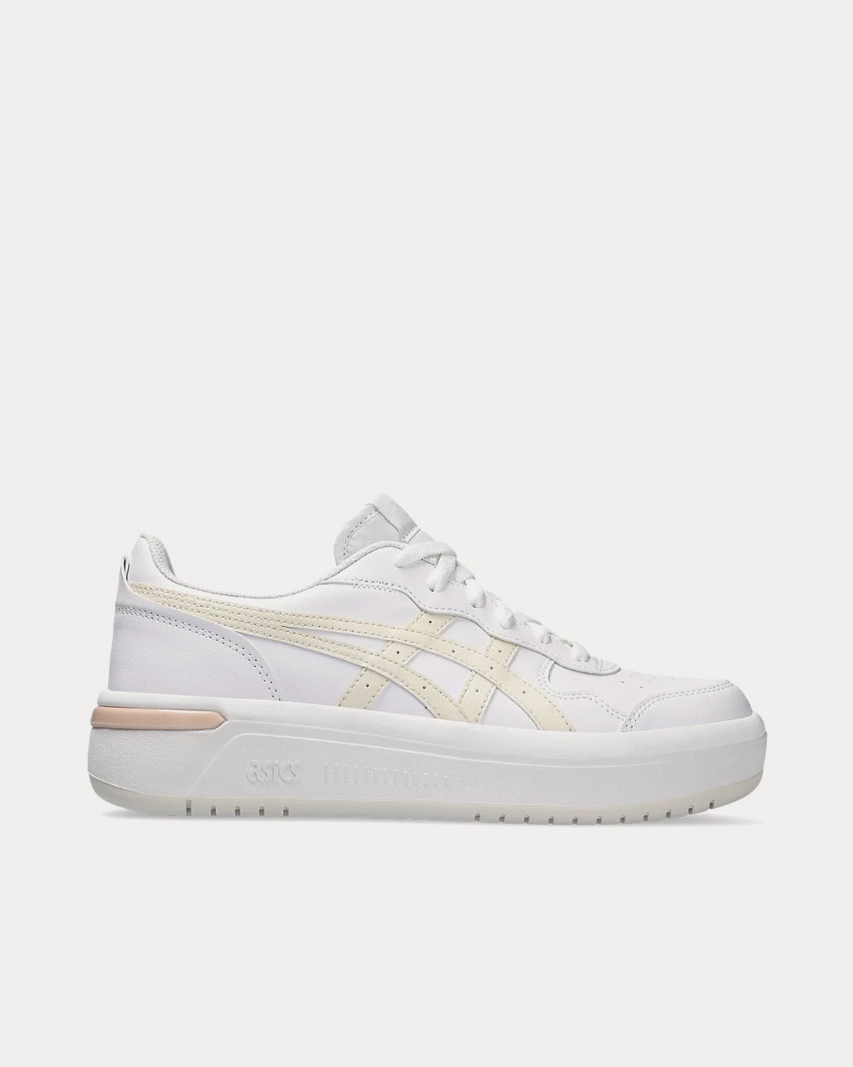 The unisex AsicsJapan S ST low top sneakers in white and birch feature layered synthetic leather upper, amplified cushioning soles with GEL technology, and a retro 80’s inspired design.