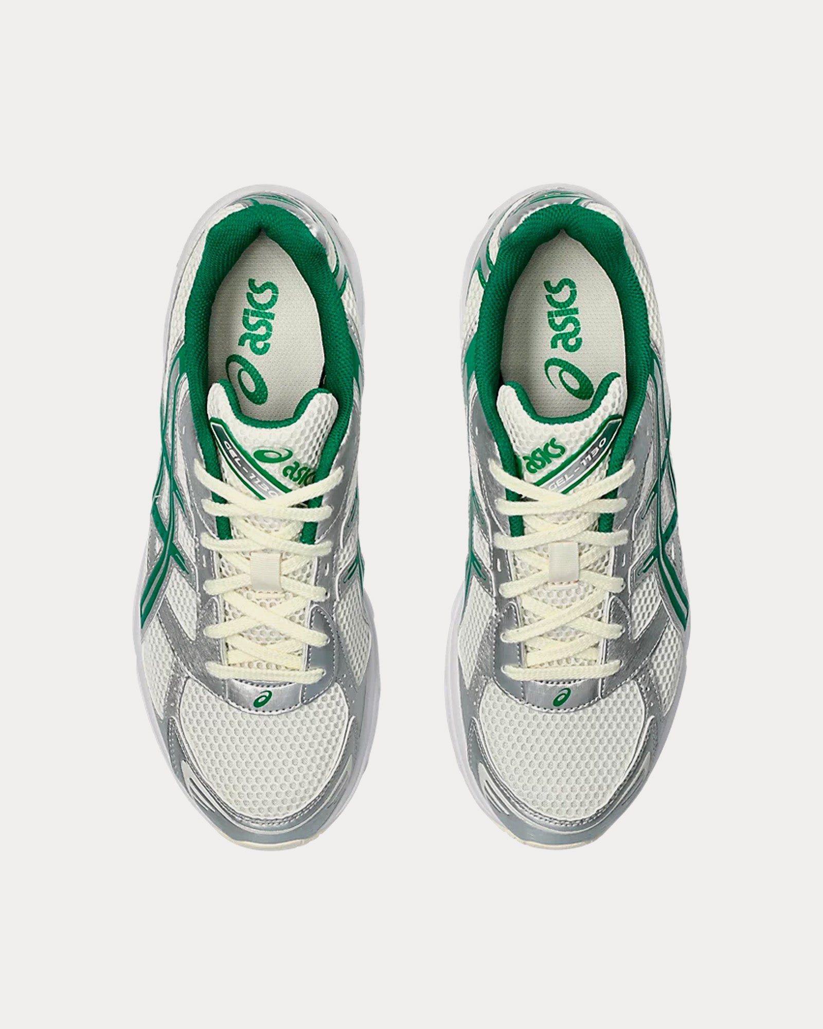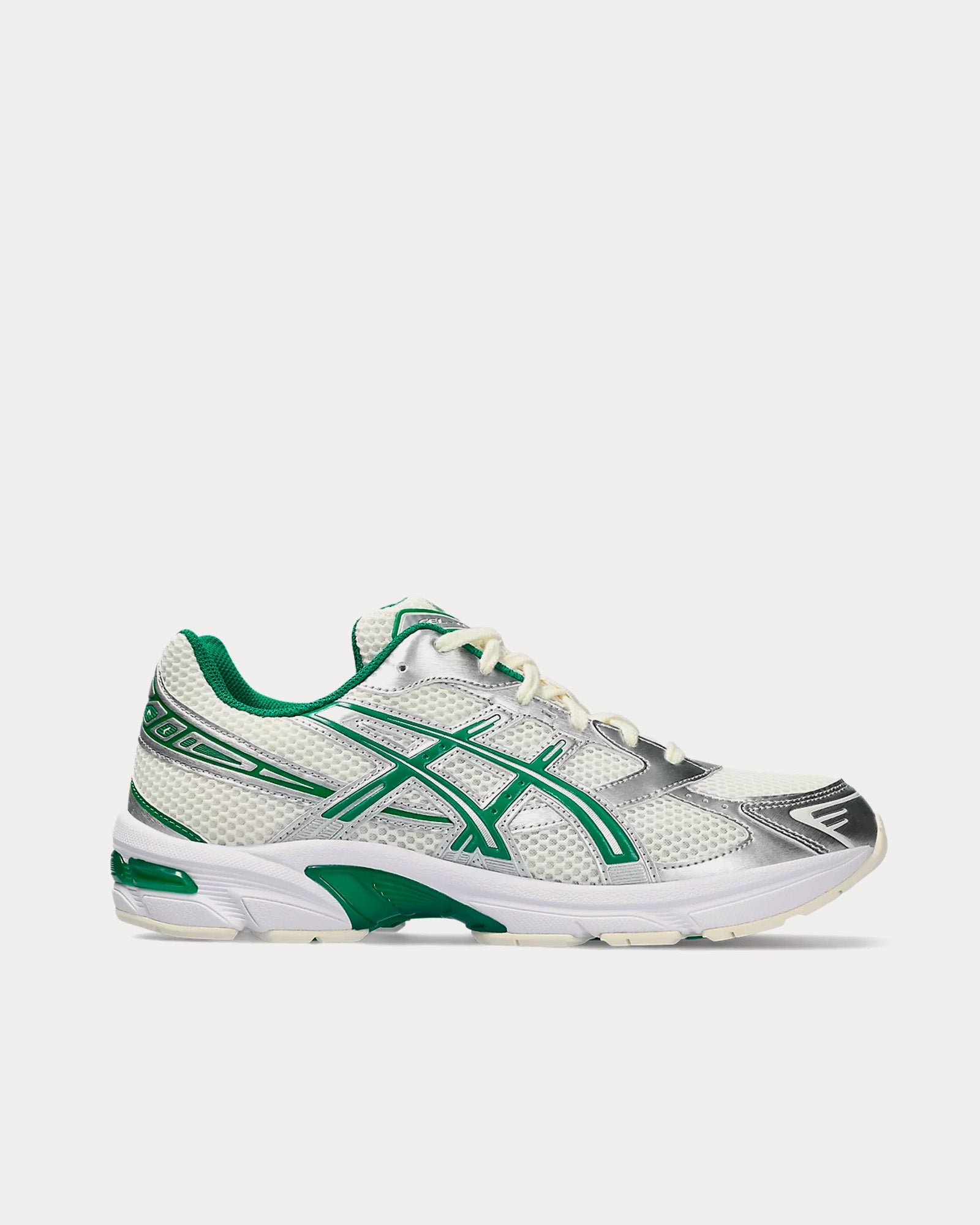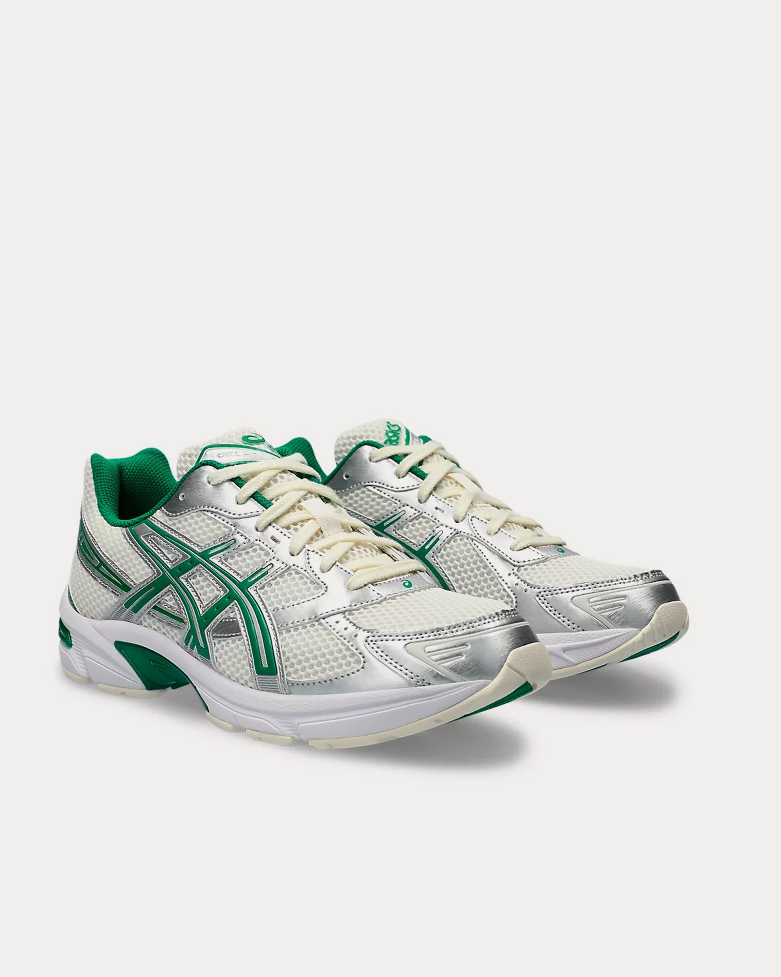 The men’s Asics Gel-1130 low top sneakers in cream and kale feature a late 2000s runner aesthetic, GEL™ technology cushioning to provide excellent shock absorption, and synthetic leather overlays and mesh underlays. The upper’s main material is designed with more than 20% recycled materials.