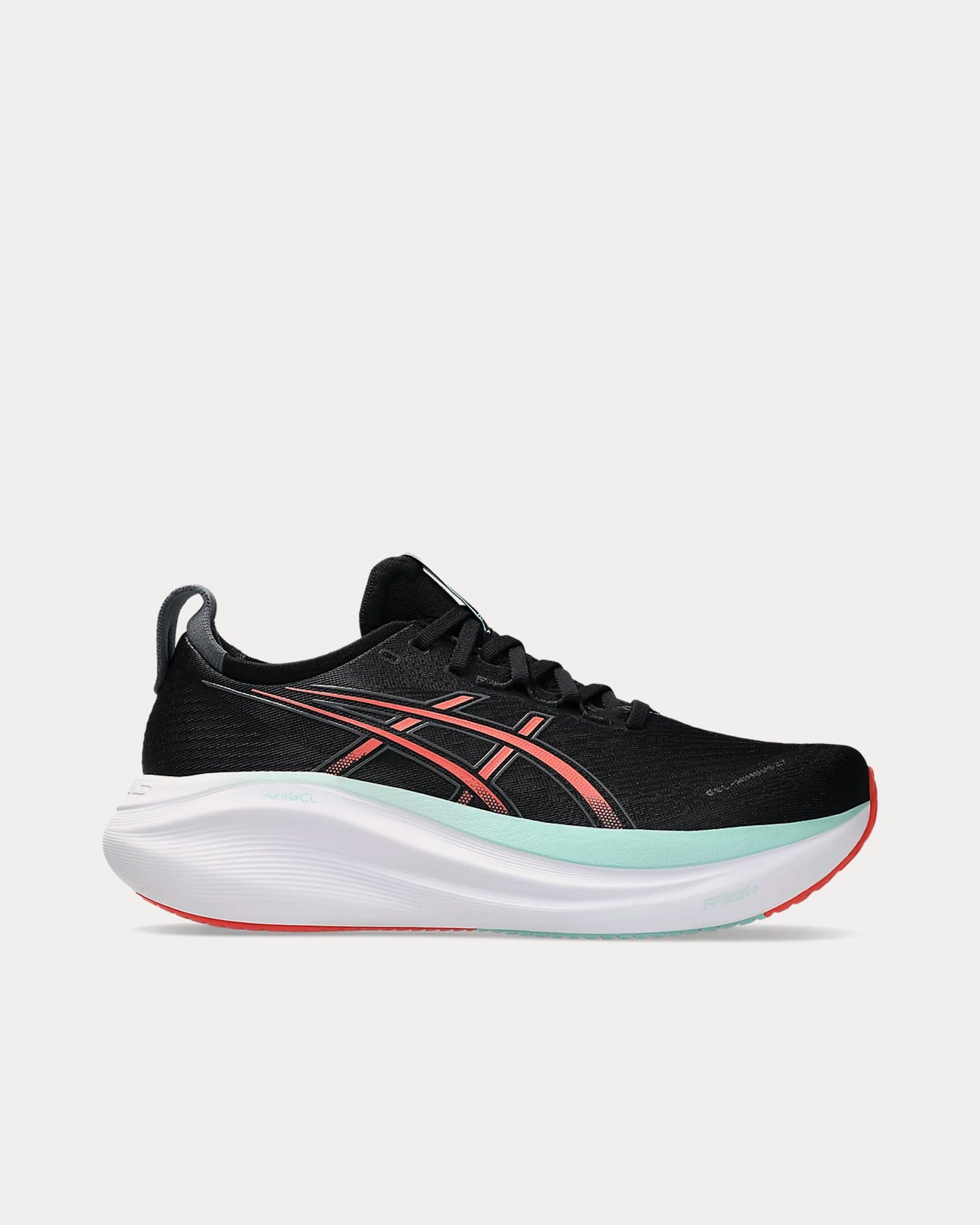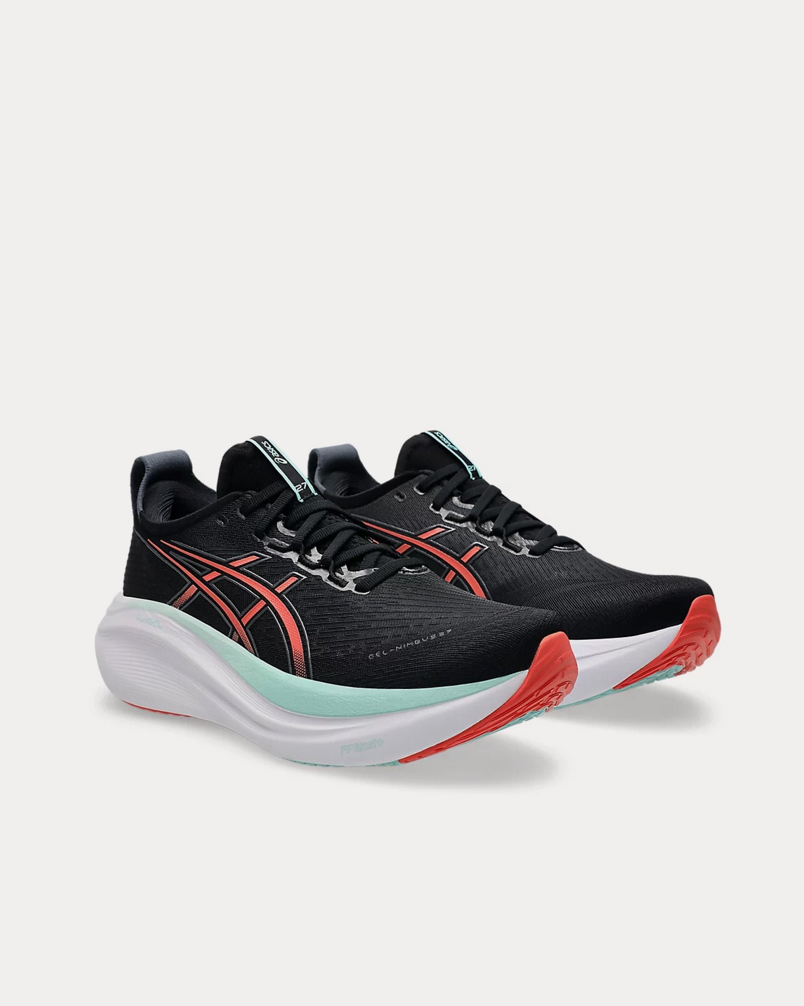 The men’s Asics Gel-Nimbus 27 running shoes in black and coral reef are designed for road running and feature soft engineered jacquard mesh uppers that comfortably wraps your foot while supplying advanced ventilation, knit tongue and collar to help provide a soft and supportive feel, FF BLAST™ PLUS ECO cushioning, and HYBRID ASICSGRIP™ rubber outsoles for better traction, improved softness, and advanced durability.