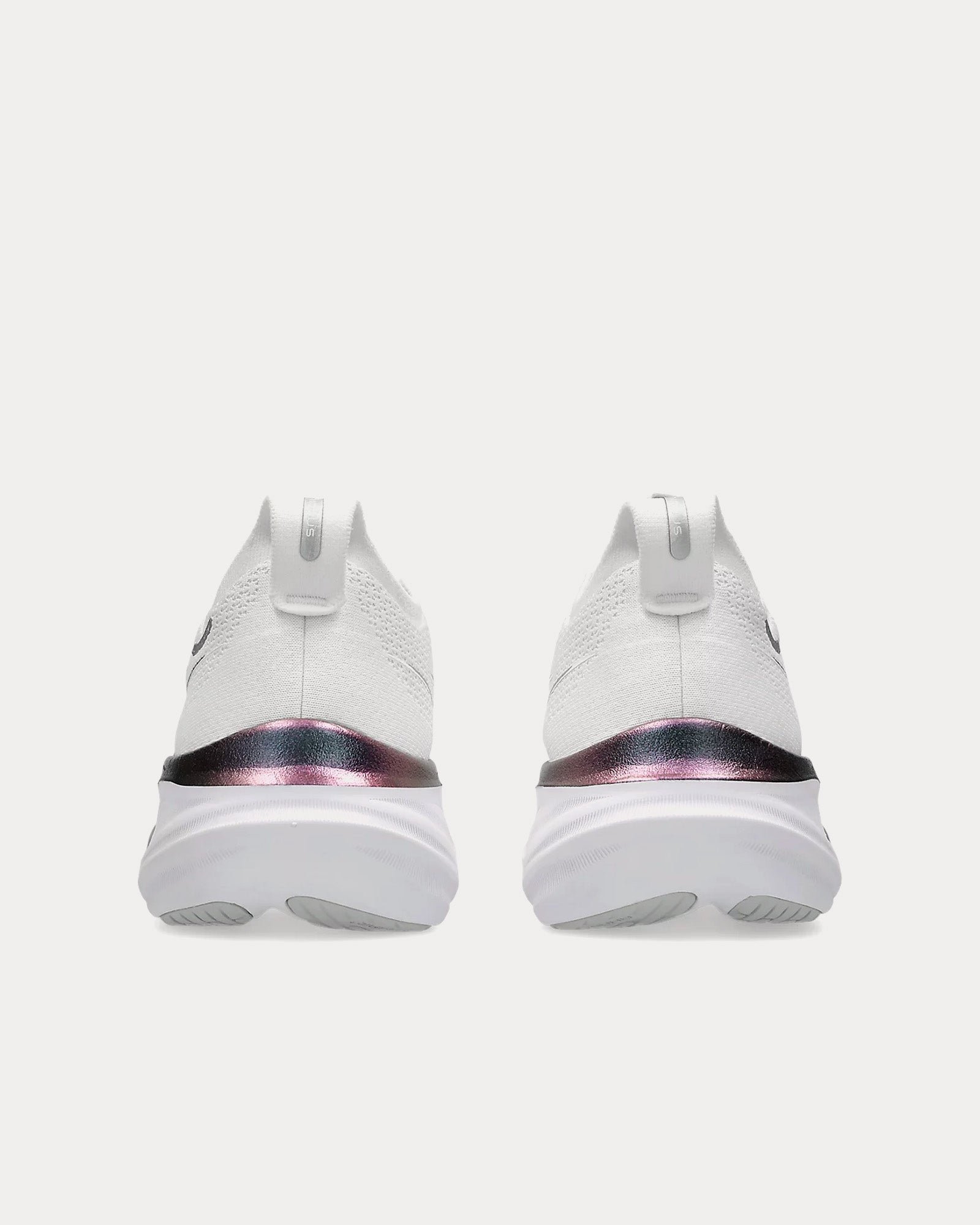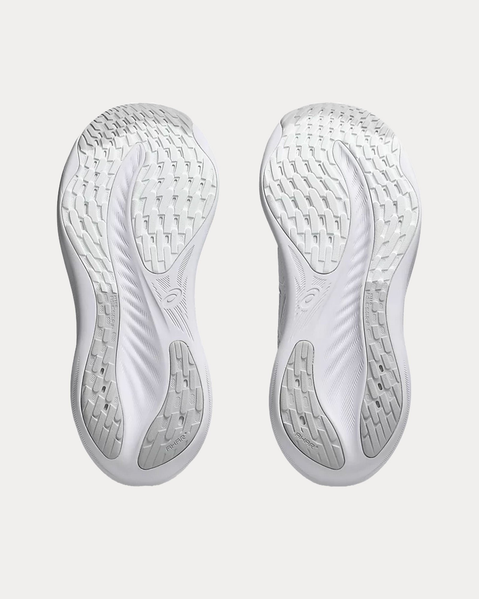 The women’s AsicsGel-Nimbus 26 Platinum running shoes in real white and pure silver feature engineered knit uppers with a sockliner that is produced with the solution dyeing process that reduces water usage and carbon emissions, PureGEL™ and FF BLAST™ PLUS ECO technology, and ASICSGRIP™ rubber outsoles.