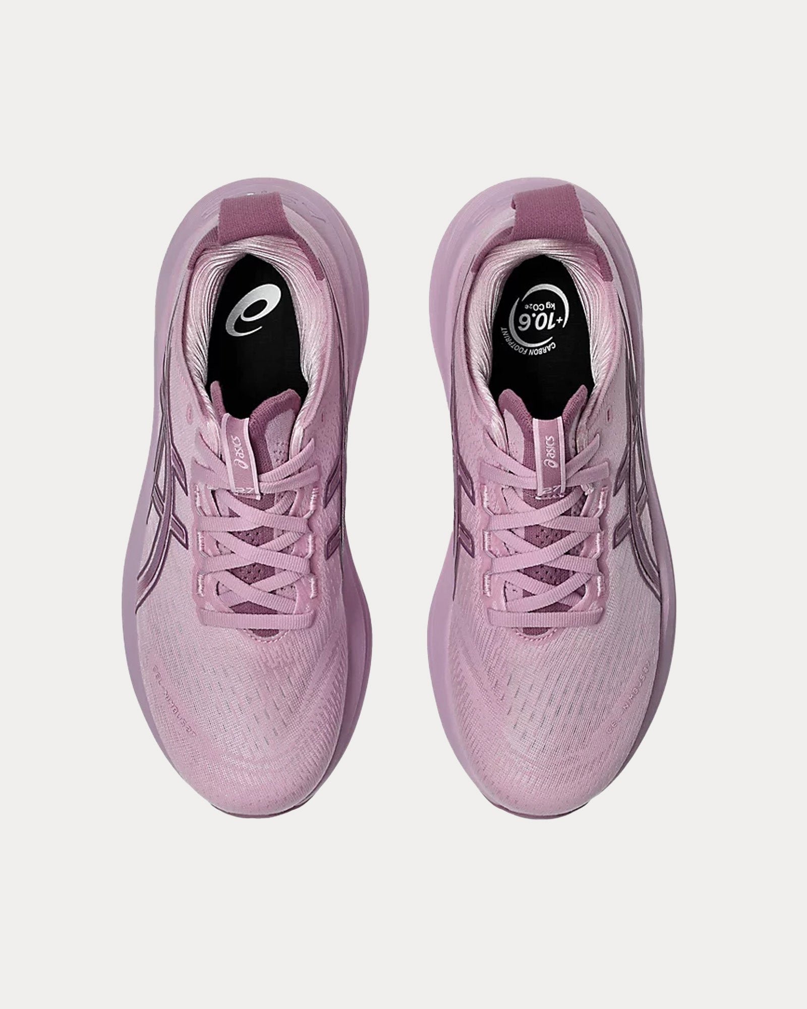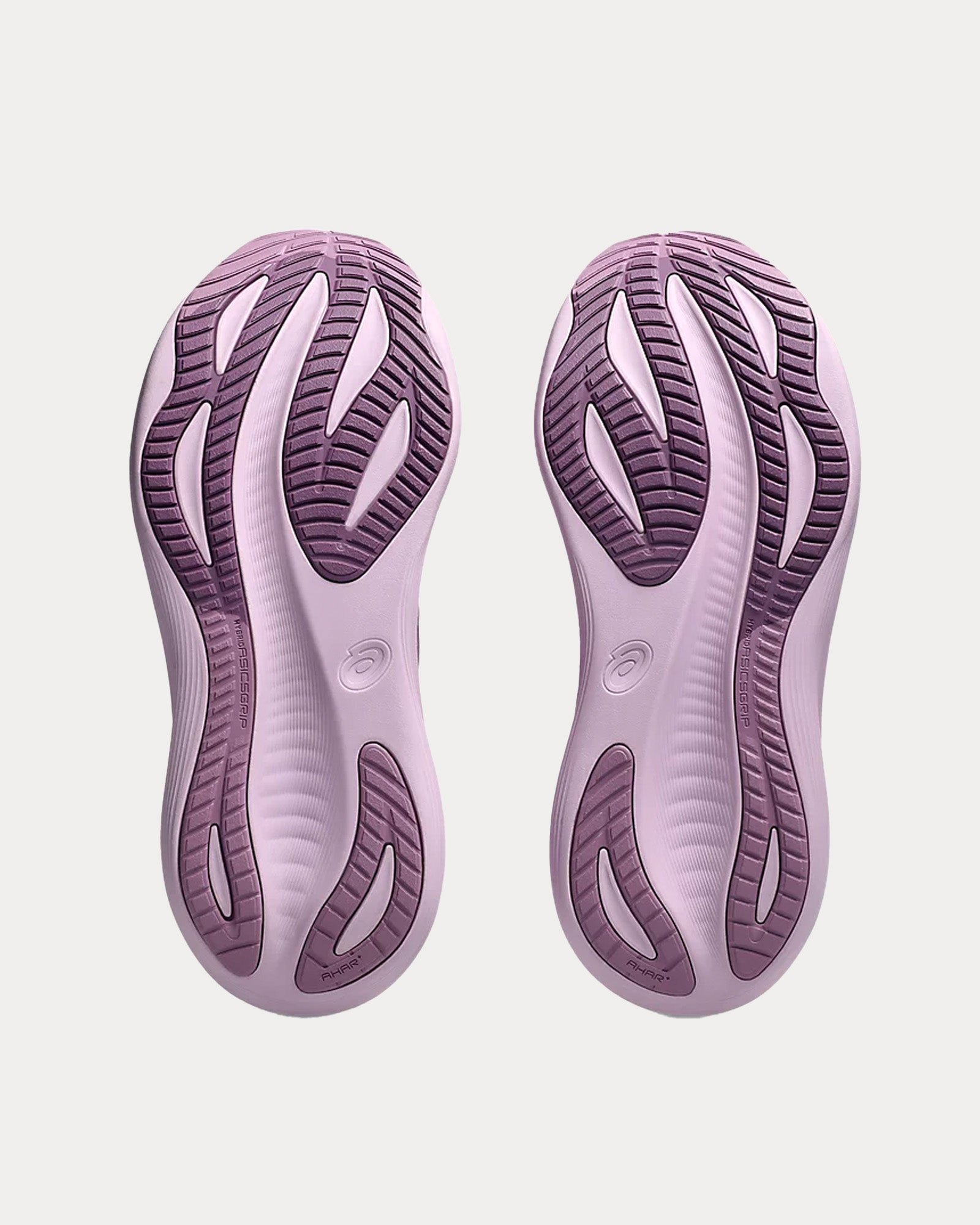 The women’s Asics Gel-Nimbus 27 running shoes in light ube and dark ube are designed for road running and feature soft engineered jacquard mesh uppers that comfortably wraps your foot while supplying advanced ventilation, knit tongue and collar to help provide a soft and supportive feel, FF BLAST™ PLUS ECO cushioning, and HYBRID ASICSGRIP™ rubber outsoles for better traction, improved softness, and advanced durability.