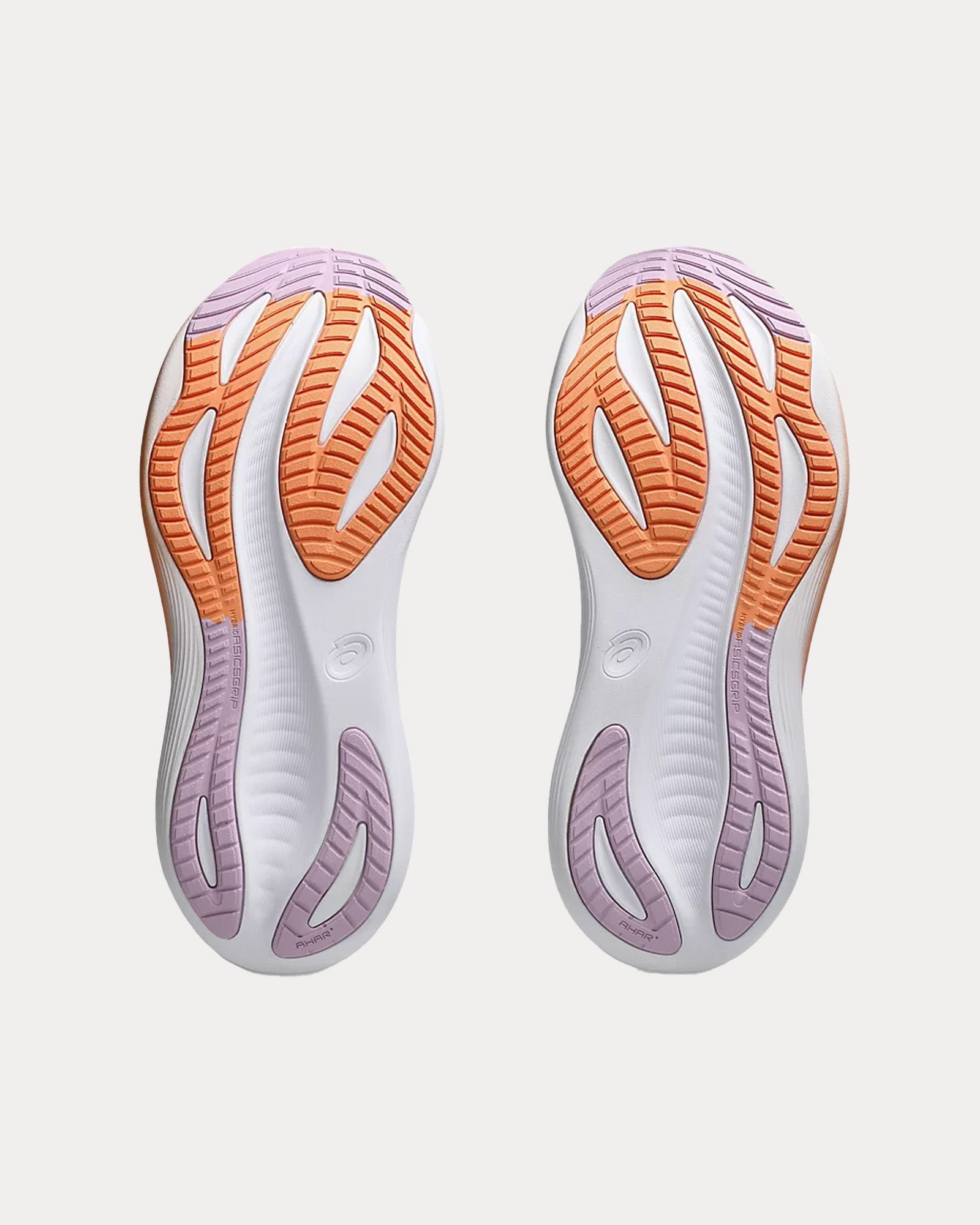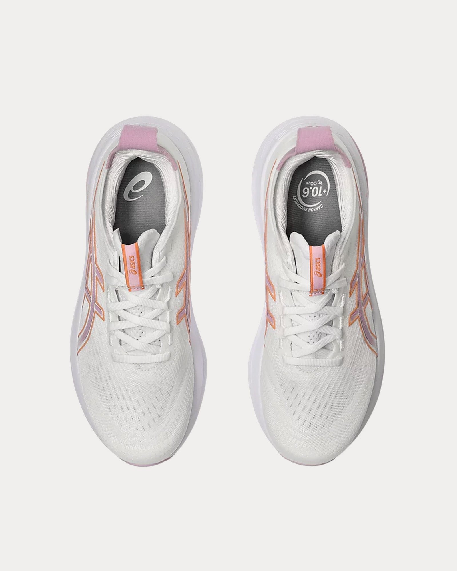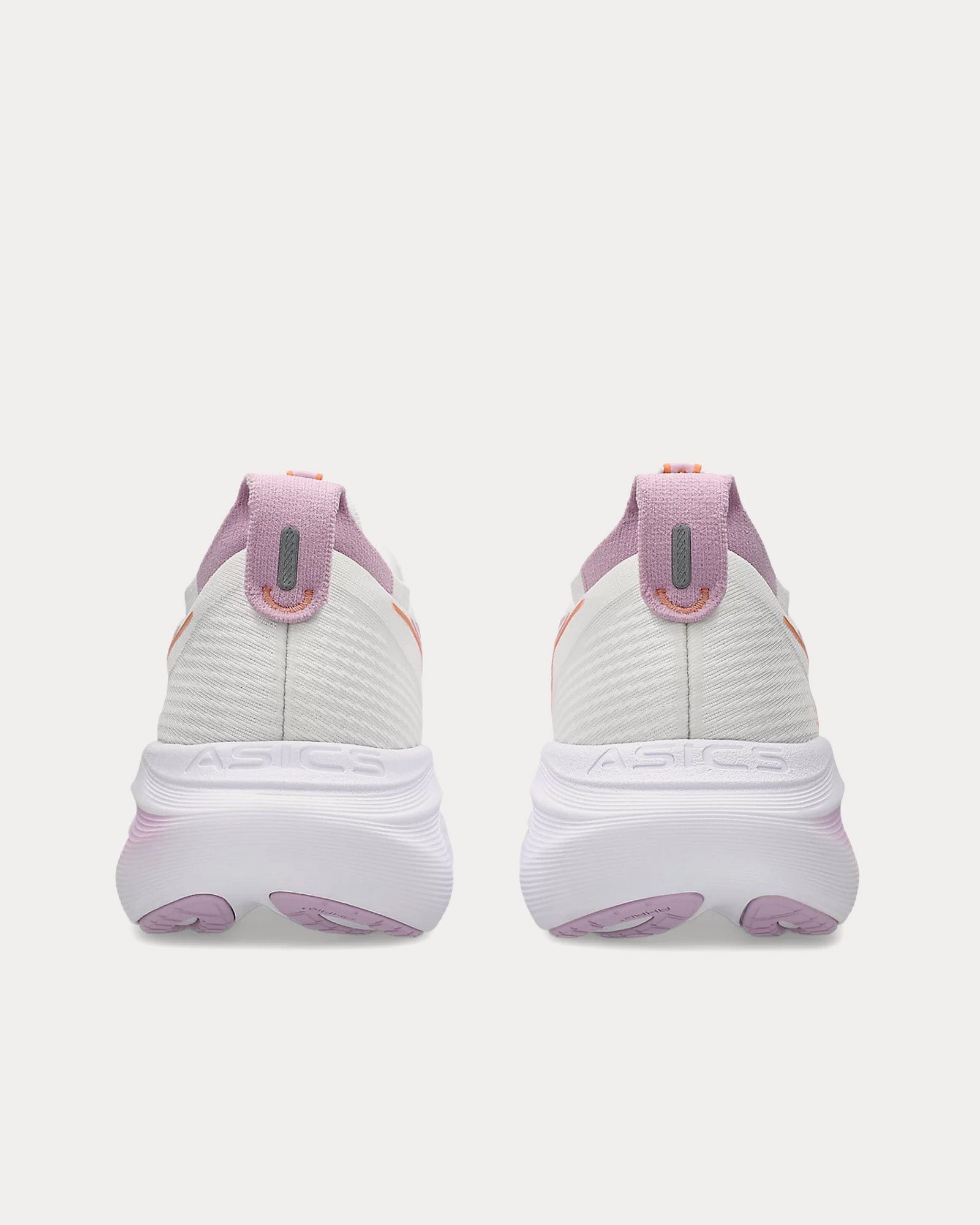 The women’s Asics Gel-Nimbus 27 running shoes in white and light ube are designed for road running and feature soft engineered jacquard mesh uppers that comfortably wraps your foot while supplying advanced ventilation, knit tongue and collar to help provide a soft and supportive feel, FF BLAST™ PLUS ECO cushioning, and HYBRID ASICSGRIP™ rubber outsoles for better traction, improved softness, and advanced durability.