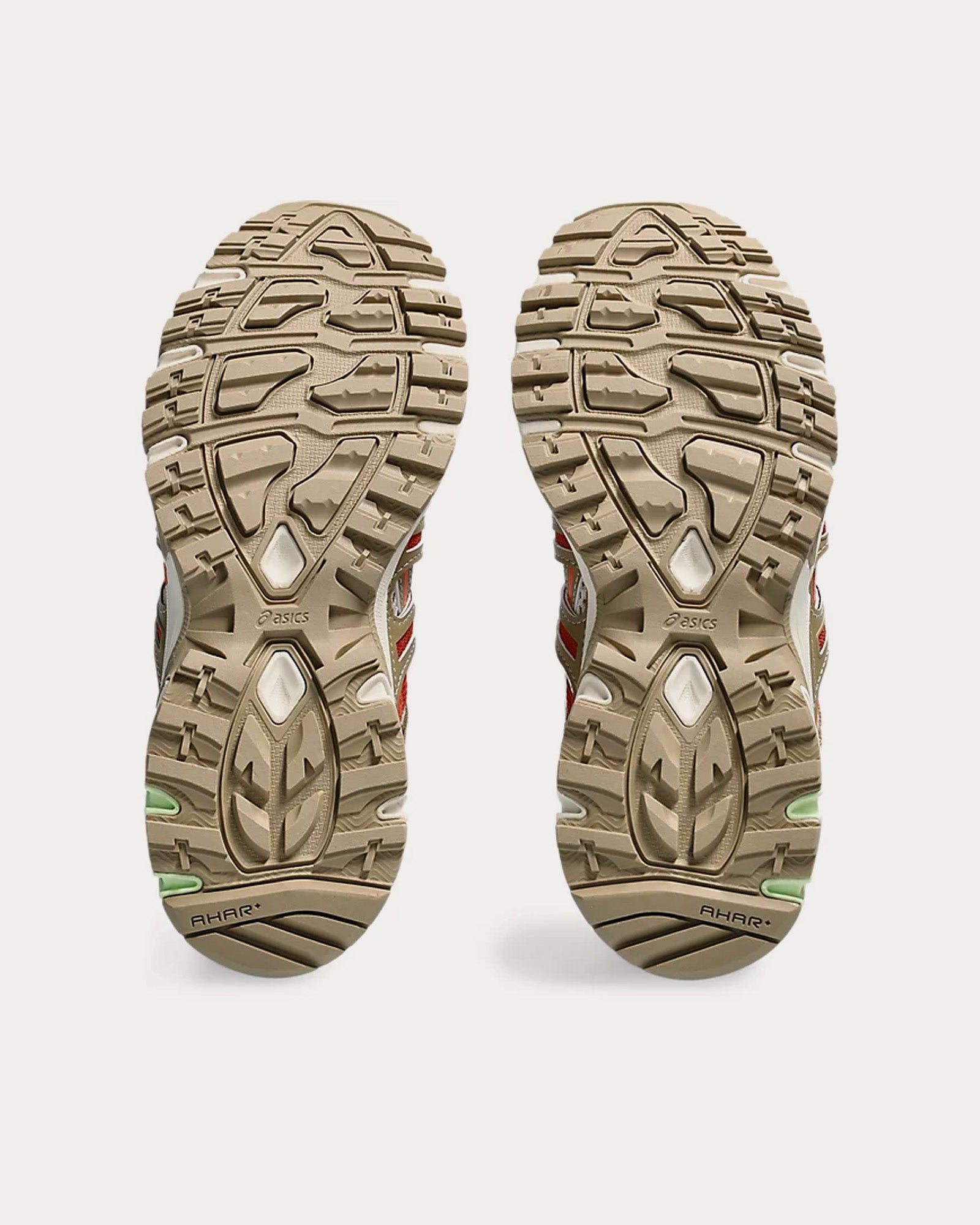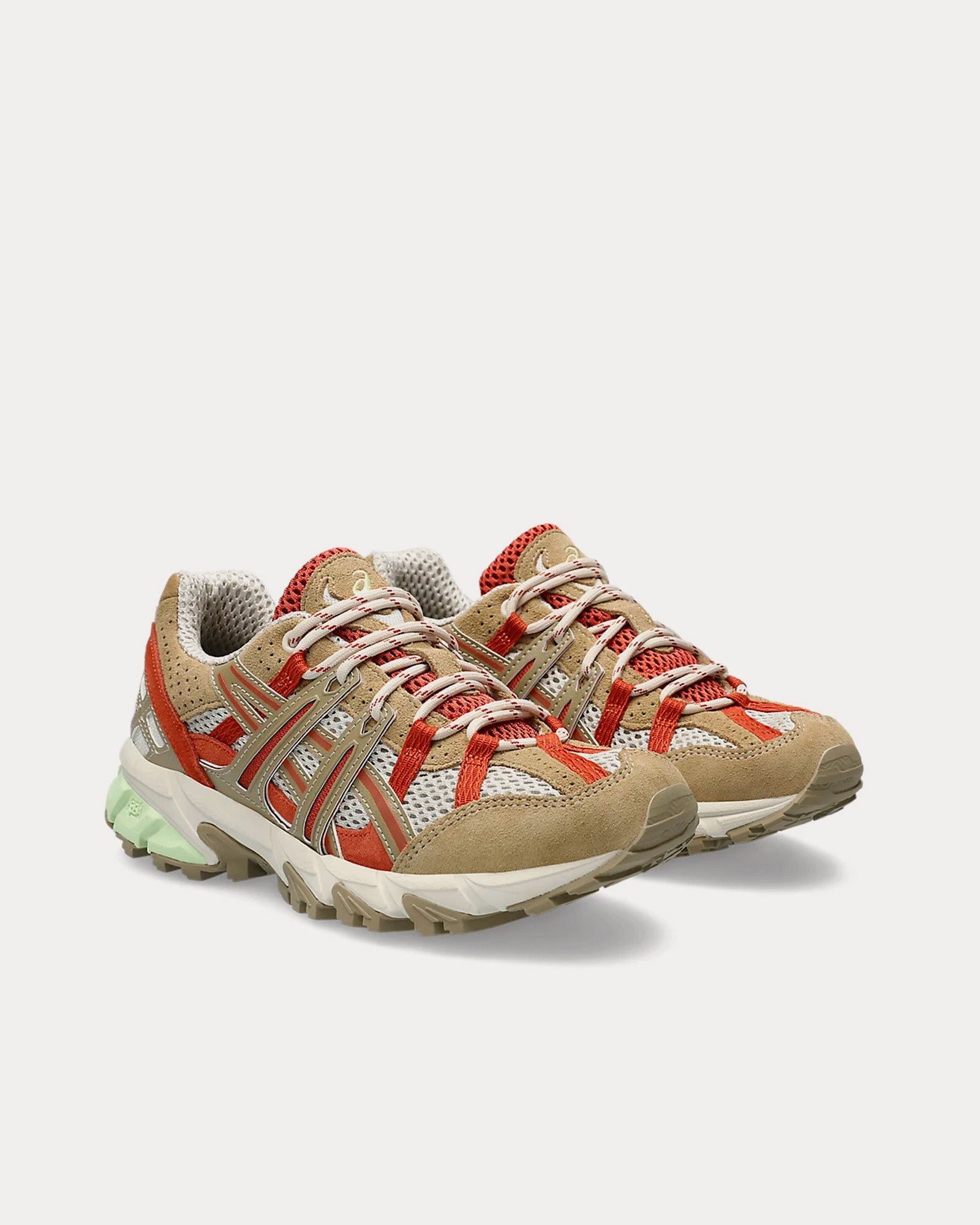 The women’s AsicsGel-Sonoma 15-50 low top sneakers in oatmeal and safari khaki are designed for everyday foot traffic to hiking rocky hillsides, with advanced cushioning and traction.