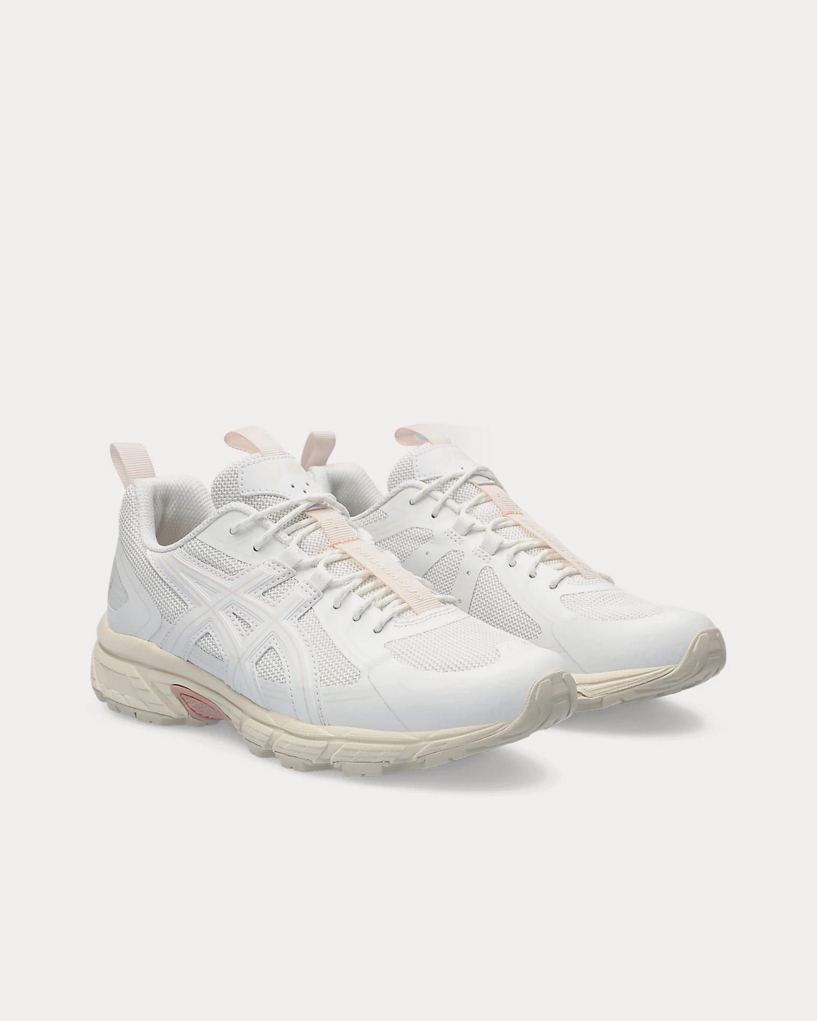 The women’s AsicsGel-Venture 6 NS low top sneakers in White and White are based on trail-running sportstyle designs and feature synthetic leather uppers, panels with targeted support, rearfoot GEL™ technology, and a trail-specific traction pattern.