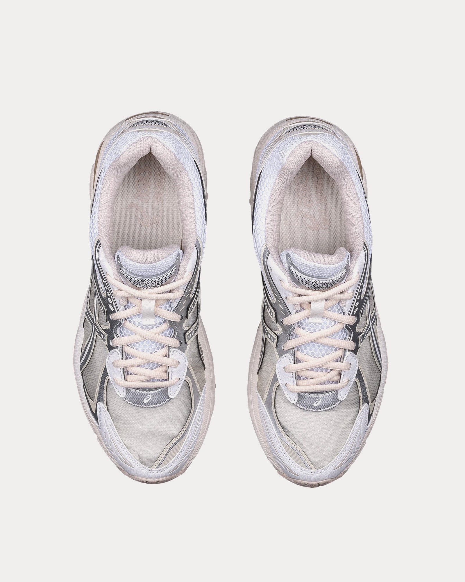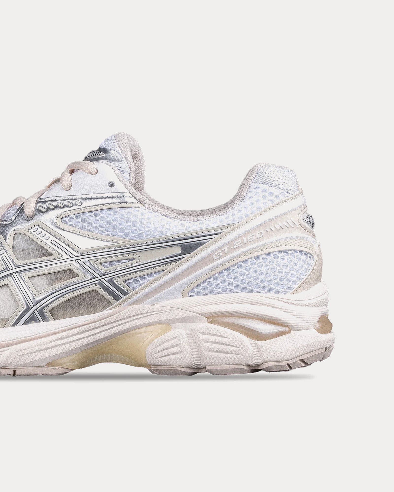 The unisex Asics x Above the CloudsGT-2160 low top sneakers in white and pure silver feature layered synthetic leather uppers, sleek aesthetic, and wavy forefoot sculpting.