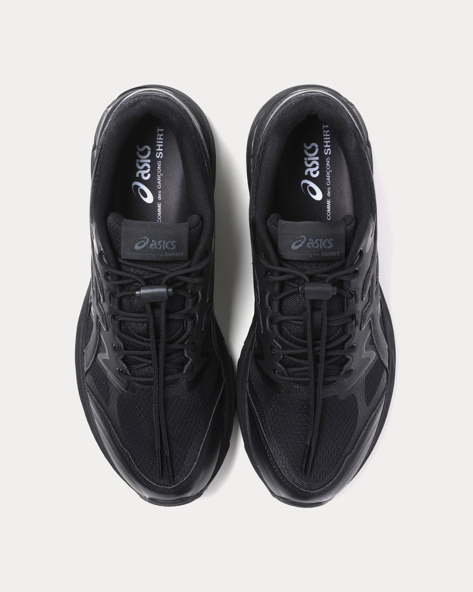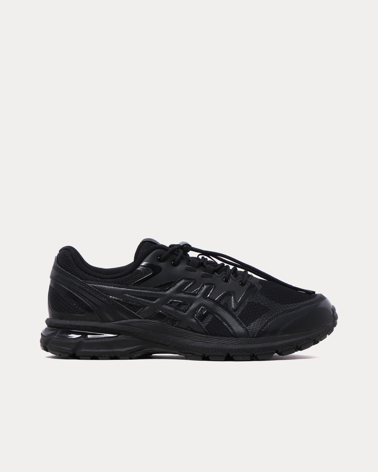 The unisex Asics x COMME des GARÇONS SHIRTGel-Terrain low top sneakers in black are based on trail-running sportstyle designs and feature synthetic leather uppers, panels with targeted support, rearfoot GEL™ technology, and a trail-specific traction pattern.