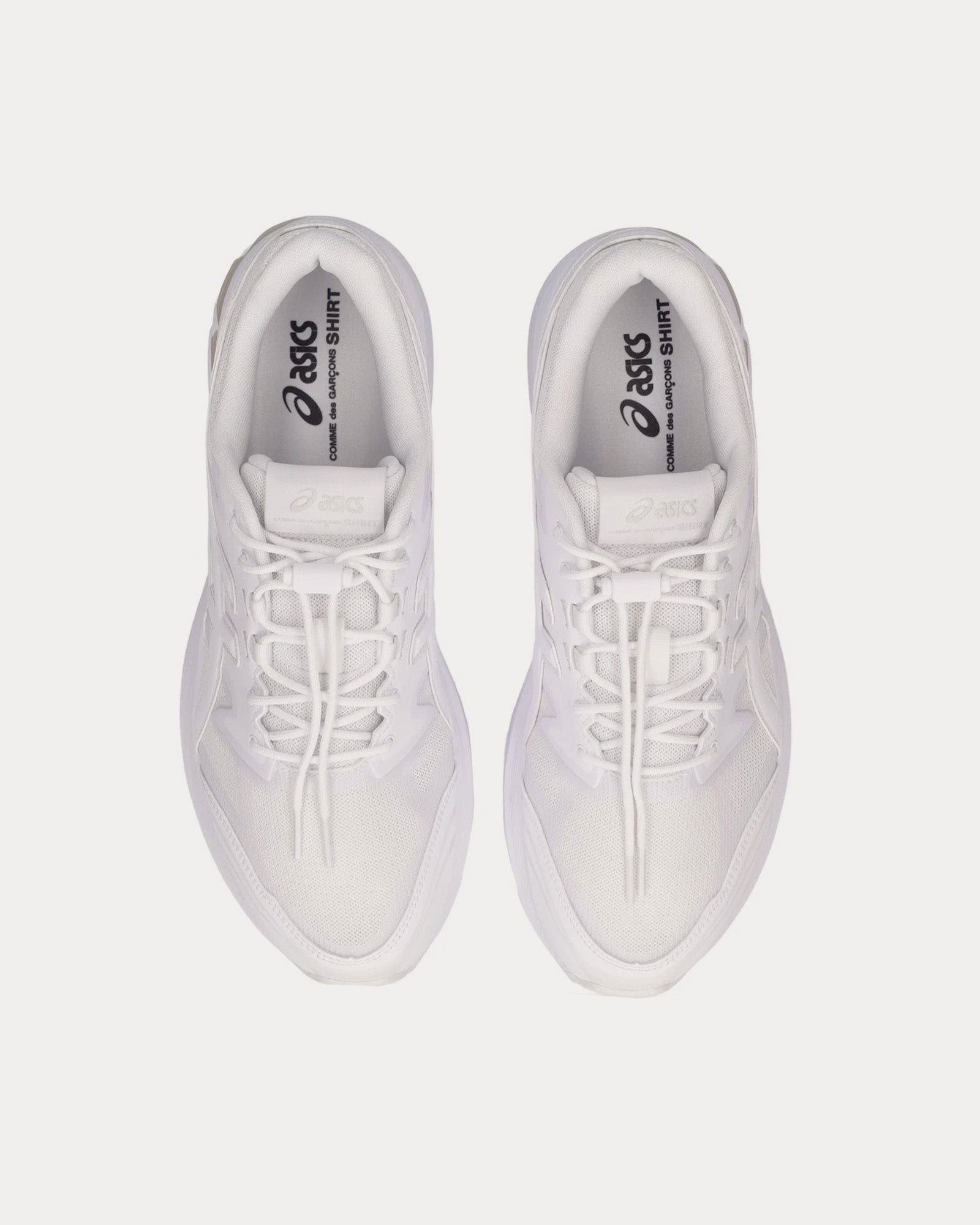 The unisex Asics x COMME des GARÇONS SHIRTGel-Terrain low top sneakers in white are based on trail-running sportstyle designs and feature synthetic leather uppers, panels with targeted support, rearfoot GEL™ technology, and a trail-specific traction pattern.