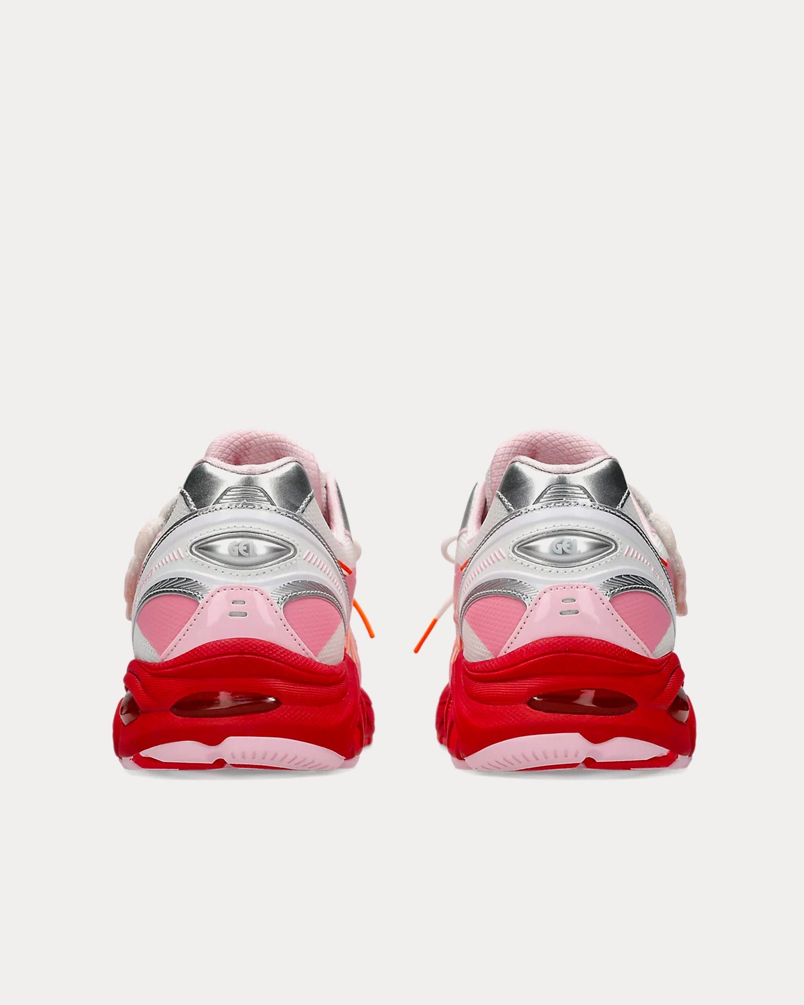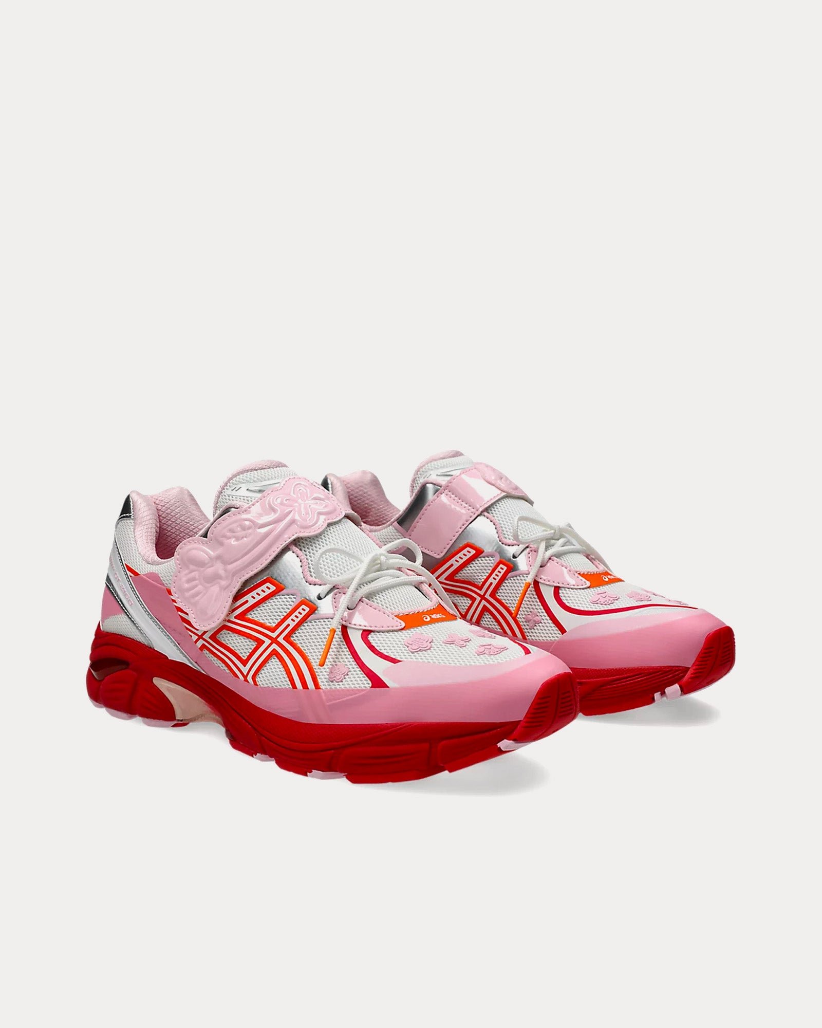 The unisex Asics x Cecilie BahnsenGT-2160 low top sneakers in white and habanero feature intricate couture detailing and technical function, 2000’s era upper design with recognizable lines, and silver overlays upon an innovative mesh base, and ASICS’ GEL technology enhances the midsole for an optimal wearing experience.