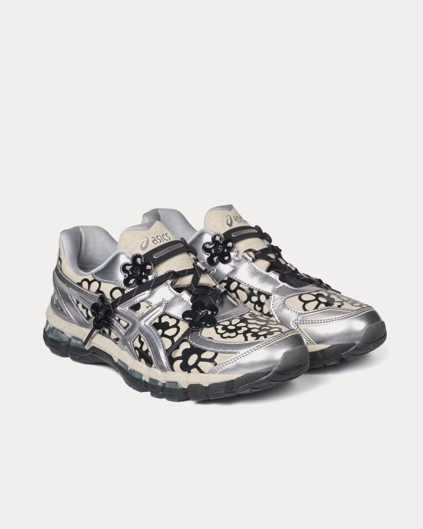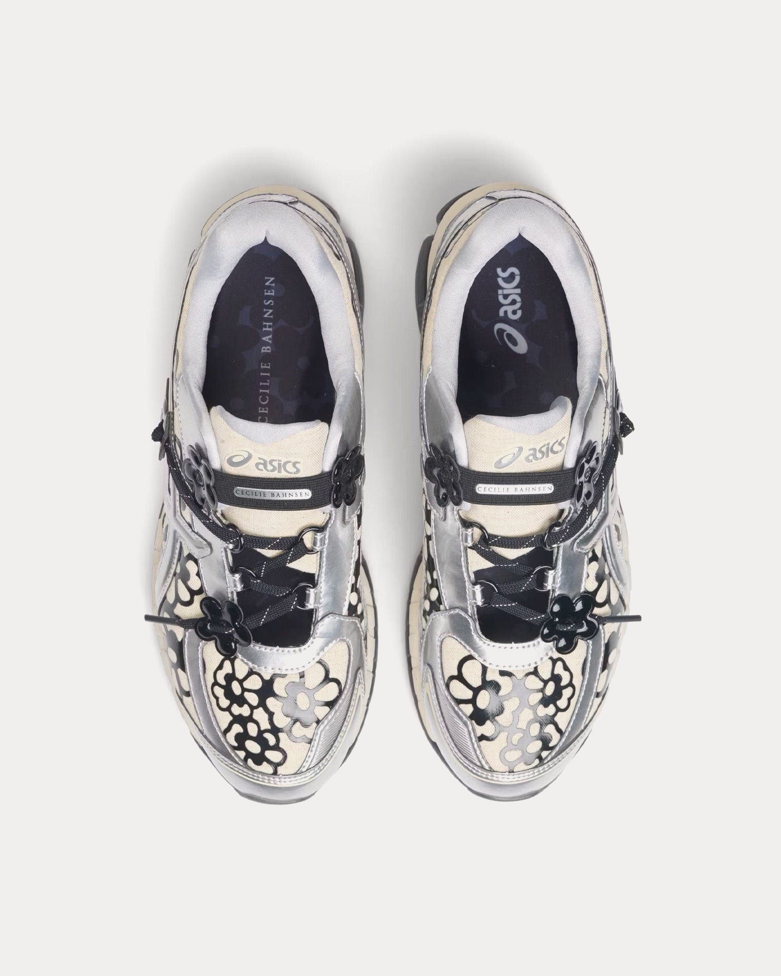 The women’s Asics x Cecilie Bahnsen Gel-Kayano 20 low top sneakers in Vanilla and Pure Silver merge high-fashion femininity with technical performance in a poetic reimagining of ASICS heritage. Continuing Bahnsen’s reinterpretation of the Mary Jane silhouette, this design introduces sculptural detailing with a half-tongue construction and a delicate 3D floral ‘cage’ formed from her signature flower motif.