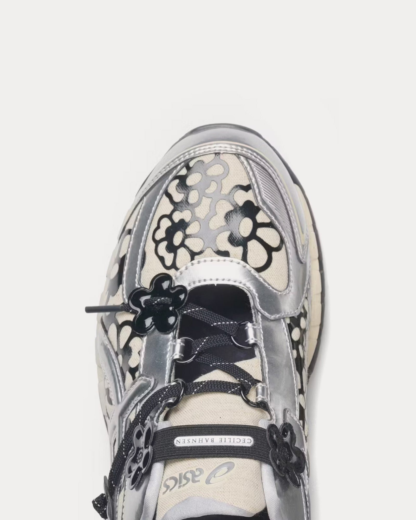 The vanilla-toned upper evokes the natural look of linen, layered with contrasting glossy black floral no-sew overlays and shimmering silver accents. ASICS’ iconic Stripes and reflective threads further the interplay of exposure and concealment, creating a harmonious balance of softness and structure. A blend of sport and couture, the design speaks to Bahnsen’s signature aesthetic—elegant, layered, and full of contrast.