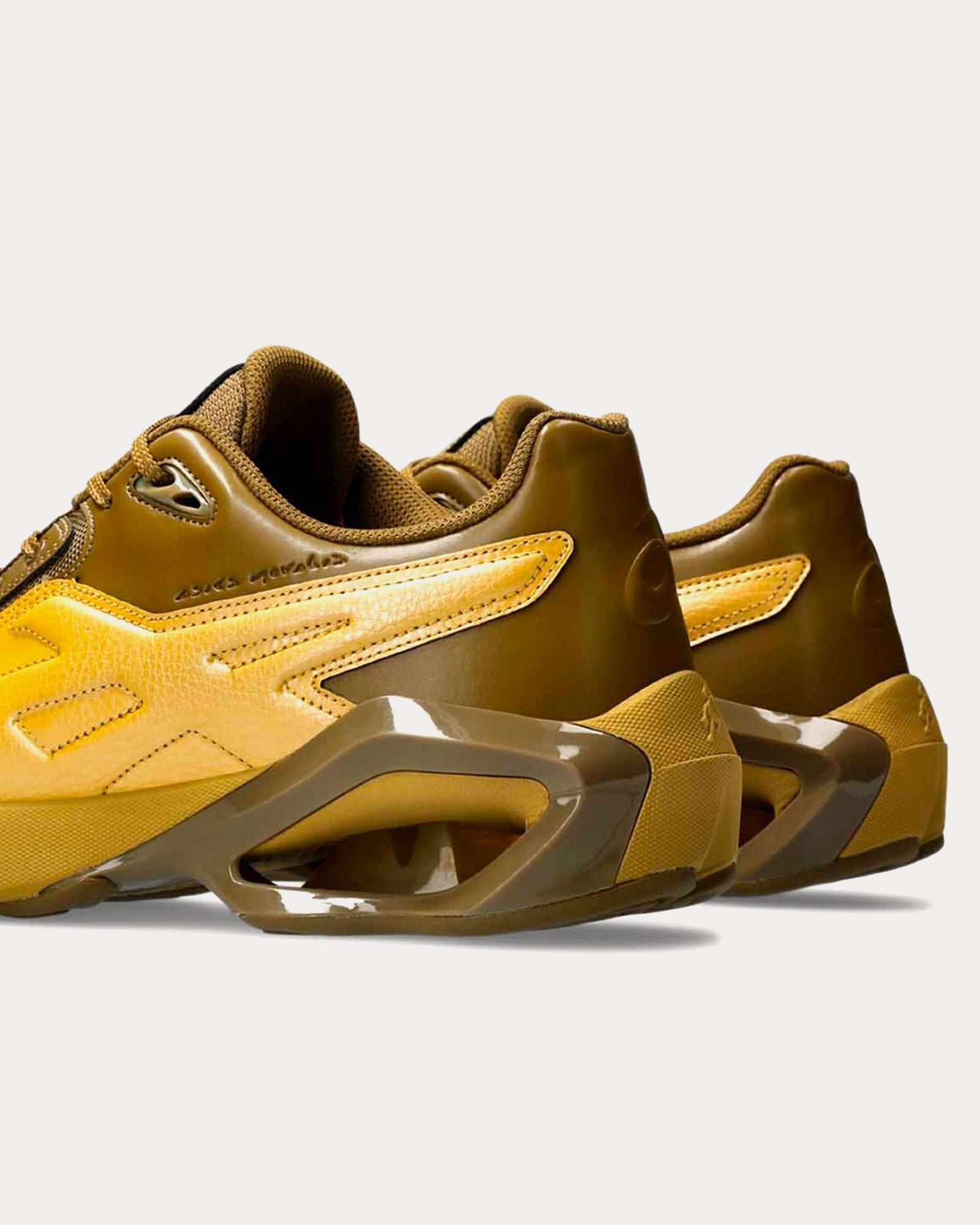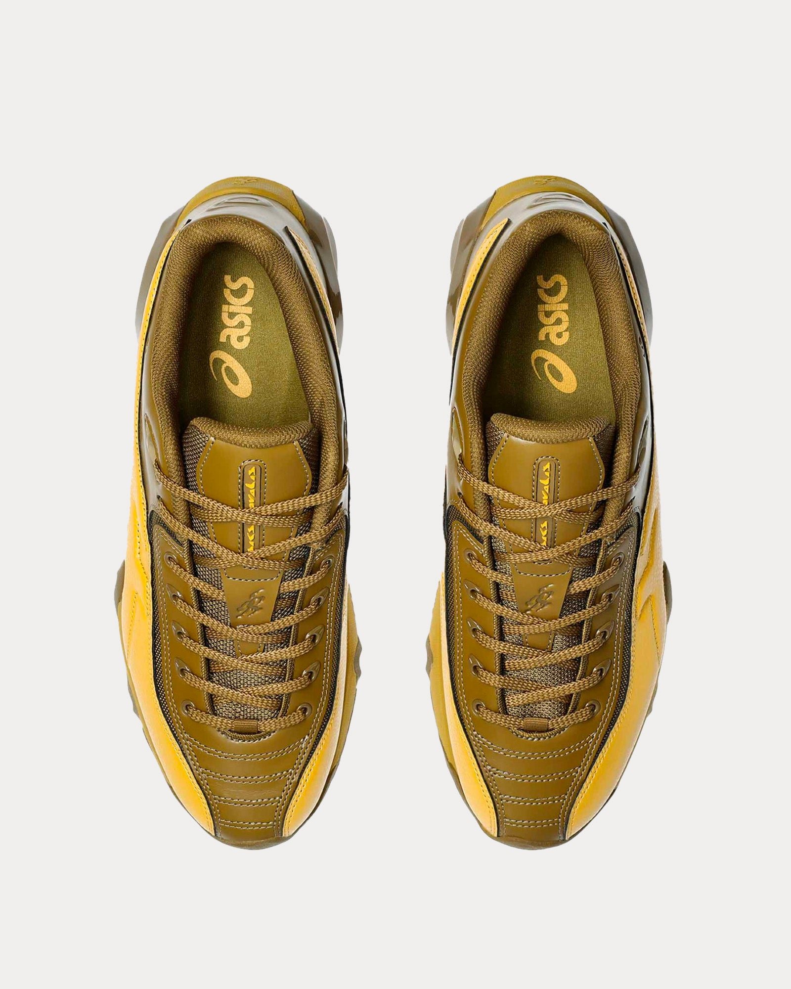 The unisex Asics x KikoKostadinovGel-Teremoa Novalis low top sneakers in medallion yellow and honey feature heel “Zone GEL” unit, new cushioning GEL construction, fore foot GEL unit with rubber wrap up for cushioning and stability comfort, and FF Blast+ Bounce cushion Foam.