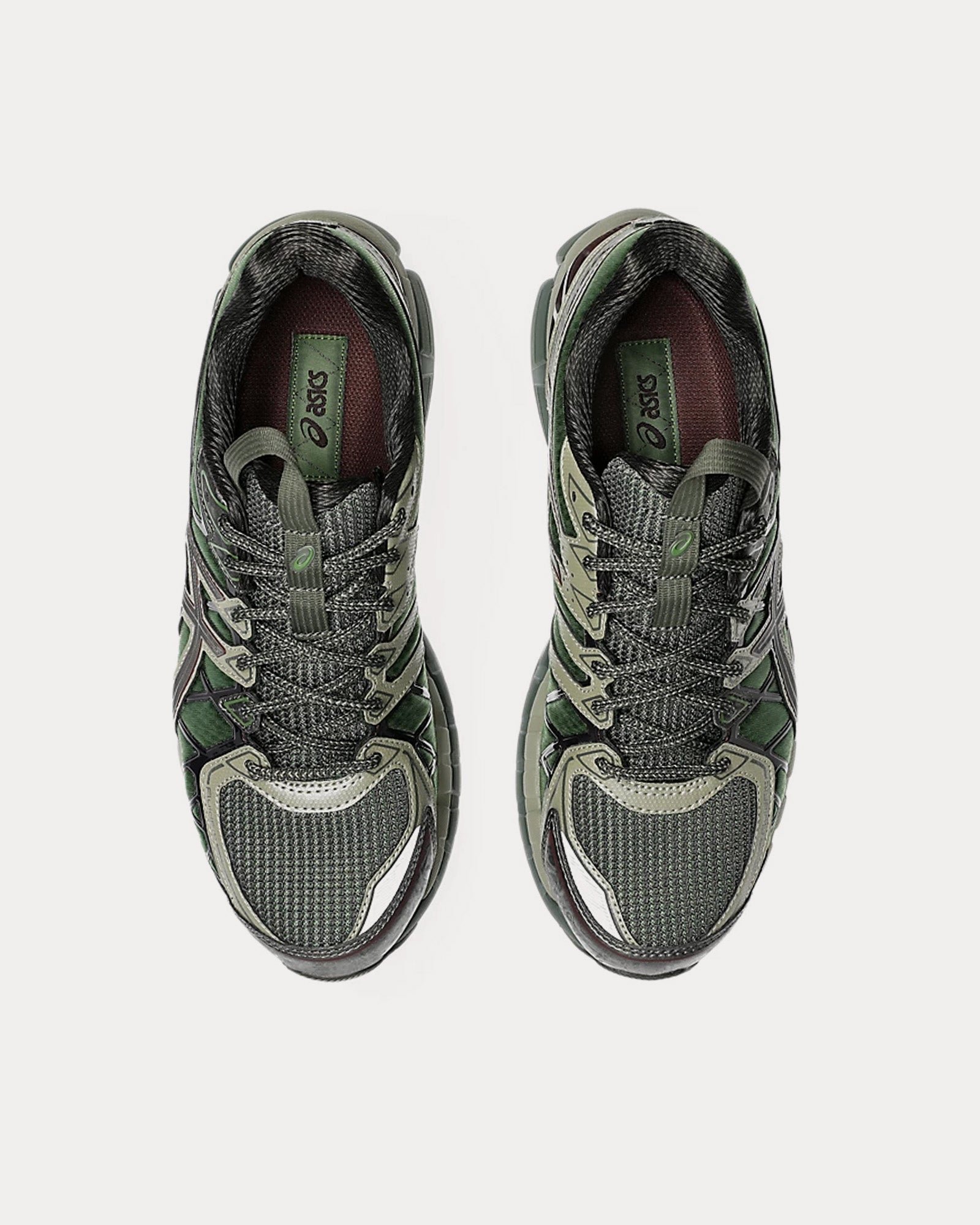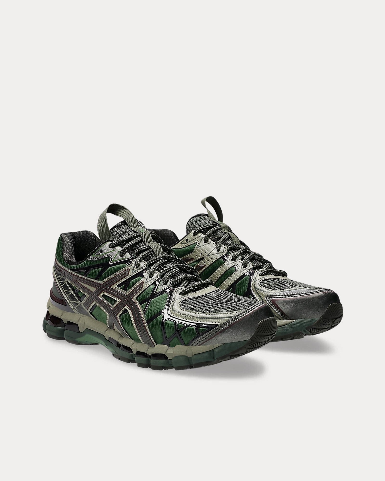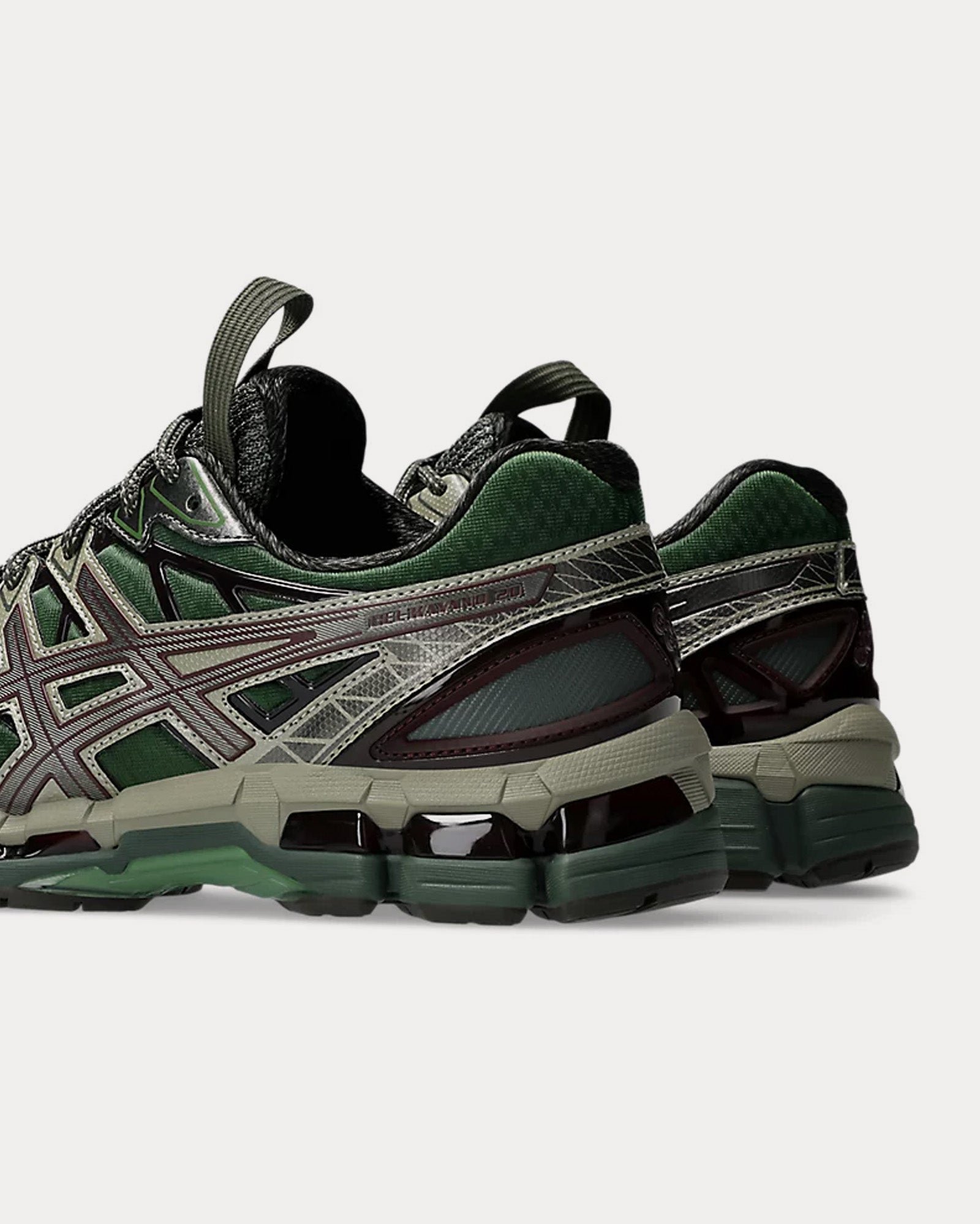 The unisex Asics x Kiko Kostadinov UB10-S Gel-Kayano 20 low top sneakers in Moss and Gunmetal are a striking fusion of conceptual design and performance, curated by Kiko Kostadinov Studio in collaboration with the ASICS® SportStyle development team. Inspired by découpage and natural simulacrum, the design explores the imprint of nature and the transformation of discarded objects in natural landscapes.