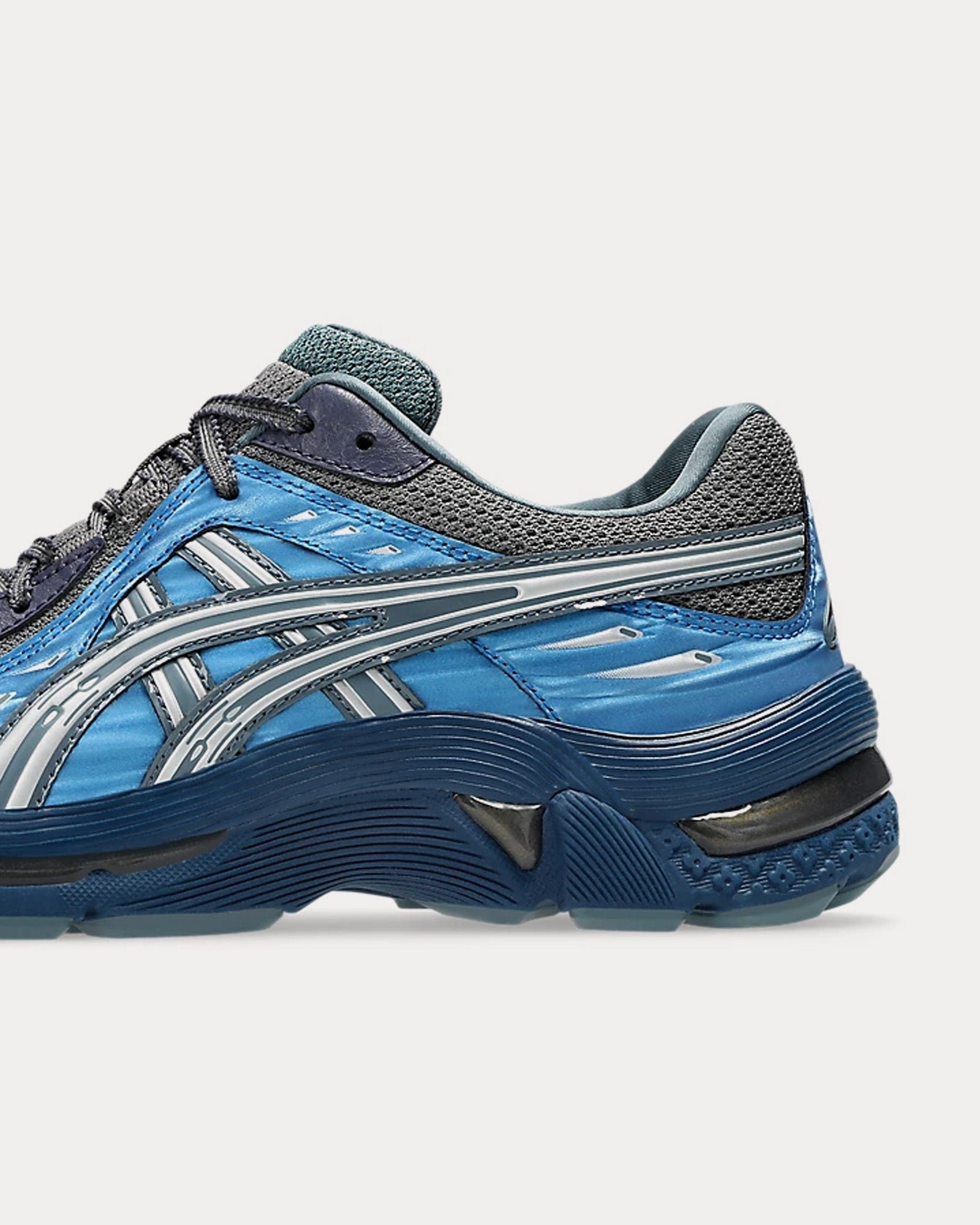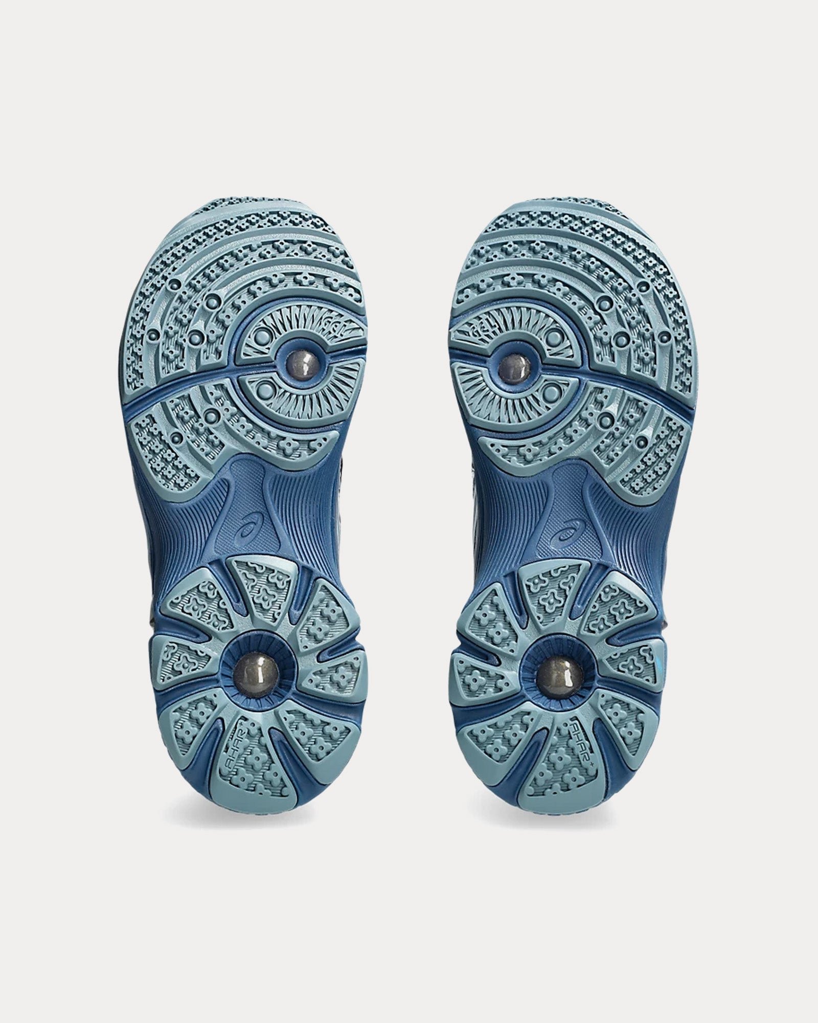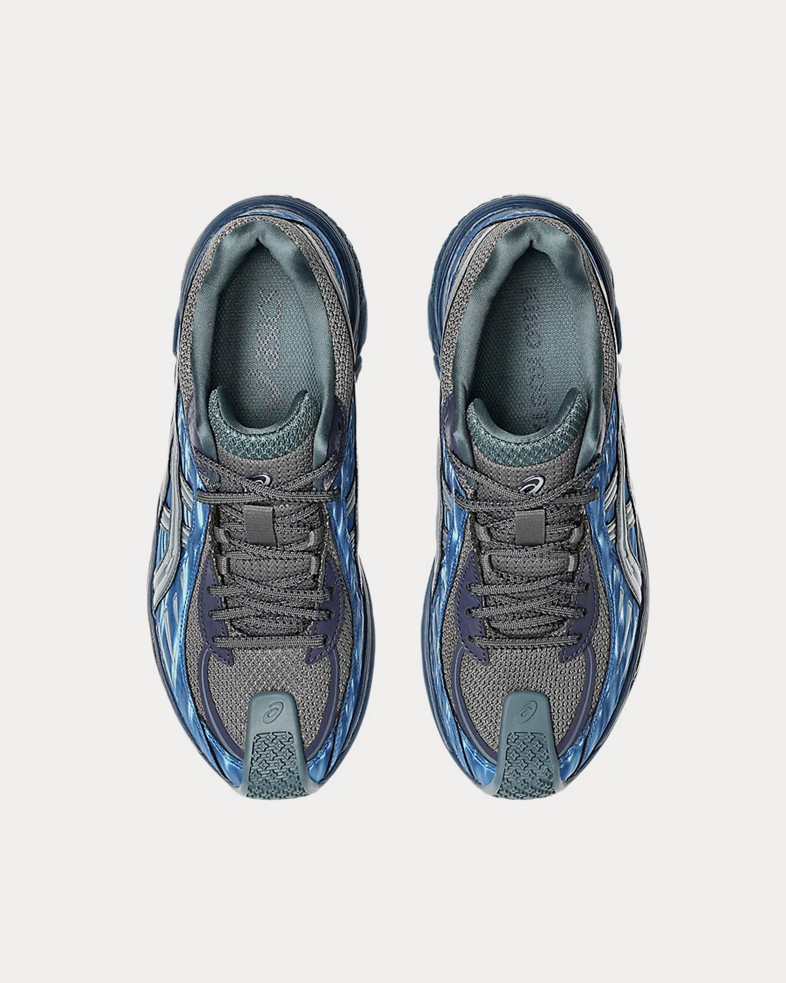 The women’s Kiko KostadinovGel-Flammae low top sneakers in blue and ironclad feature synthetic leather uppers, rubber toe caps decorated with a floral traction pattern, FLYTEFOAM PROPEL, a material with excellent resilience, and GEL technology midsoles for a comfortable fit.