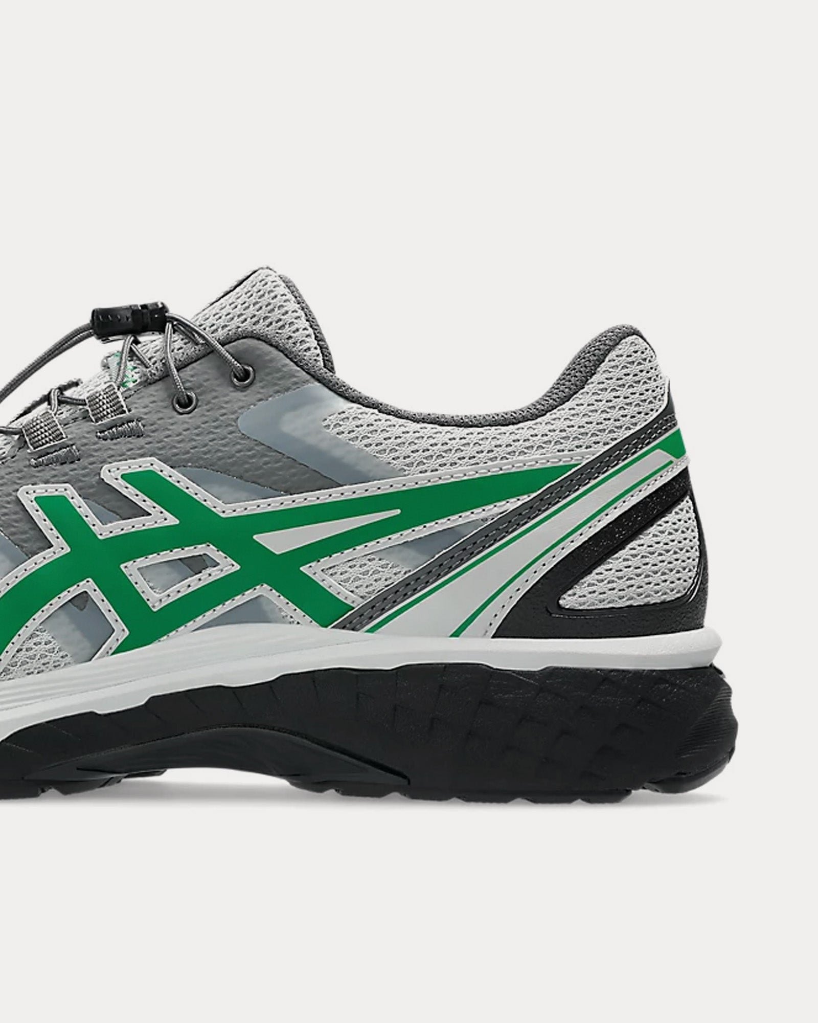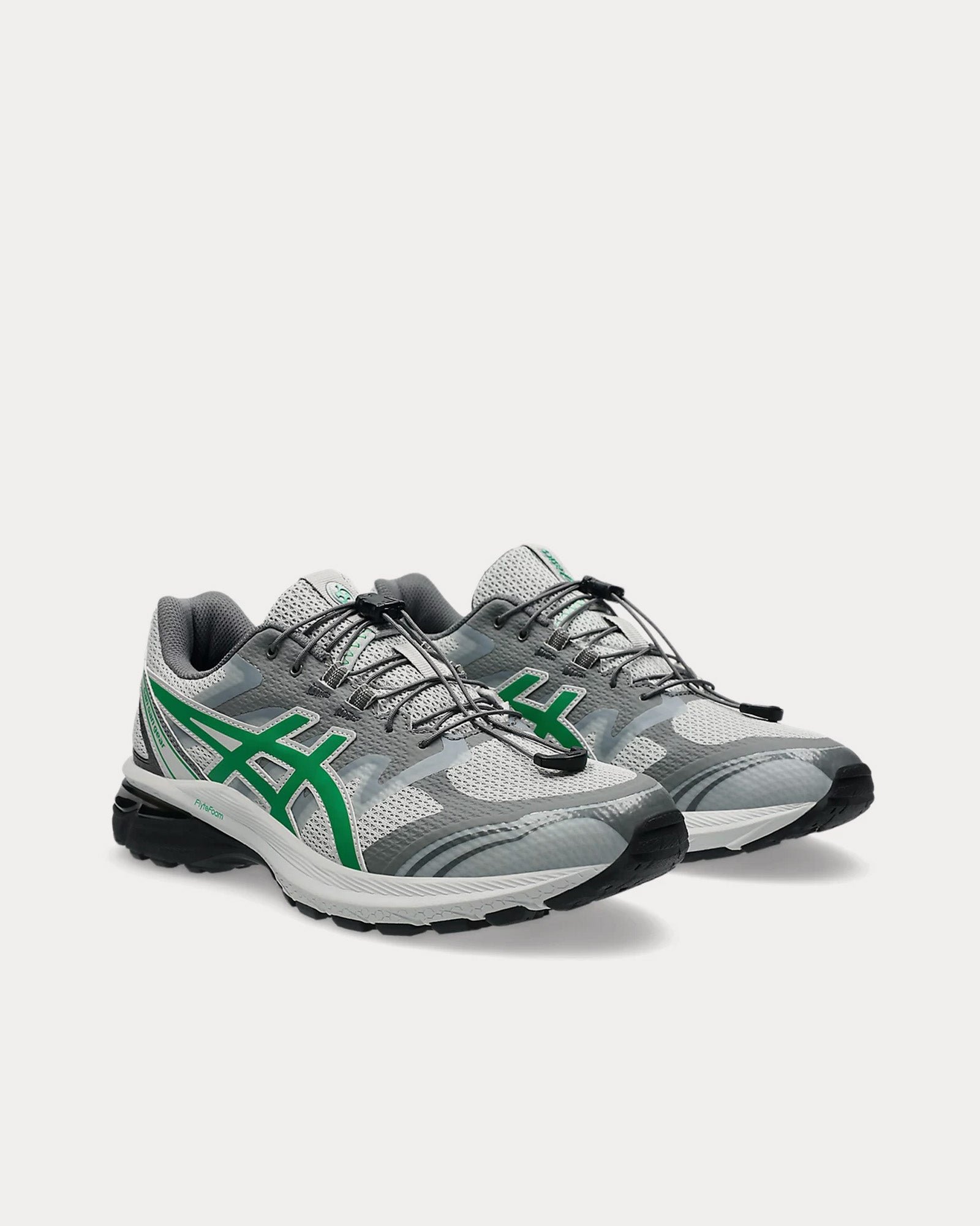 The unisex Asics x San San GearGel-Terrain low top sneakers in grey violet and jolly green are based on trail-running sportstyle designs and feature a speed lacing system, synthetic leather uppers, panels with targeted support, rearfoot GEL™ technology, and a trail-specific traction pattern.