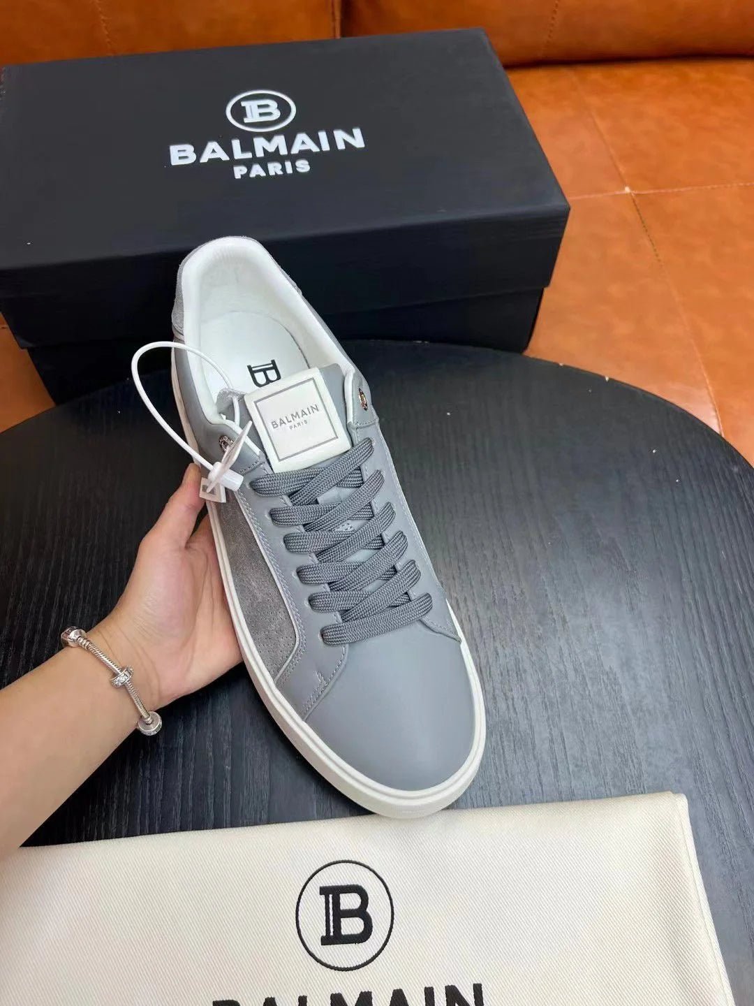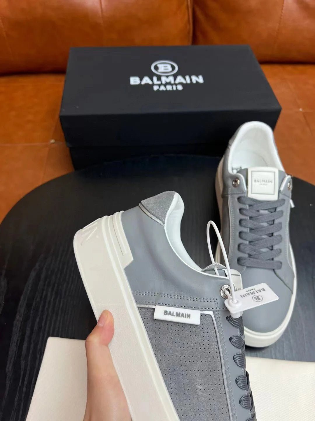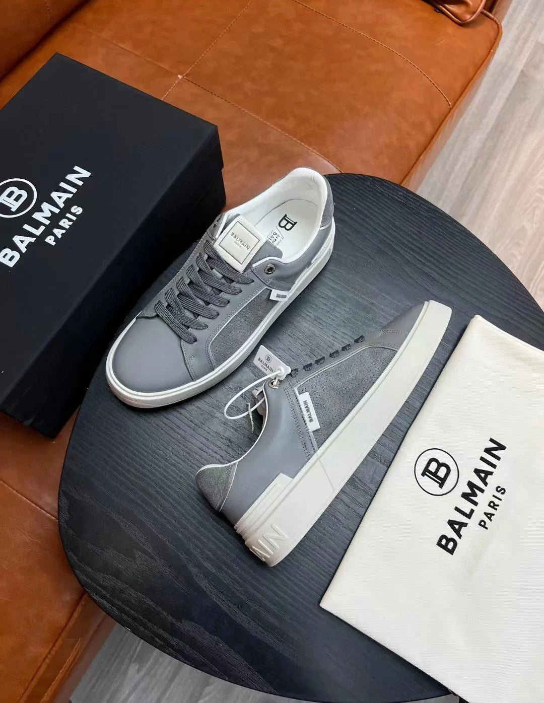 BALMAIN || Baskets basses grises « B-Court » à patch logo